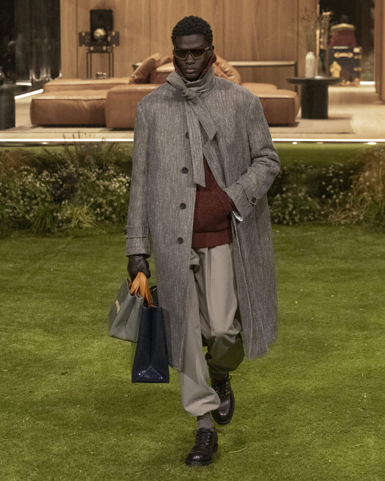 Here, utility informed even the most luxurious of pieces. This could be seen in how looks were styled: handsome suit jackets paired with gorpcore waterproof combats, for instance. But the magic truly lies in the actual garment construction. Tailoring, cut from traditional houndstooth and herringbones, were woven with reflective technical yarns. Elsewhere, coats and shirts could be bent and sculpted to the wearer’s desired fit thanks to aluminium wiring being threaded through their interiors.