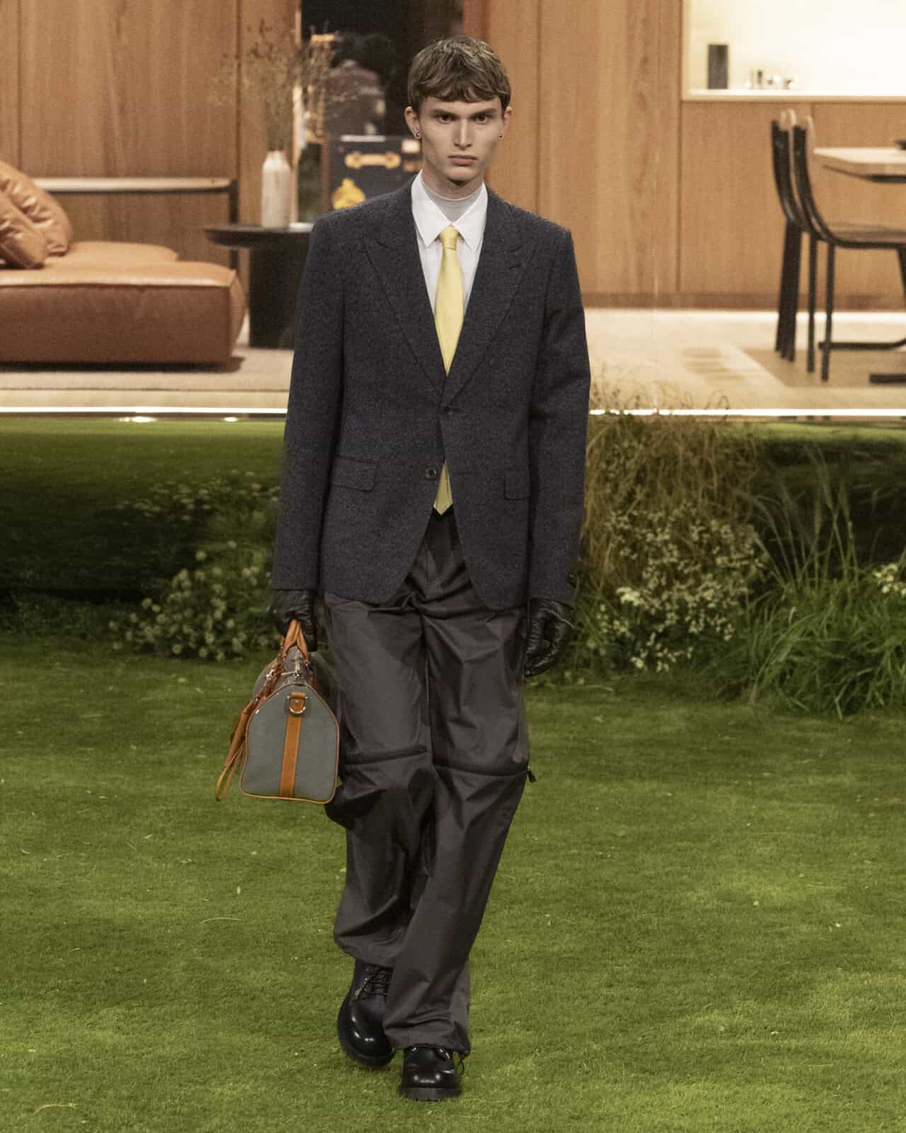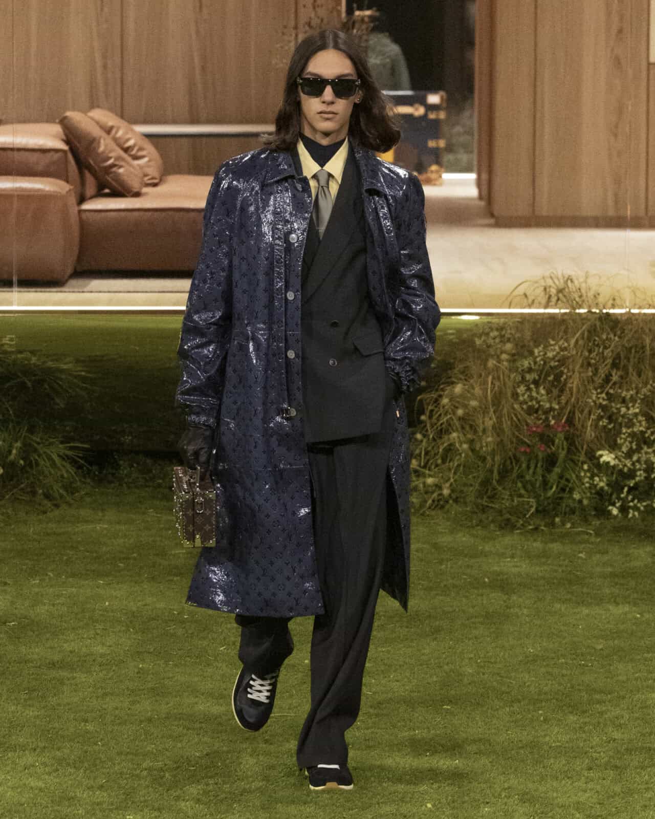 The technical wizardry didn’t stop there. Shell jackets were thermo-adaptive, while hand-embroidered crystal embellishment gave the appearance that shirts and coats were sprinkled with rain droplets. Pharrell built on his silhouettes of seasons past, like slim trousers that kick out into a flared hem and cropped bombers. Accessories had a retro-futuristic look to them – where bags were shaped like telephones and boomboxes, or the likes of the P9 Speedy, here equipped with a glow-in-the-dark version of the LV monogram. In Pharrell’s hands, the look of tomorrow is shaped by elegant innovation.