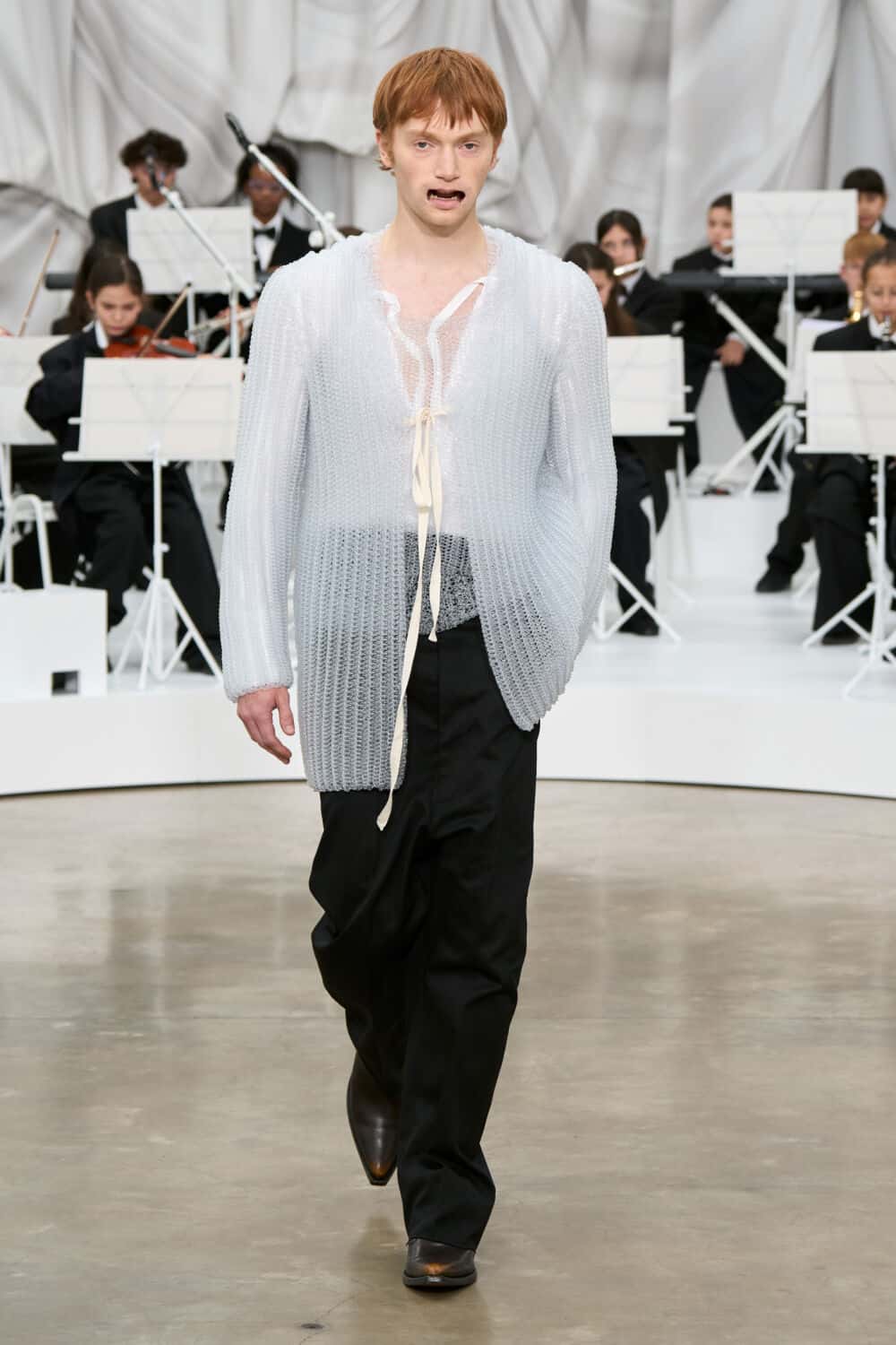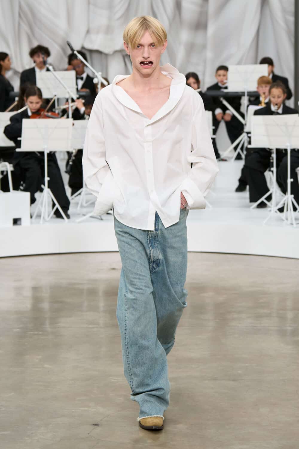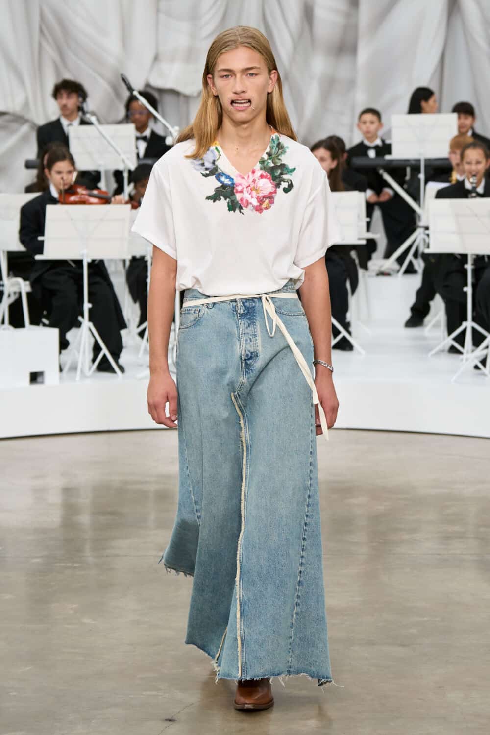 Speaking of silhouette, he elongated it, with drop crotches so low on jeans and tailoring that trousers almost looked like skirts.