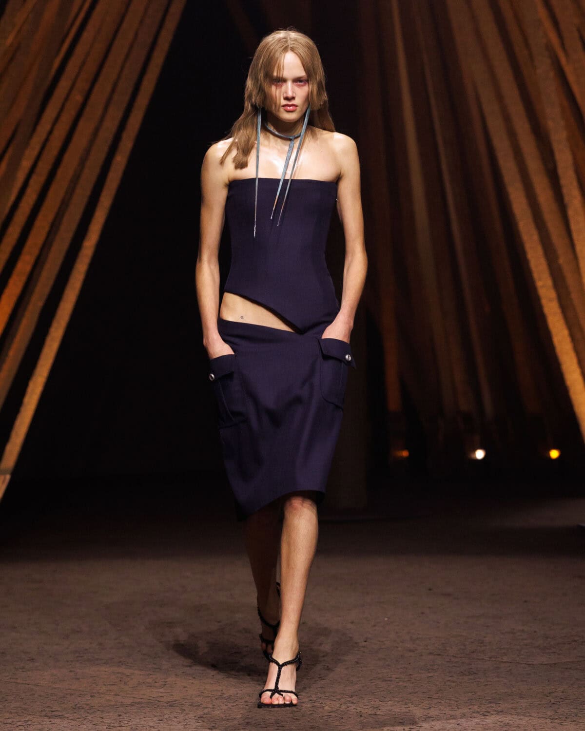 There was a feral look to his models, who came with smudged charcoal eyes and tufted hair, as if they’d been frolicking in woodlands. McGirr had been inspired by Robin Hardy’s The Wicker Man, a tale that follows a police man swept up in ancient pagan rituals. The show set resembled a maypole made from atural foliage and cork. Models circled the giant structure in military jackets, some of which were chopped into micro-mini skirts or warped into twisted frocks with ruffled, handkerchief hemlines. There was a sinister sensuality present throughout. Sharp tailoring came tattered at the hem and leather dresses were slashed to expose the body from beneath. McQueen die-hards will also be delighted by the return of the bumster incorporated into cigarette trousers, shredded jeans and kinky pencil skirts.