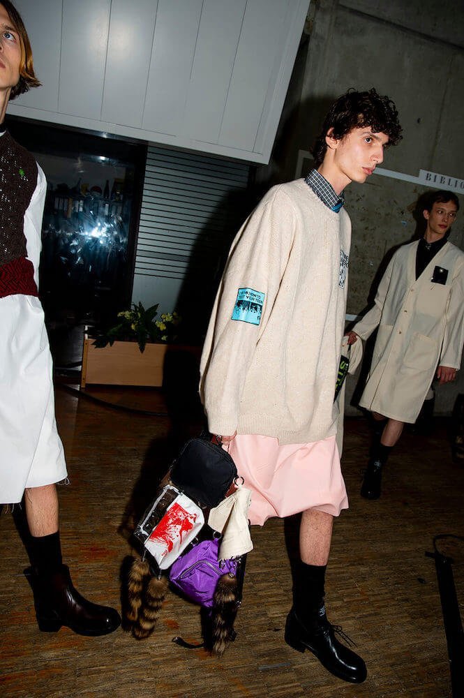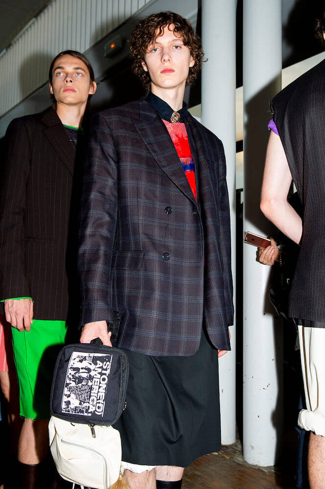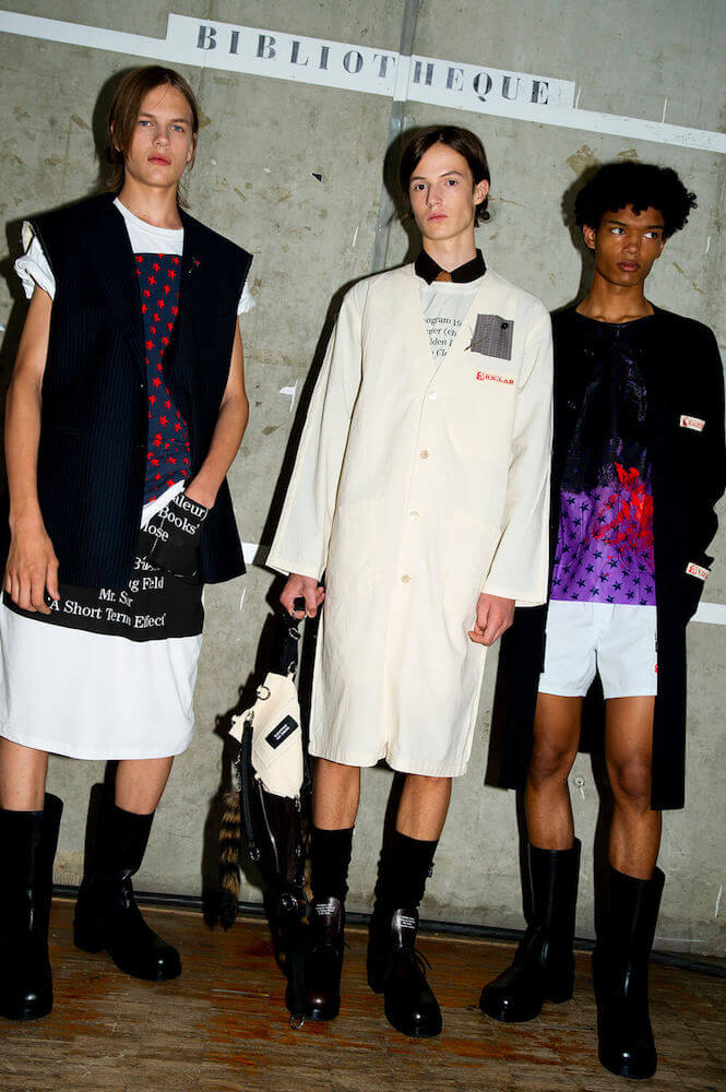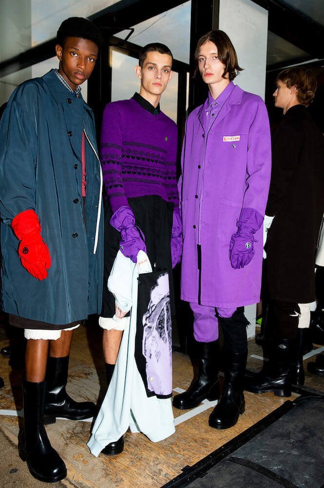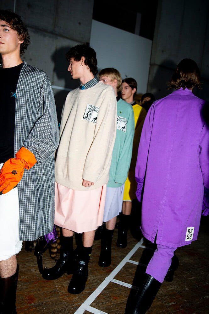 The venue, on the outskirts of Paris, a huge warehouse space, was laid with a lilac carpet and our seats were wrapped in shiny black plastic. Unnerving and oddly dressed, Simons’ lanky boys wore layered t-shirts plastered with multi-colour paint-drags. A green triangle and a horse logo was the marque of R&S Records – the Belgian label behind the techno-acid fusion genre of New Beat and a huge sound in clubs across Europe in the late 1980s. Lab coats, of sorts, came worm under and over and back-to-front and styled with long-sleeved tees with smilies on; some boys wore checked shorts. Tunics with rolled up trousers underneath were worn with rubber lab wellies. Was Simons hinting at some kind of secretive opioid lab look? All of it was odd. And very good. A stamped ‘how to text your teen’ laid over other glitchy graphic tees spoke of a families split down the middle.