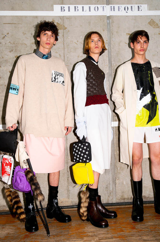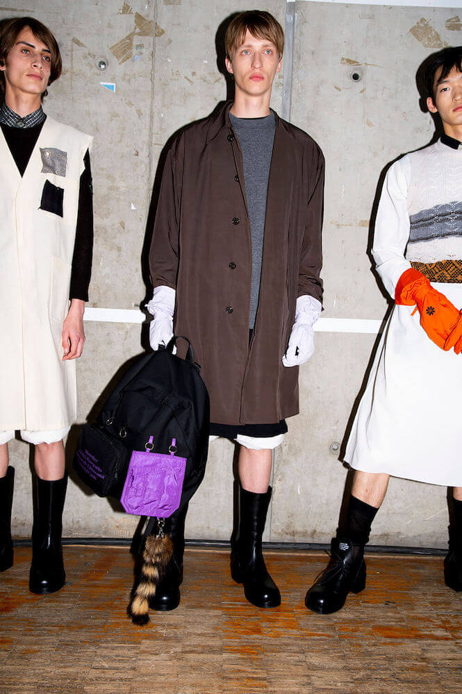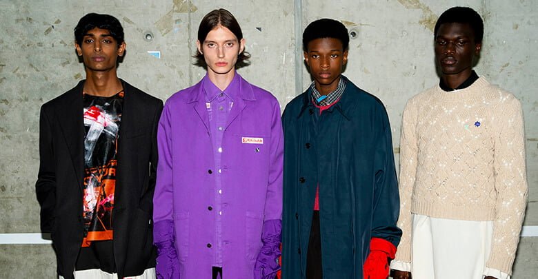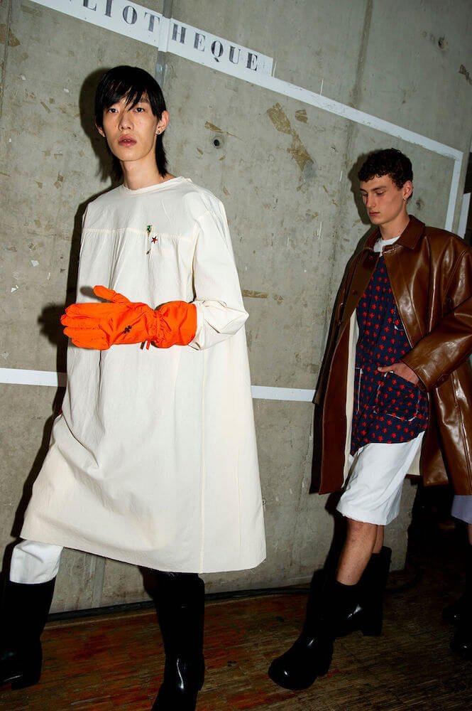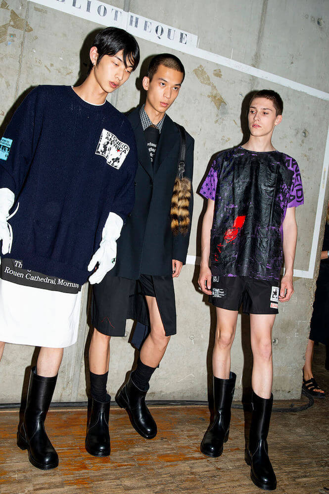 The venue, on the outskirts of Paris, a huge warehouse space, was laid with a lilac carpet and our seats were wrapped in shiny black plastic. Unnerving and oddly dressed, Simons’ lanky boys wore layered t-shirts plastered with multi-colour paint-drags. A green triangle and a horse logo was the marque of R&S Records – the Belgian label behind the techno-acid fusion genre of New Beat and a huge sound in clubs across Europe in the late 1980s. Lab coats, of sorts, came worm under and over and back-to-front and styled with long-sleeved tees with smilies on; some boys wore checked shorts. Tunics with rolled up trousers underneath were worn with rubber lab wellies. Was Simons hinting at some kind of secretive opioid lab look? All of it was odd. And very good. A stamped ‘how to text your teen’ laid over other glitchy graphic tees spoke of a families split down the middle.