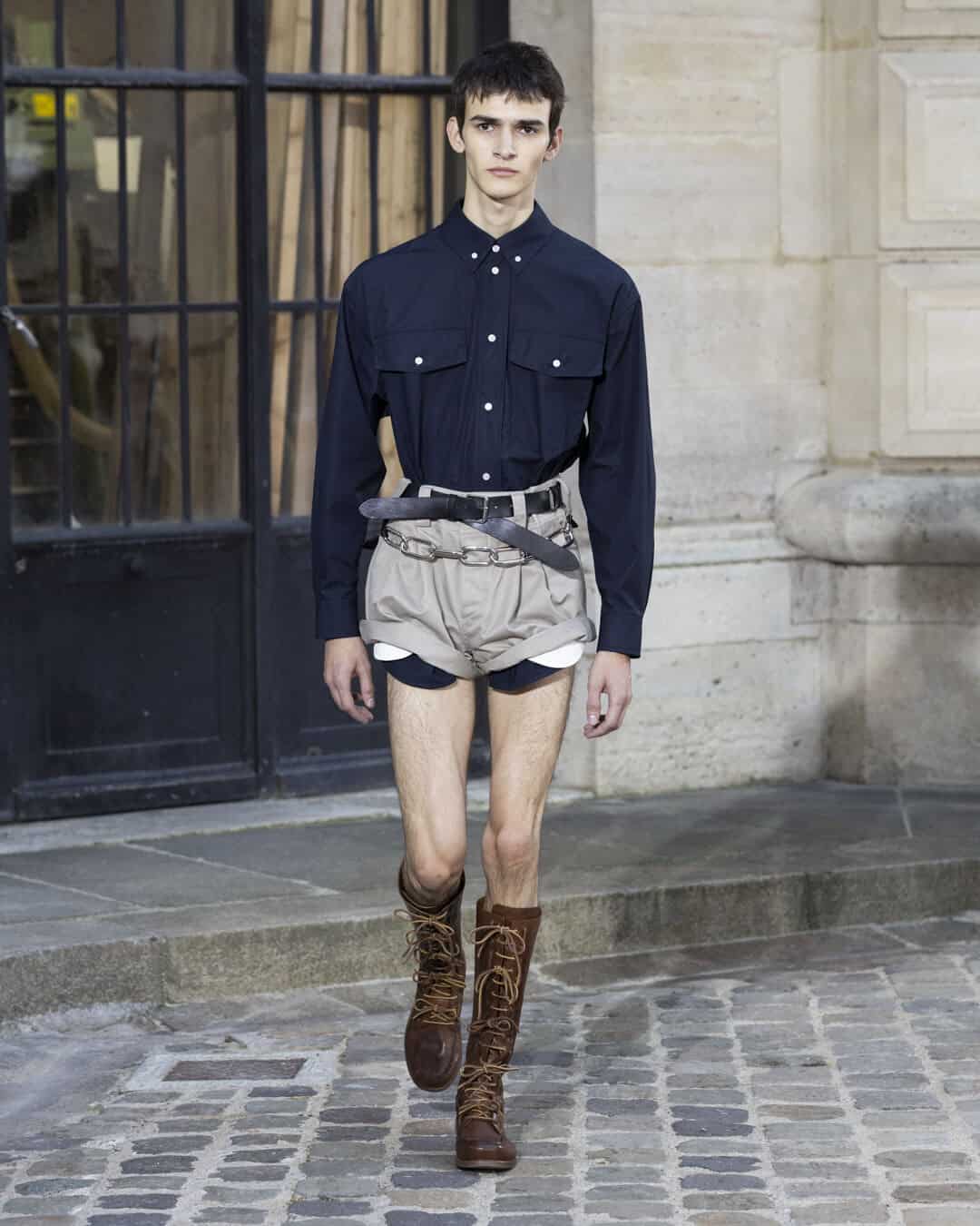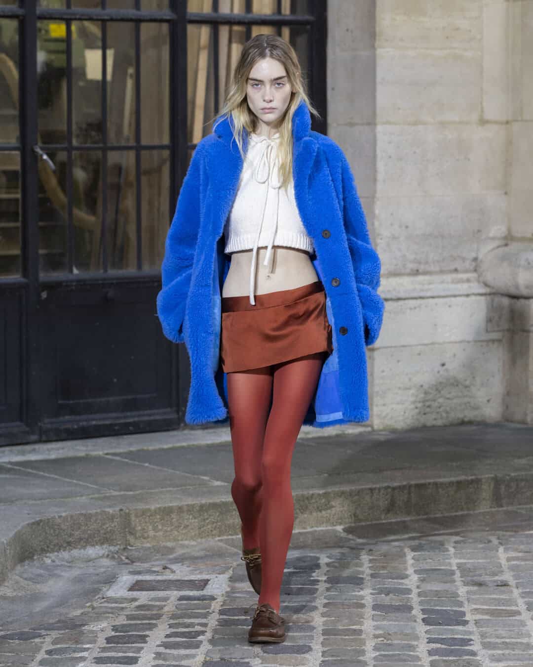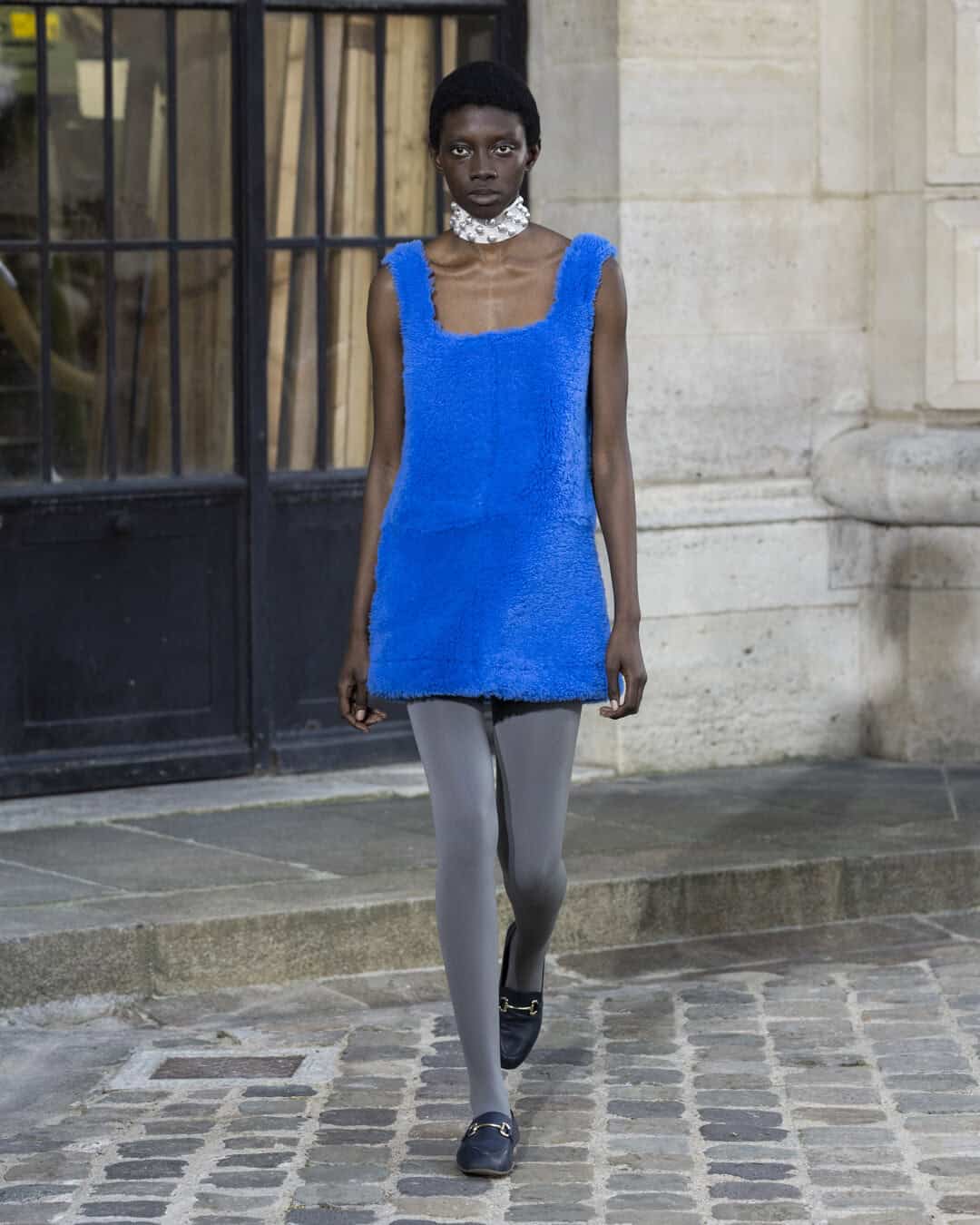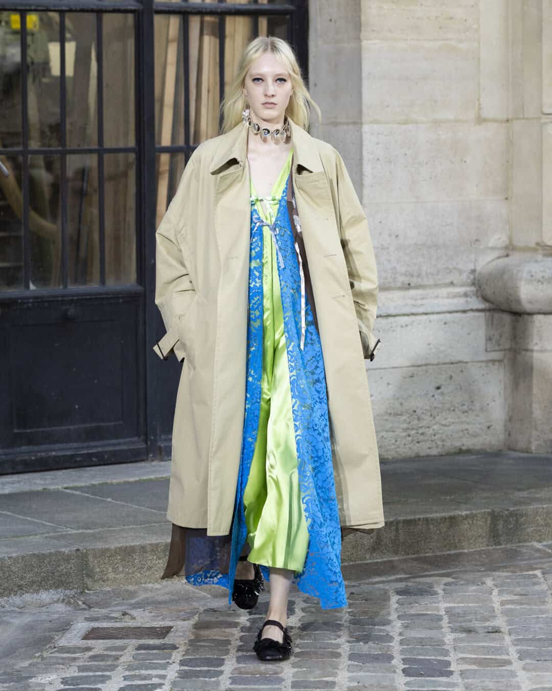 That meant lace was layered upon lime green satin dresses in striking blue and ruby red – a truly unexpected combo. Then, moving into striped men’s shirting, with button-up knitted vests and double-breasted trench coats styled on top, a modern flare shone through the classics. There was a sporty vibe to the collection at times, with a blue bomber jacket and super short shorts that were barely there, and a cobalt teddy dress showed a different side to the collection’s personality, giving the wearer limitless freedom to reinvent themselves over and over again.