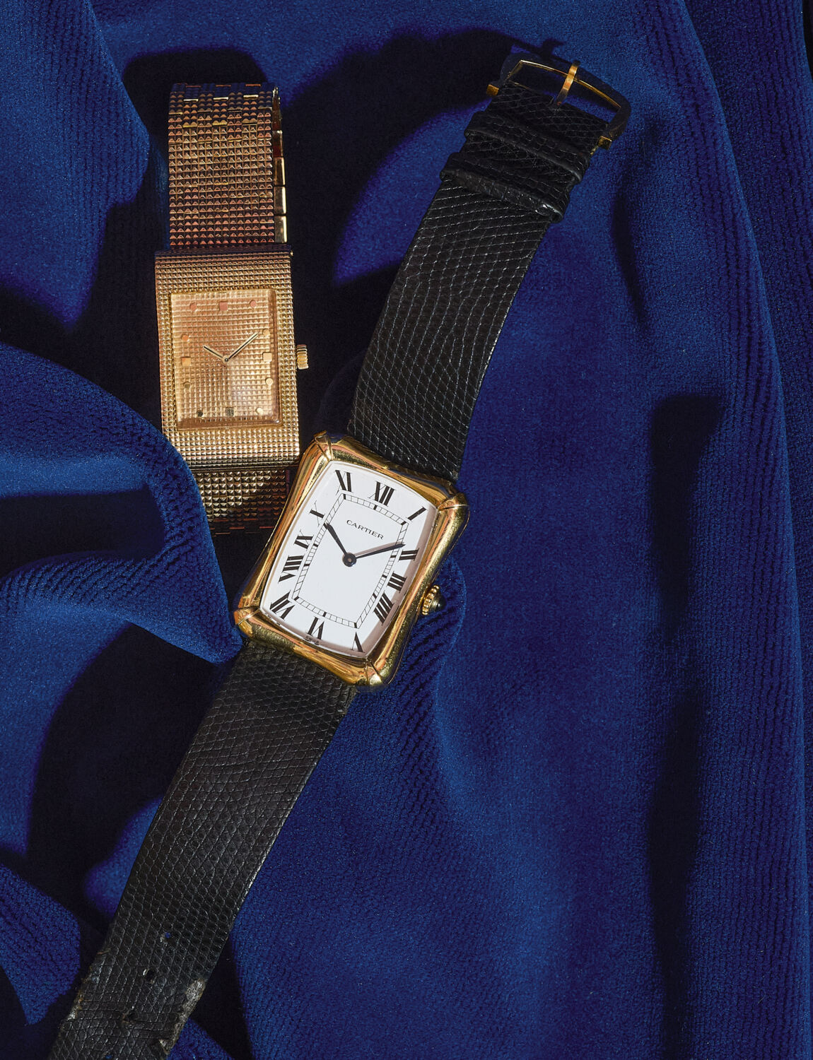 from left: Reflet watch in pink gold by BOUCHERON, Coussin watch in yellow gold by CARTIER; from left: Coussin watch in yellow gold by CARTIER, Ellipse watch in yellow gold by PATEK PHILIPPE from CARTIER
