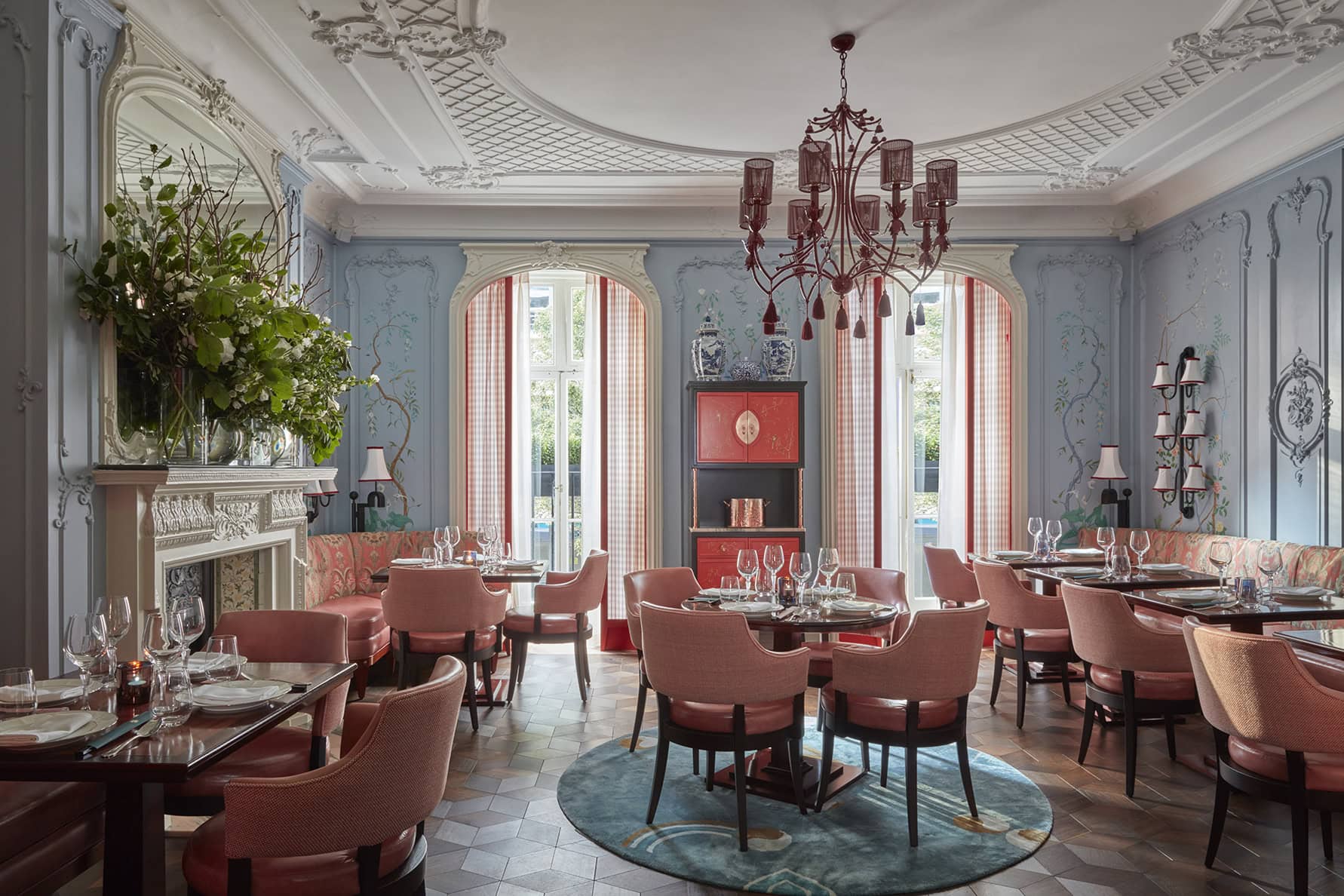 Upstairs we went along a narrow hallway painted olive green, its walls adorned with what appeared to be hand-painted blossom branches that led us to the first floor. We were shown to our table in a dusty blue and strawberry red room that felt intimate and cosy. Panelling framed whimsical botanical murals that trailed upwards, drawing the eye to intricately carved latticework and delicate floral ceiling mouldings that crowned the space with a sense of grandeur. The atmosphere felt distinctly French in spirit, as though we had been transported into a Parisian apartment – lofty ceilings, soft toned walls and an undeniable romance. Above us, a dramatic deep red chandelier presided, its branch-like arms stretching outward, each tipped with rose hued shades casting a flattering blush glow across the room.