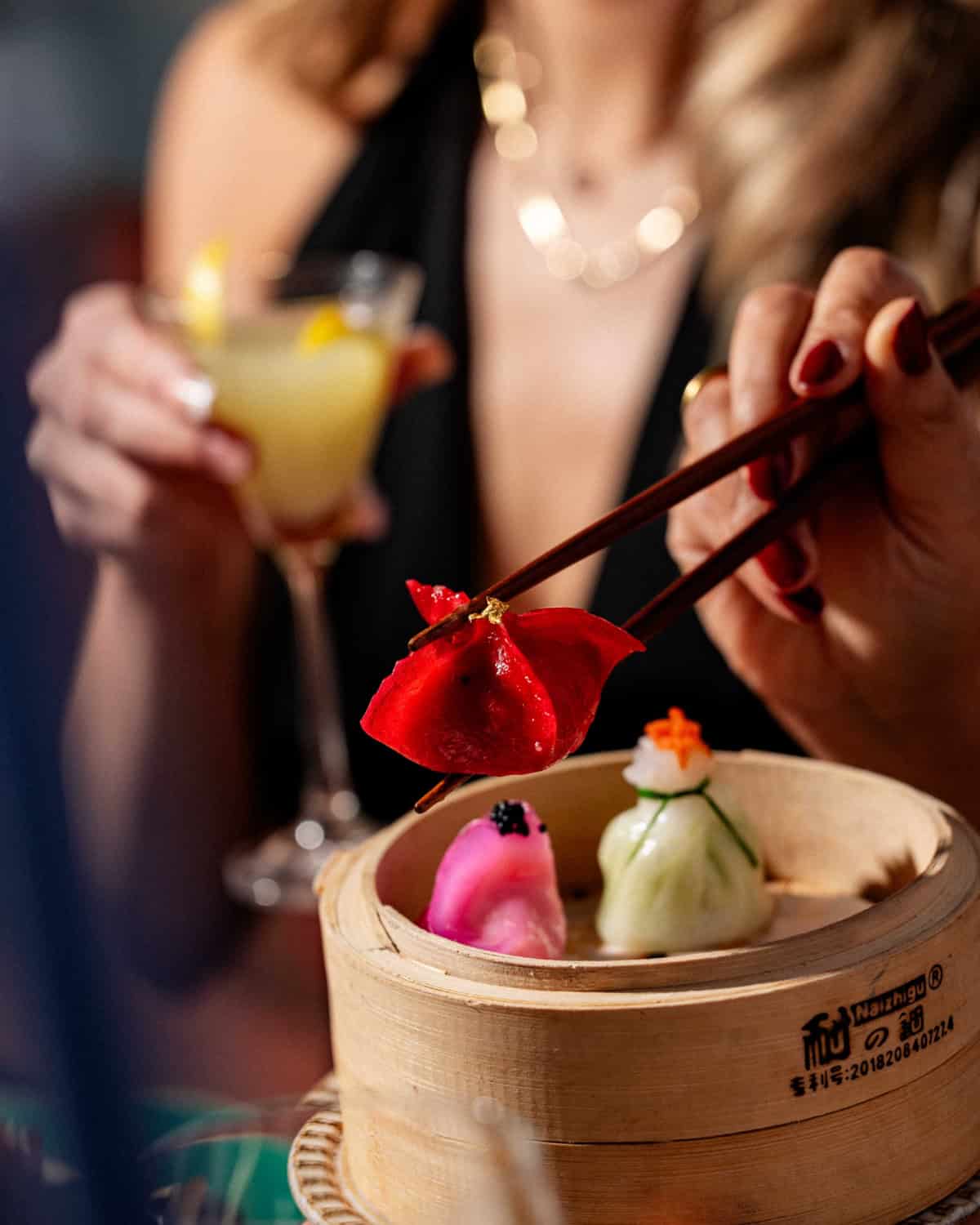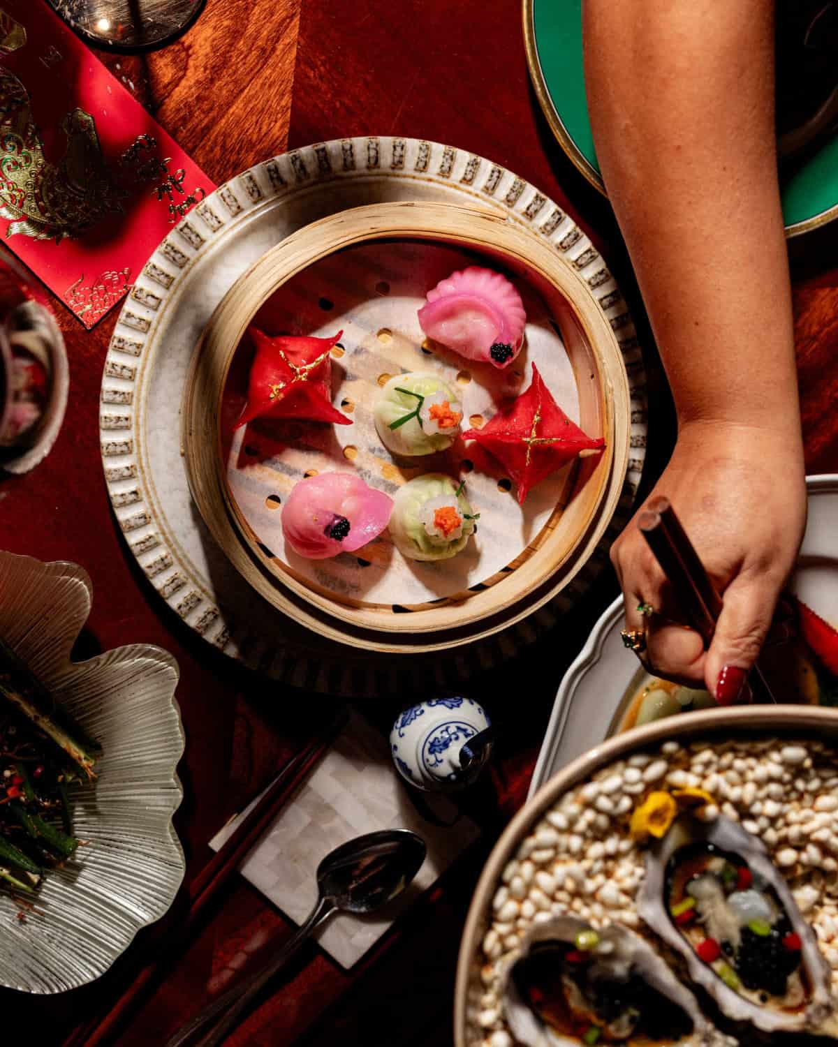 Later, a bamboo basket – the ‘Basket of Wealth’ – was set gently at the centre of the table and as the lid was lifted, a soft puff of steam escaped, carrying with it a fragrant aroma. Inside sat a colourful array of dim sum filled with chicken, prawn and truffle.