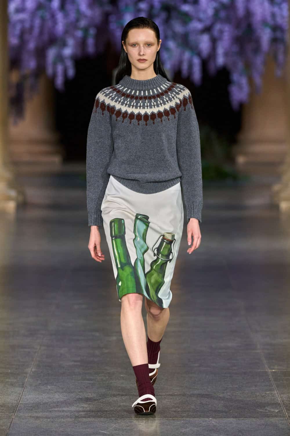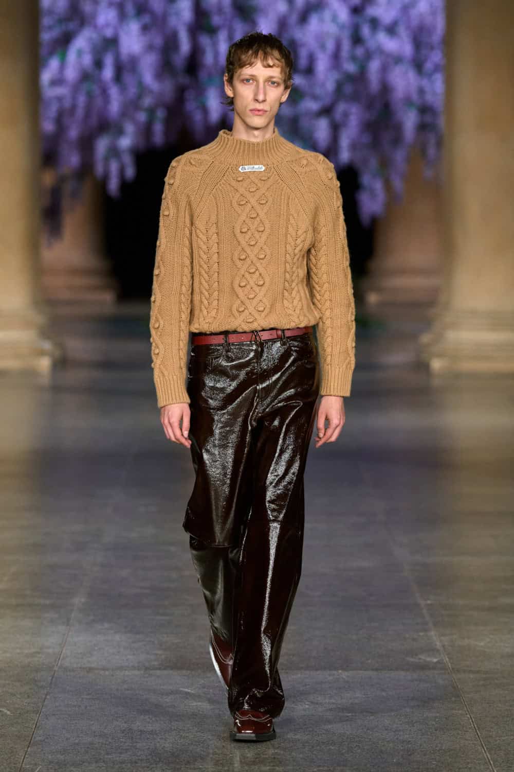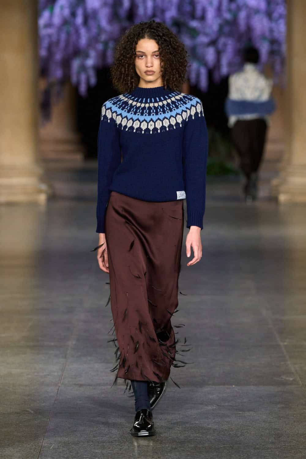 It’s freshly grown Brit roots branched out, comprehensively embracing all of the AW26 collection, from fabric choices to design. From quintessentially countryside tweed broad-shouldered coats to Fair Isle jumpers and Aran knit sweaters echoing Scottish and Irish traditions, Fletcher took the house on a textile-centred voyage through the British Isles.