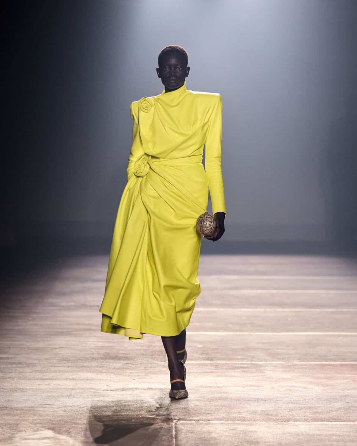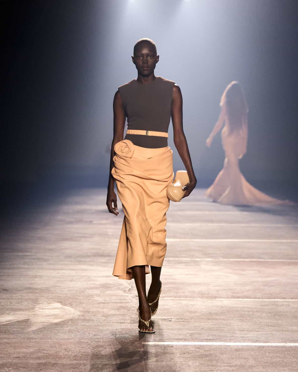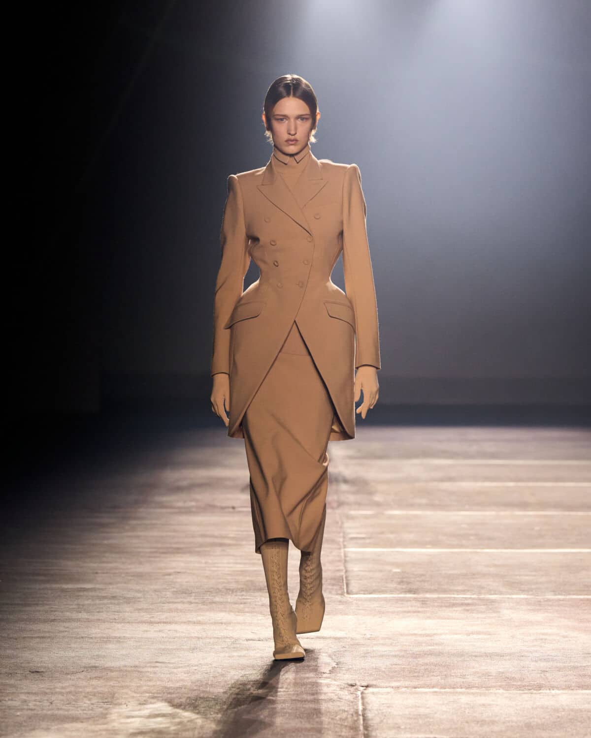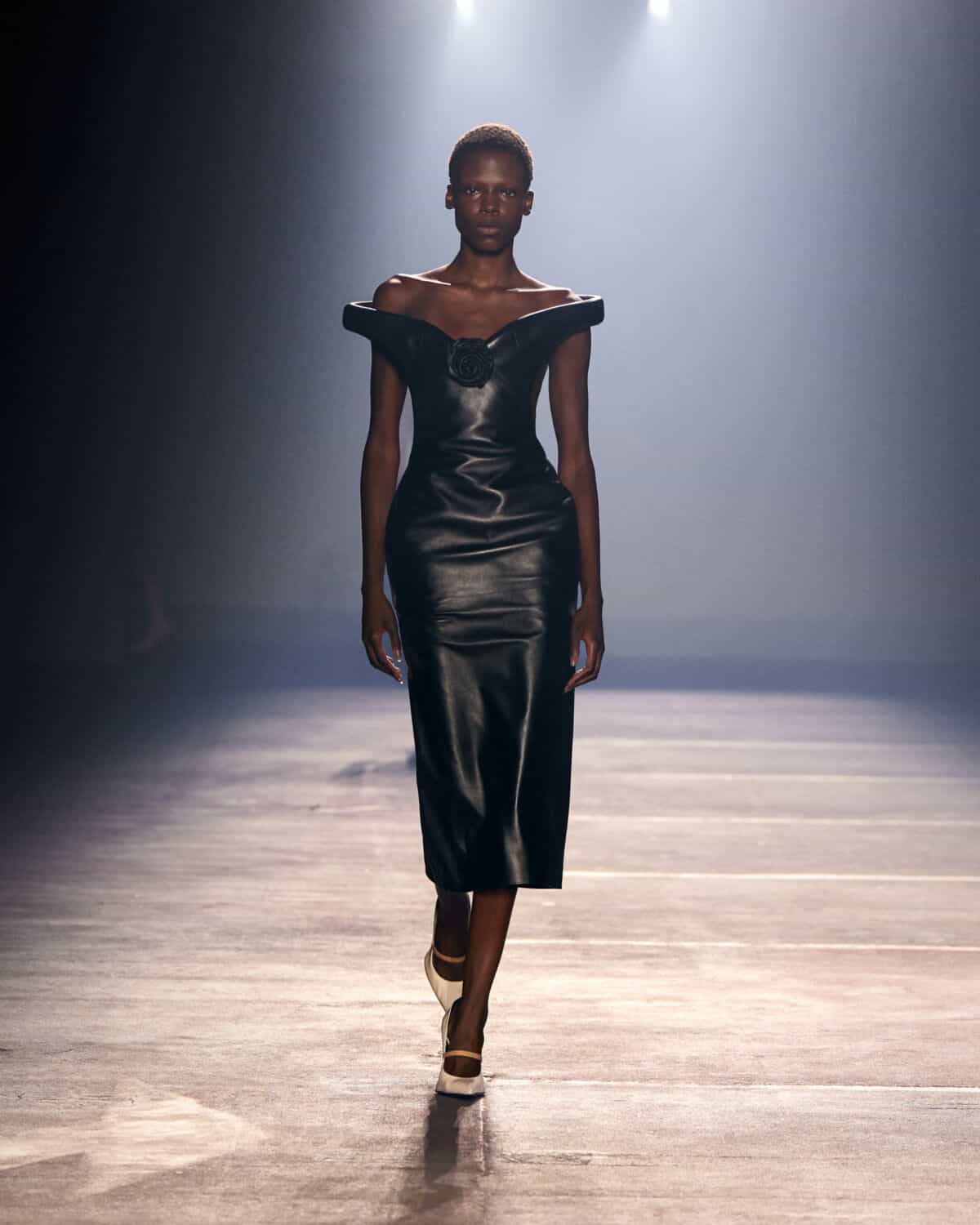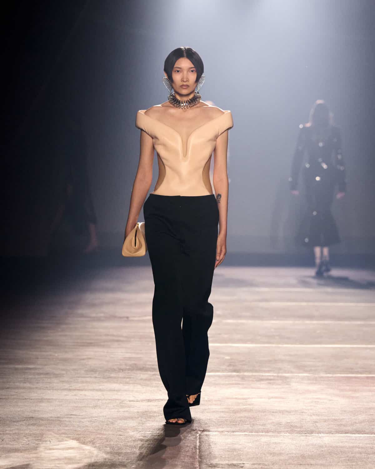 A new era for the Mugler woman is unleashed. Miguel Castro Freitas brought the fashion pack down to an underground carpark for his debut show for the house. This is his first time in the creative director seat after previously leading teams at Dior, Dries Van Noten and, most recently, Sportmax. There is so much so much you can mine from the world of Manfred Thierry himself, whose sex-driven couture was bombastic and untouchably fierce. Fusing fetish with fantasy, his signature-brand of power dressing often saw his models stalk the catwalk as aliens, robots and motorcycles.