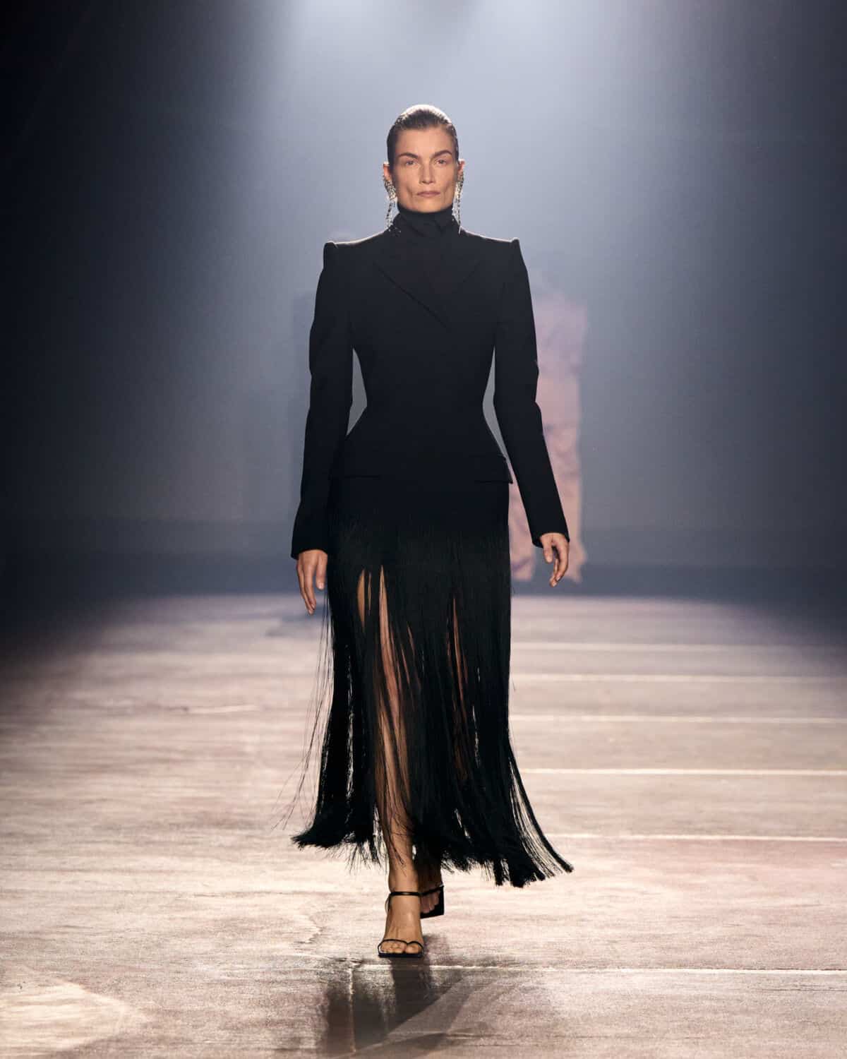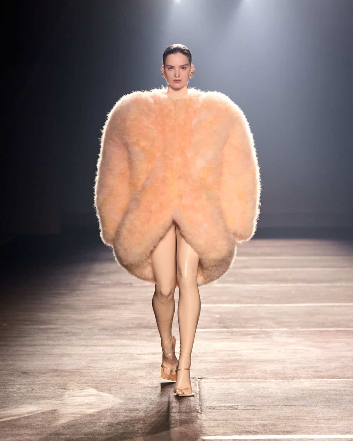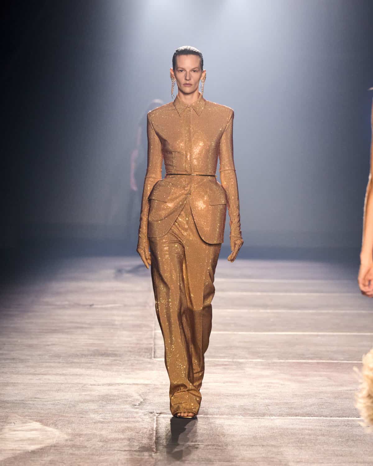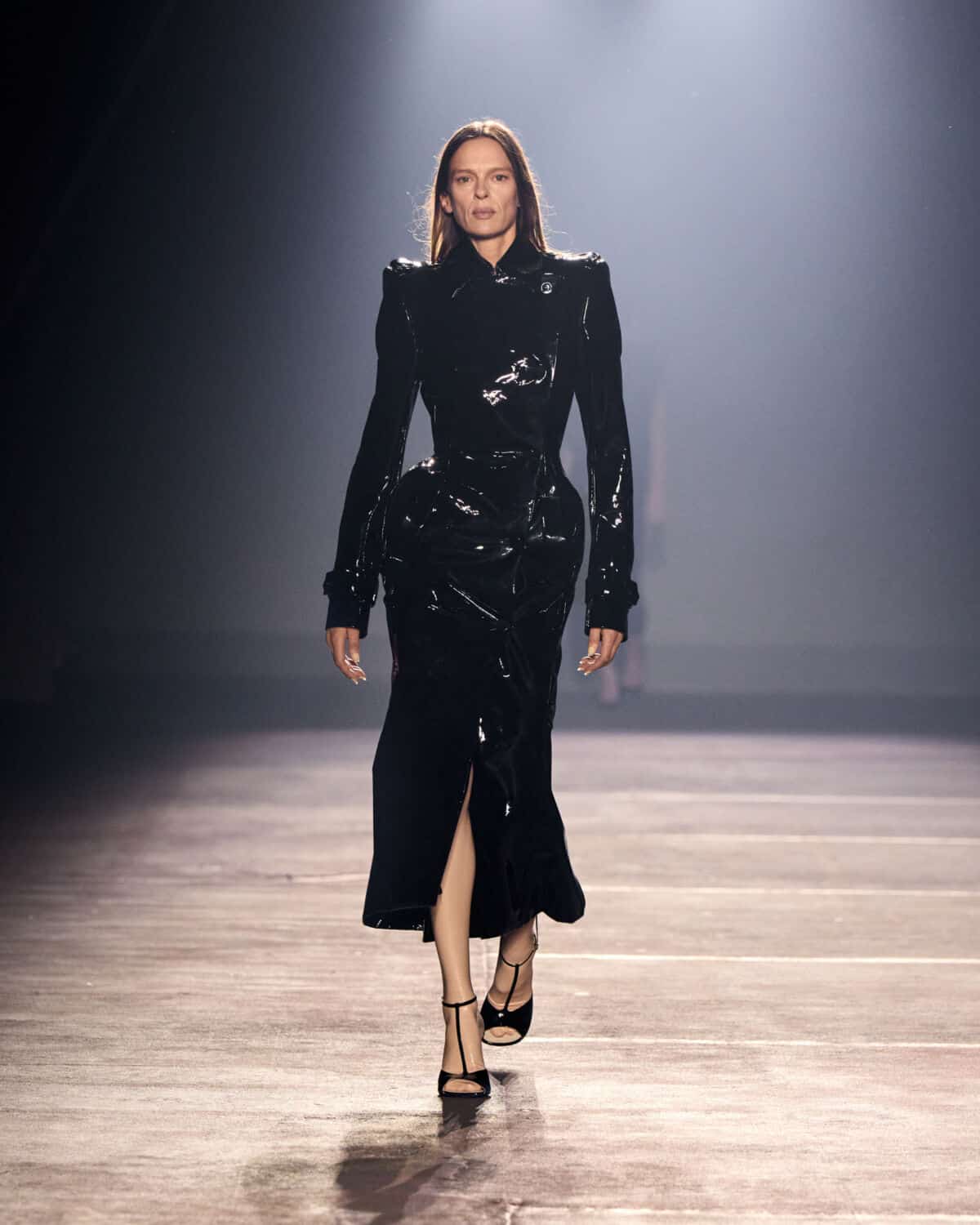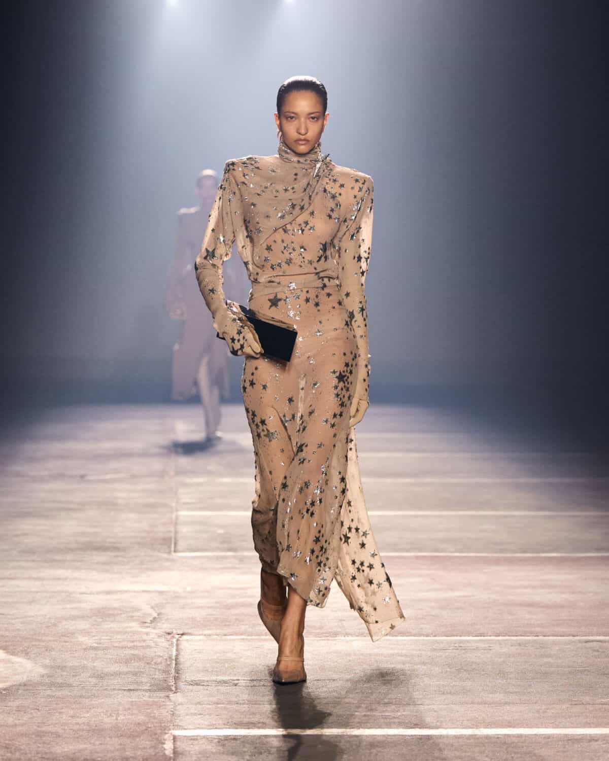 Castro Freitas cleverly skipped past the bionic women and instead let his design hand be guided by “the semiotics of sexual desire” threaded in the spirit of Mugler. He was thinking about nightcrawlers and glamazons who operate in the shadows. He set out to channel “the fetishised cliché of the showgirl”; clothes that reek of untouchable glamour. Highlights included second-skin latex skirt suits, floor-length glossy trench coats pulled close to the body and catsuits that dripped in nude-coloured gemstones. There were opulent feather headdresses, sculptural overcoats that migrated into a curtain of fringe at the hem and stars formed a silver-frosted gallery across draped dresses with square-shoulders.
