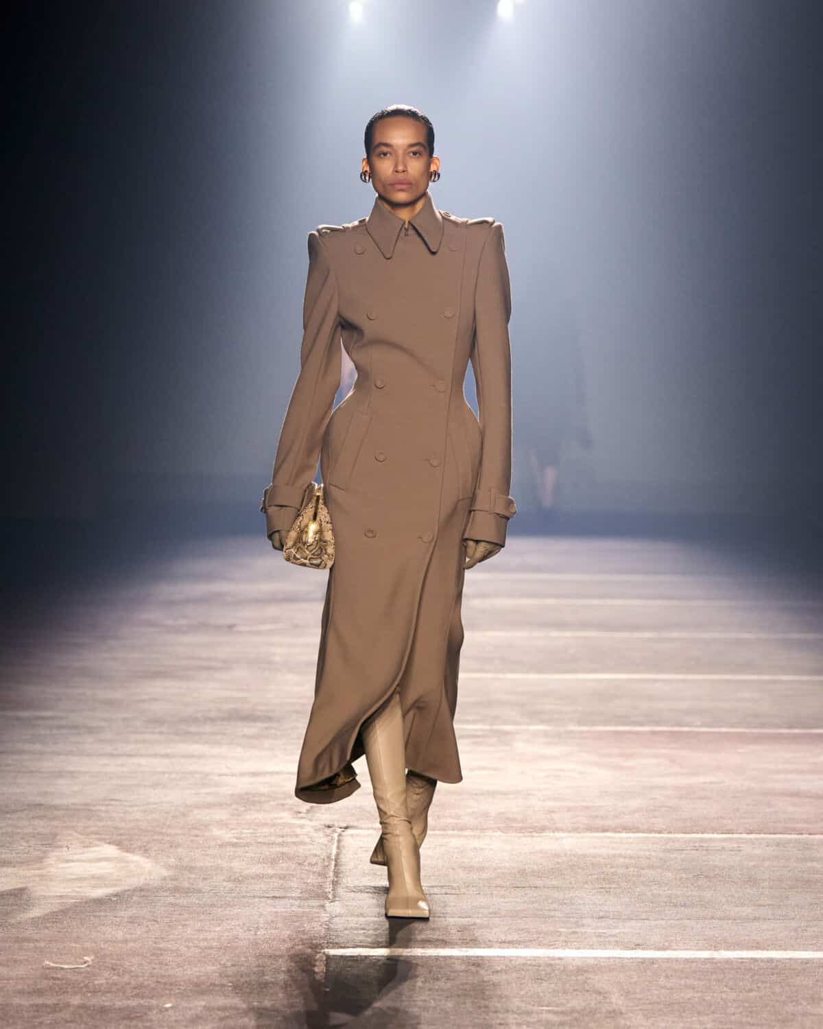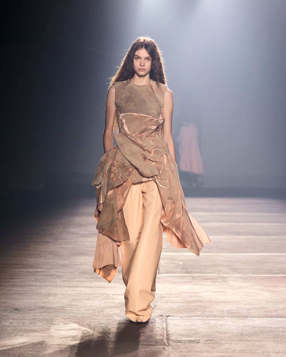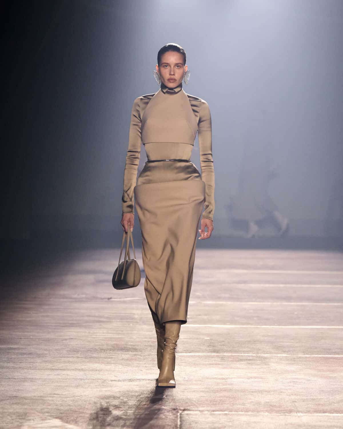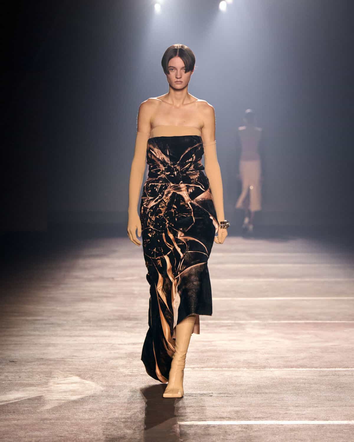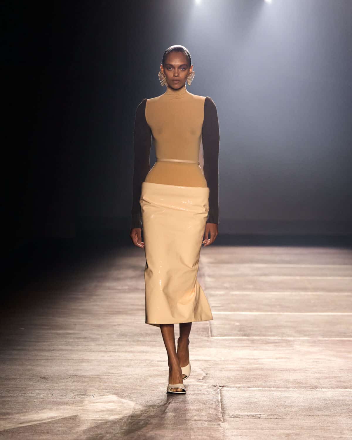 Castro Freitas cleverly skipped past the bionic women and instead let his design hand be guided by “the semiotics of sexual desire” threaded in the spirit of Mugler. He was thinking about nightcrawlers and glamazons who operate in the shadows. He set out to channel “the fetishised cliché of the showgirl”; clothes that reek of untouchable glamour. Highlights included second-skin latex skirt suits, floor-length glossy trench coats pulled close to the body and catsuits that dripped in nude-coloured gemstones. There were opulent feather headdresses, sculptural overcoats that migrated into a curtain of fringe at the hem and stars formed a silver-frosted gallery across draped dresses with square-shoulders.
