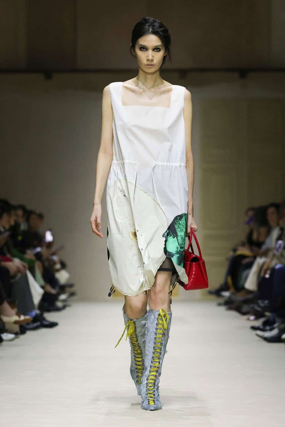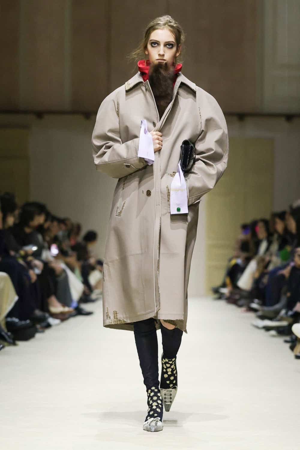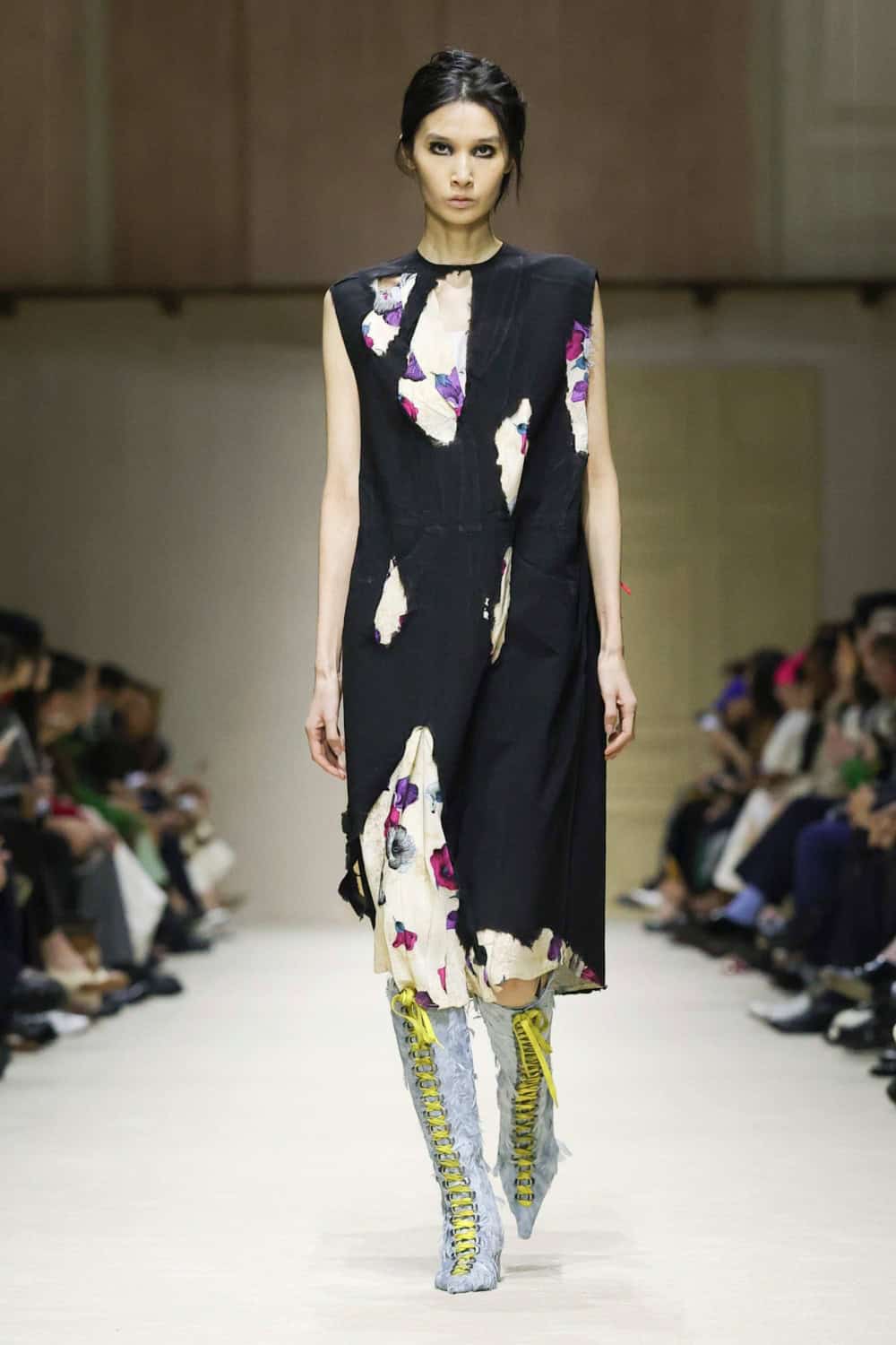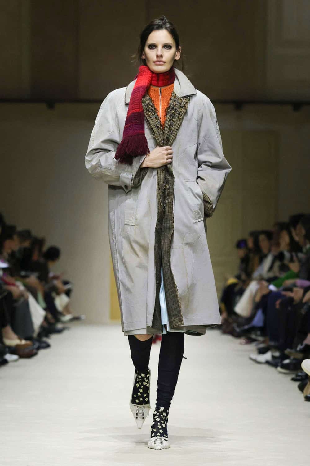 The show was held on the same bombed-out mansion set as the men’s, but with the addition layer of 16th and 17th century paintings and tapestries, 18th century Venetian mirror and consoles and antique chairs, lamps and paintings from the 1900s. The men’s show featured many deliberately frayed and distressed pieces. That theme carried into the womenswear along with the narrow coats some worn with little capelets. Creased shirts and trench coats, frayed collars and prints of peeling floral wallpaper all played into the idea of patina, wear and layers of memory held in a garment. In contrast to the deliberate chaos of the looks, were prim ladylike bags in embossed alligator adding another layer to the look.