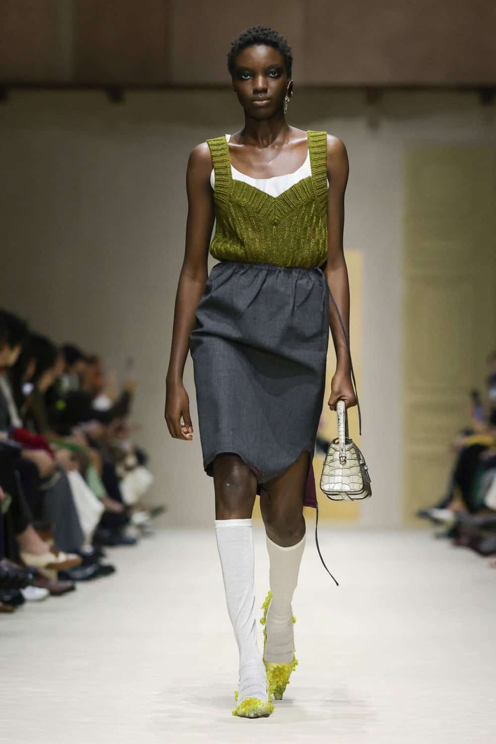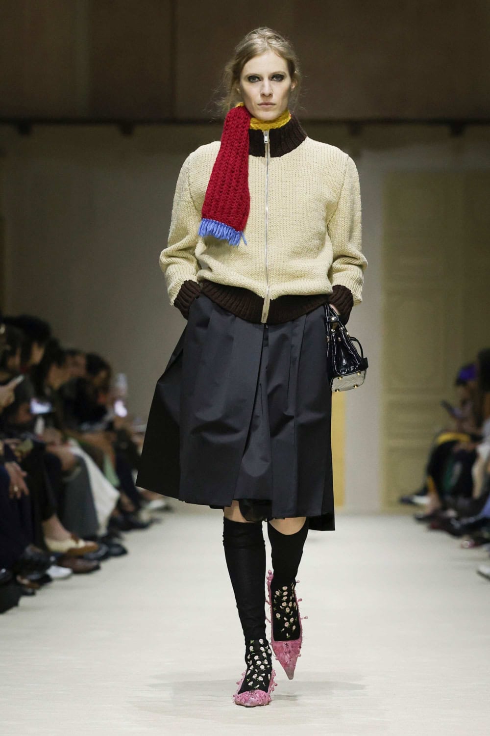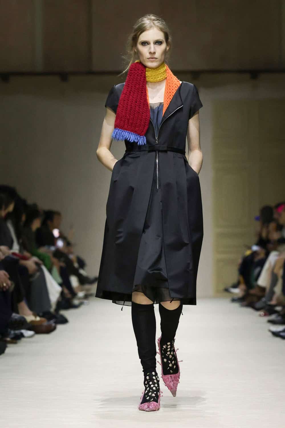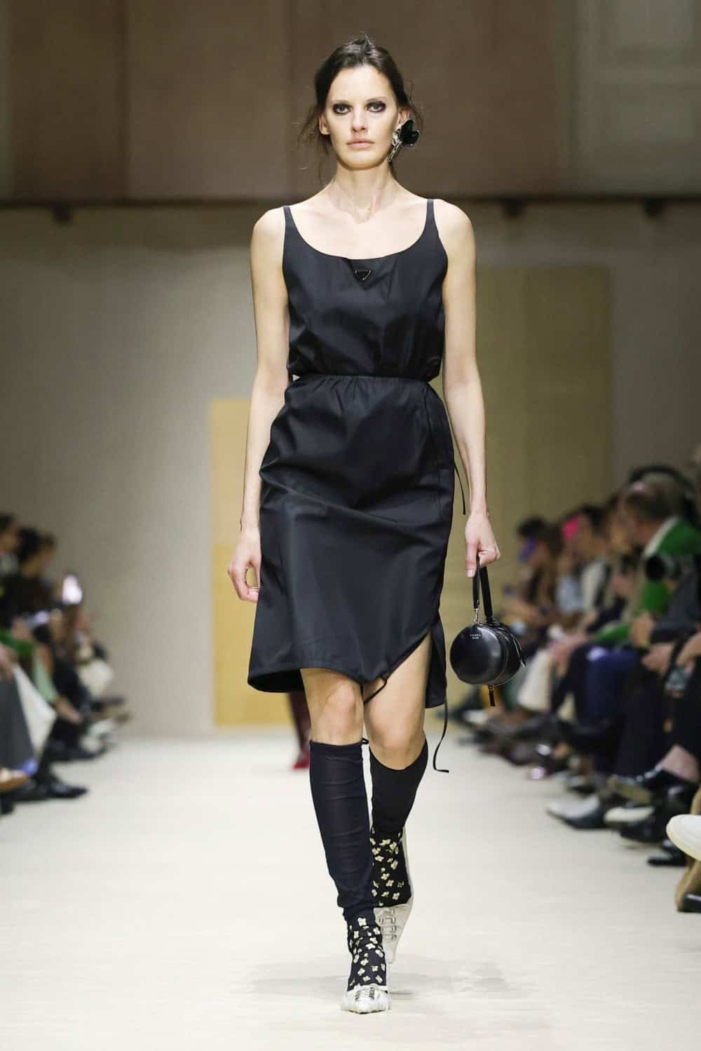 The quick change concept brought an urgent energy to the show which was a love letter to layering. Simon’s explained the show was not about narrative or story, but about how we relate to our clothes and how we put them together in ingenious ways. “It’s a lot about the freedom to be inspired and to bring things together that feel contemporary to us,” he said. “What do I wear with what? What is possible? Can I do it another way?” He and Mrs Prada offered plenty of suggestions from floral embroidered socks with a somber trouser suit to pairing a blue button down shirt with a scarlet beaded slip and a sturdy brogue. Or putting a sheer black shift over white cotton bloomers and a matching vest. Mrs Prada said the styling was to express “the continuous necessity of change. What you thought was a flaring skirt first time around was revealed to be a fifties-style dress.