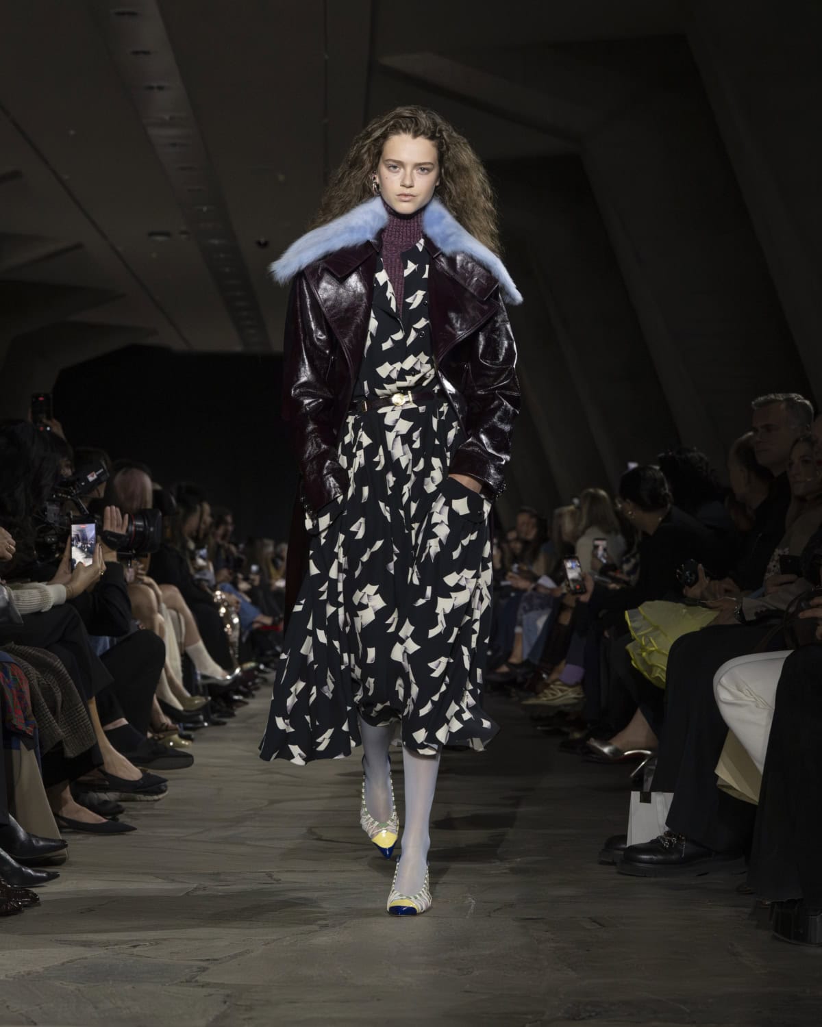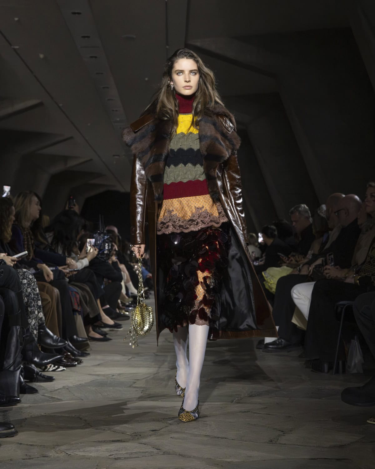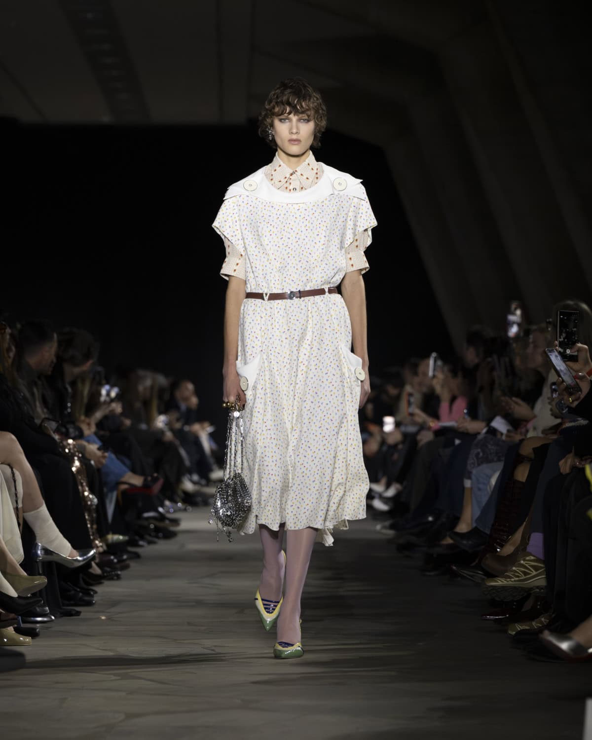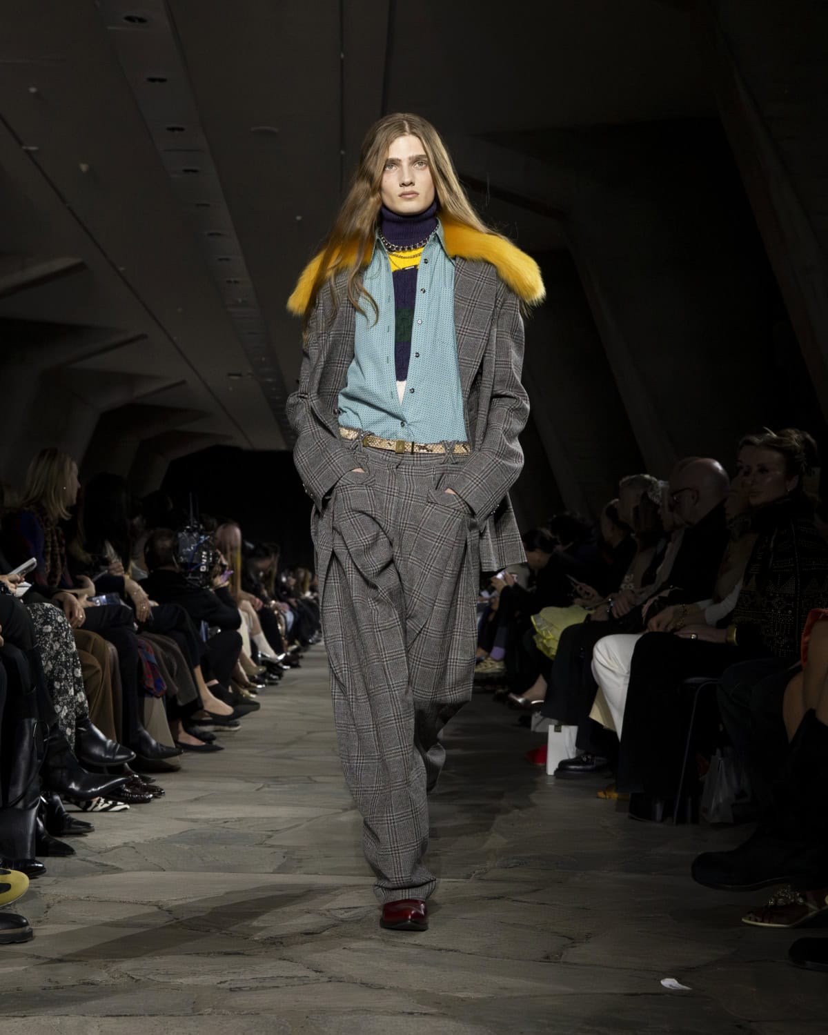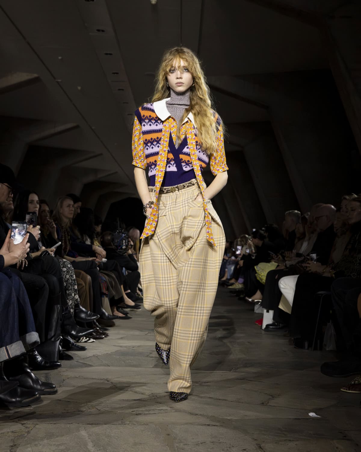 The best moments included a men’s mohair overcoat accented with metal eyelets, given the OTT treatment with a baby blue, exaggerated collar. It would be great to see Dossena expand on his Rabanne menswear: the handful of men’s looks that appeared on the catwalk were superb. Like bulky leather jackets with monster-like purple fur creeping from the lining up to the collar. Elsewhere, metal mesh tops and ‘40s style frocks came printed with kitschy florals and plaid slacks were cut wide before pooling nice around the ankle. Combinations were chaotic but all the better for it, like chunky Fair Isle knits lodged under slip dresses that dripped in embellishment. These are looks that could make dressing for even the most mundane moments feel like something of an occasion.