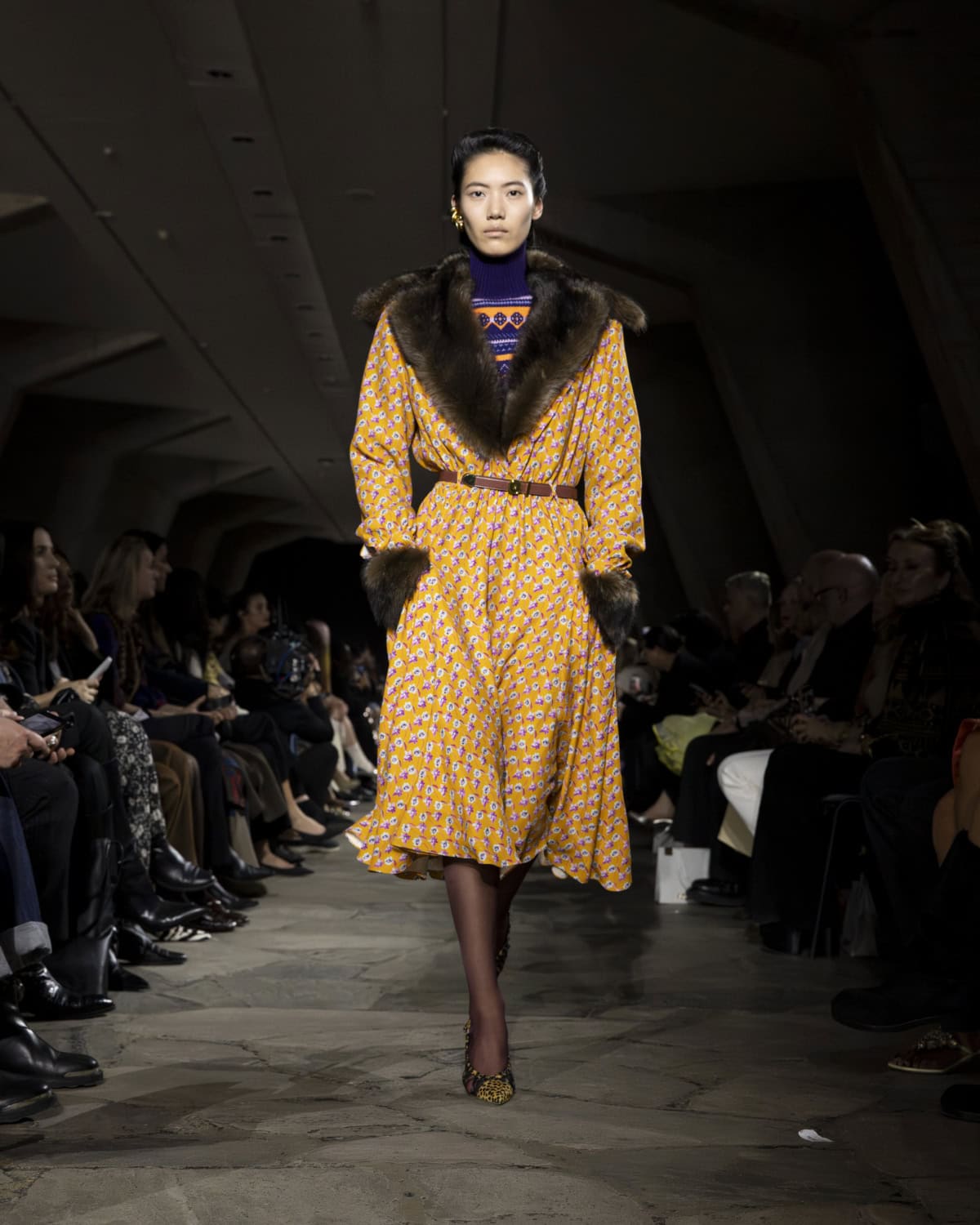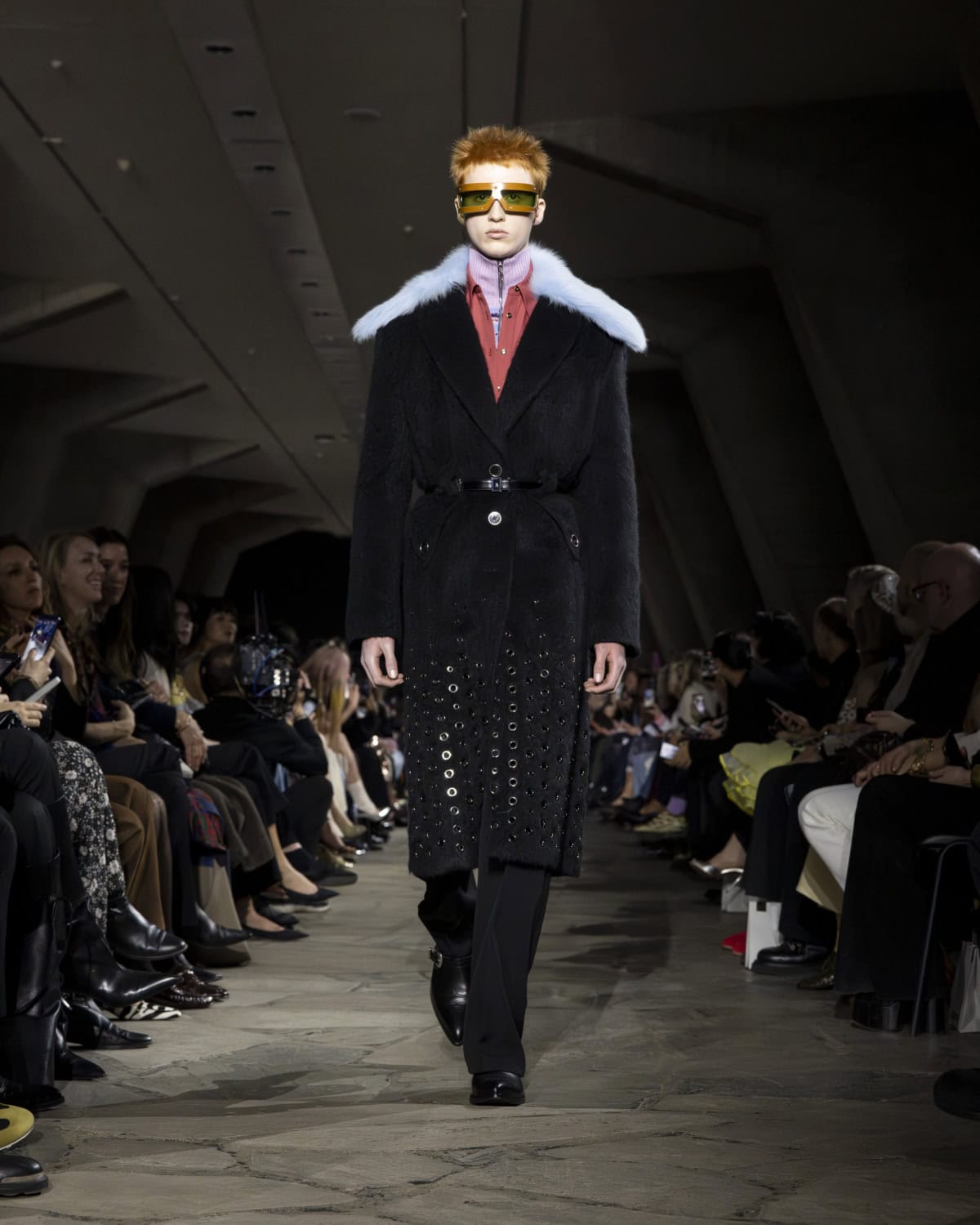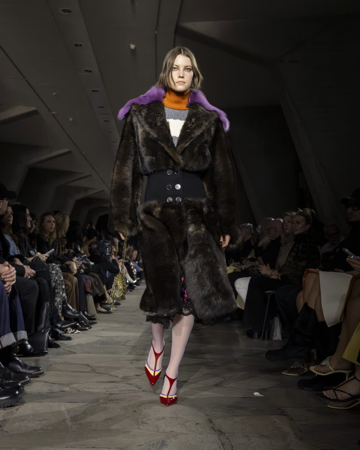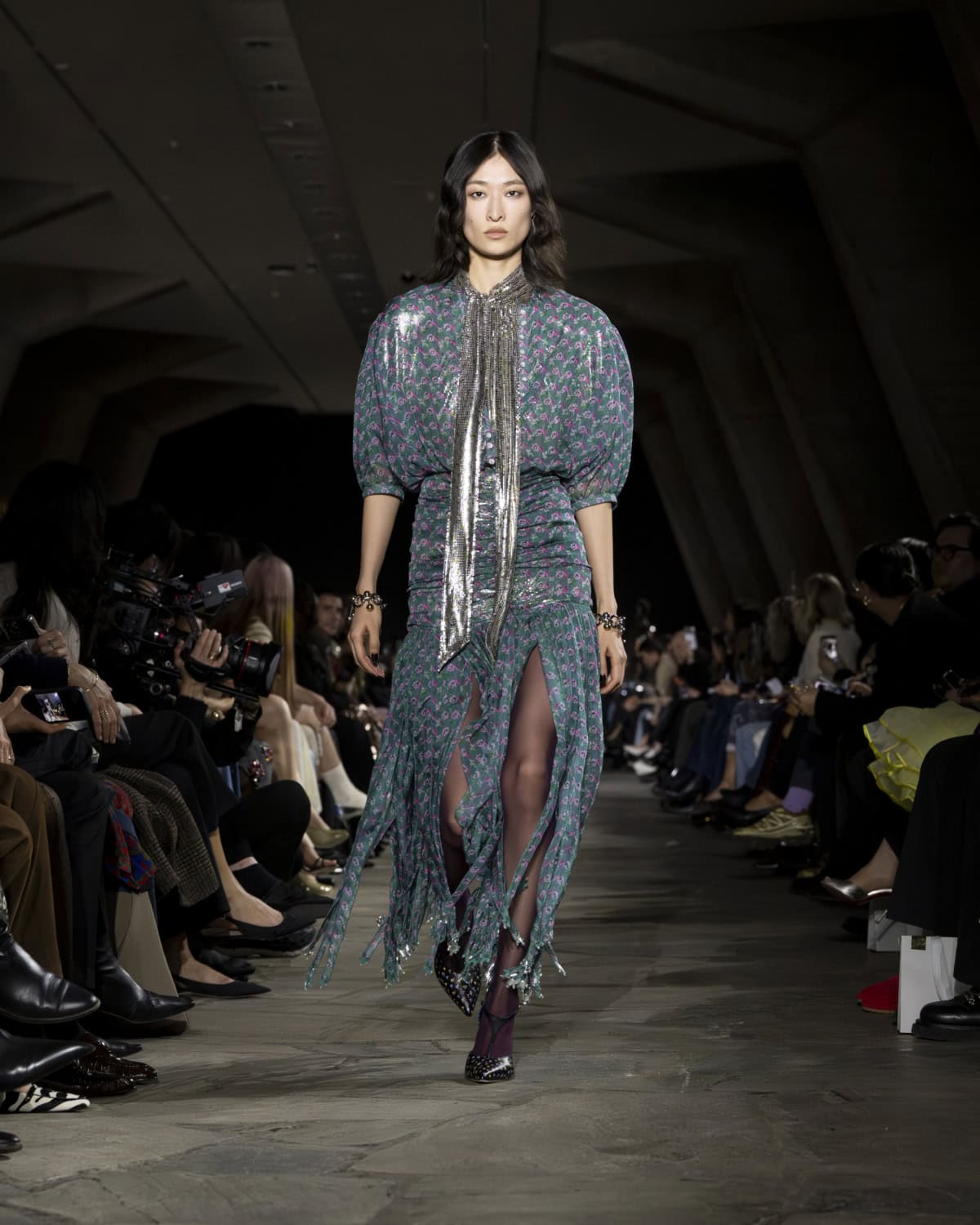 The best moments included a men’s mohair overcoat accented with metal eyelets, given the OTT treatment with a baby blue, exaggerated collar. It would be great to see Dossena expand on his Rabanne menswear: the handful of men’s looks that appeared on the catwalk were superb. Like bulky leather jackets with monster-like purple fur creeping from the lining up to the collar. Elsewhere, metal mesh tops and ‘40s style frocks came printed with kitschy florals and plaid slacks were cut wide before pooling nice around the ankle. Combinations were chaotic but all the better for it, like chunky Fair Isle knits lodged under slip dresses that dripped in embellishment. These are looks that could make dressing for even the most mundane moments feel like something of an occasion.