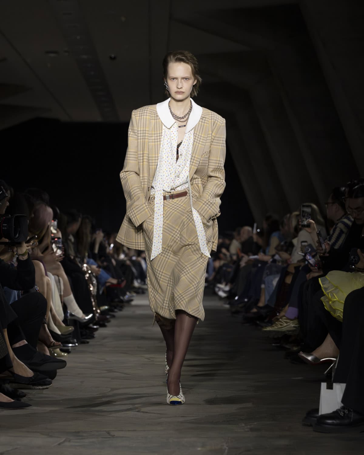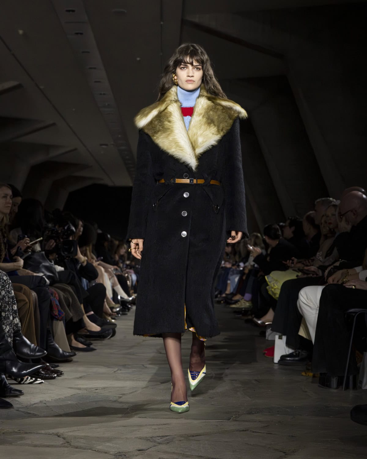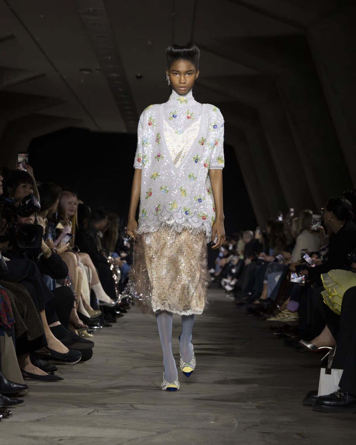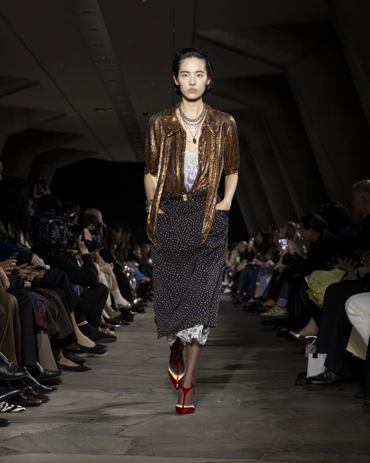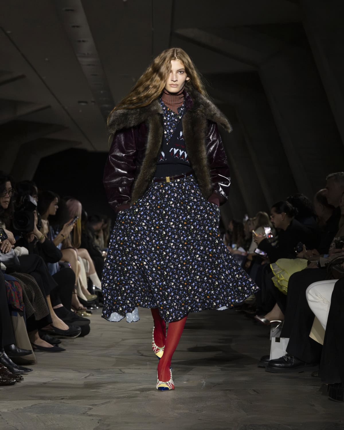 The best moments included a men’s mohair overcoat accented with metal eyelets, given the OTT treatment with a baby blue, exaggerated collar. It would be great to see Dossena expand on his Rabanne menswear: the handful of men’s looks that appeared on the catwalk were superb. Like bulky leather jackets with monster-like purple fur creeping from the lining up to the collar. Elsewhere, metal mesh tops and ‘40s style frocks came printed with kitschy florals and plaid slacks were cut wide before pooling nice around the ankle. Combinations were chaotic but all the better for it, like chunky Fair Isle knits lodged under slip dresses that dripped in embellishment. These are looks that could make dressing for even the most mundane moments feel like something of an occasion.