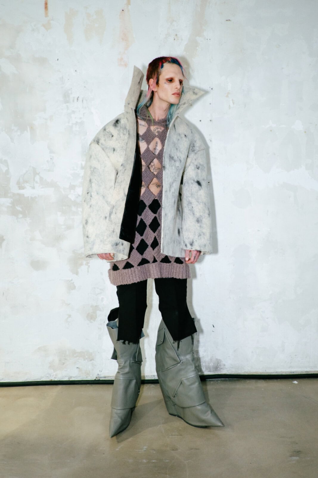 Owens shelved the romance of his recent Temple of Love era in favour of something tougher and more confrontational. Sack coats ballooned in brushed alpaca and boiled wool. Close-fitting coats wrapped the body in glossy bull leather or Kevlar canvas, the bullet-proof association left intentionally intact. Puffers became architectural shoulder capes that jutted out like blades. Long dusters dragged behind enlarged pockets, while muscle-cut leather vests and leather boleros layered over lightweight overcoats pushed attention to the neck and shoulders.