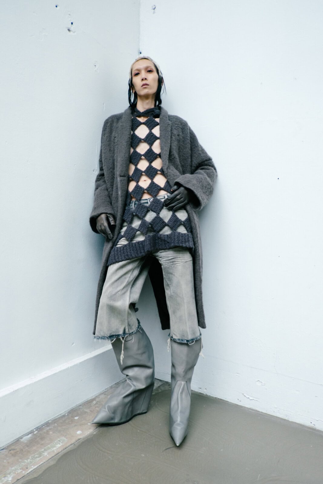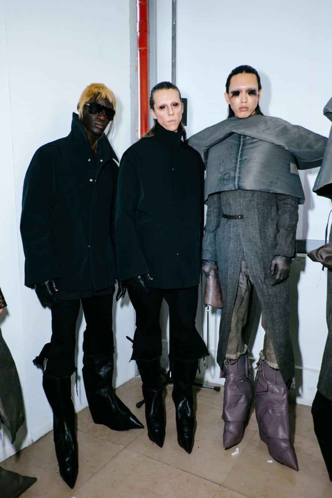 Set to ominous electronic noise in a smoke-choked Palais de Tokyo, the models advanced slowly, towering over the audience on sky-high, round-toed cargo boots inspired by policemen’s shoes. Aptly titled Tower, the idea landed not just in the literal height of the footwear, but in the bulk and authority of the silhouettes themselves. Nothing wobbled or teetered despite the altitude; everything felt planted, heavy and totally controlled.