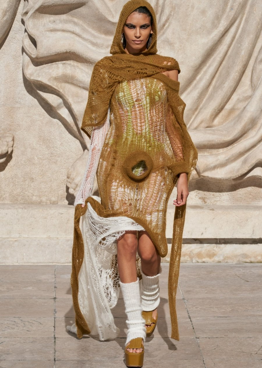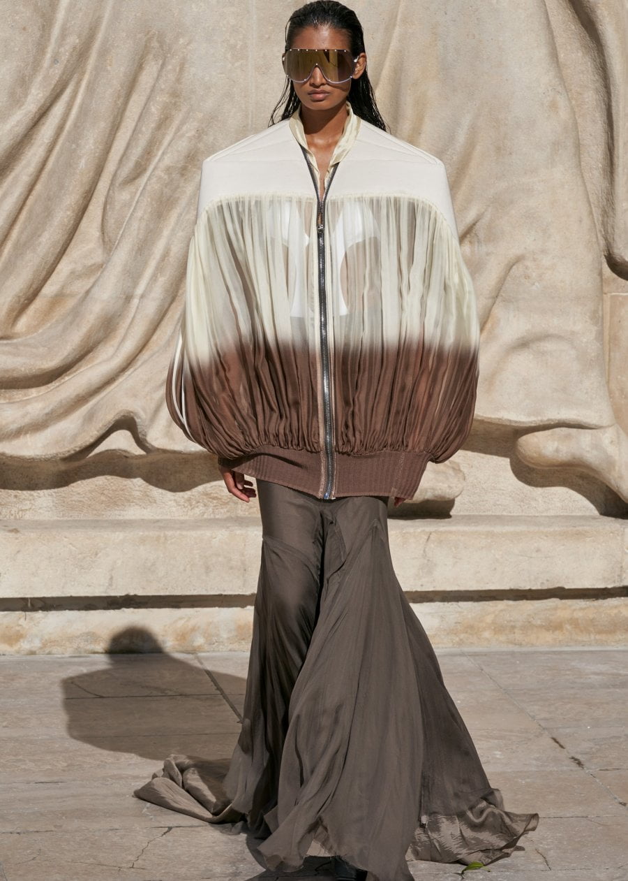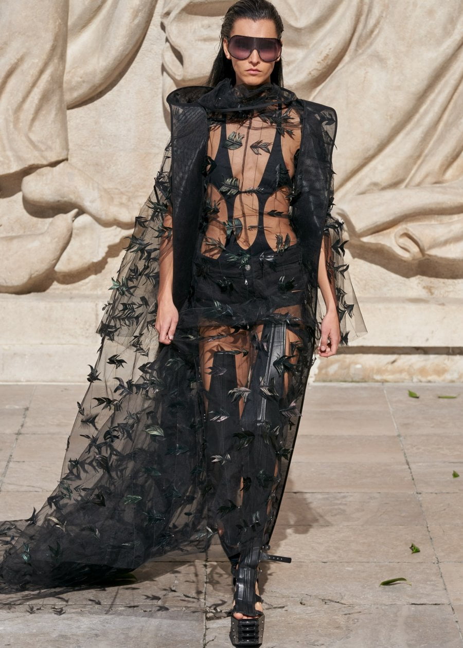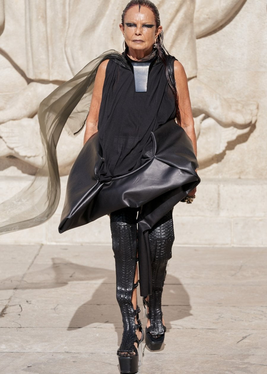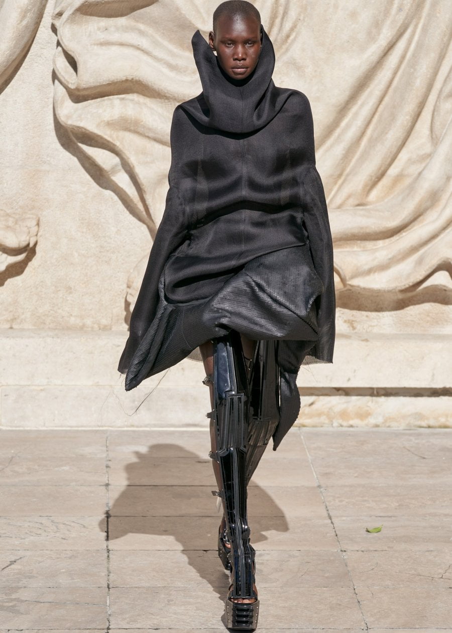 Owen’s went straight to the source. The first model out was his wife, Michéle Lamy – his constant inspiration. She lent a high priestess aura to proceedings, enhanced by great puffs of fog and two women in black robes, scattering petals from on high. Architecture (Le Corbousier was an inspiration) and flou worked in harmony. Huge shoulders and chiffon, curtain-like bomber jackets were worn over gathered goddess gowns. These were draped to perfection with luscious fishtail hems, which undulated with every step. Cut away bodysuits, sheer feather encrusted capes, spiderweb mohair knits with multiple arm holes and thigh-high waders made up the rest of the aesthetic. It was pure Rick. Pure magic.