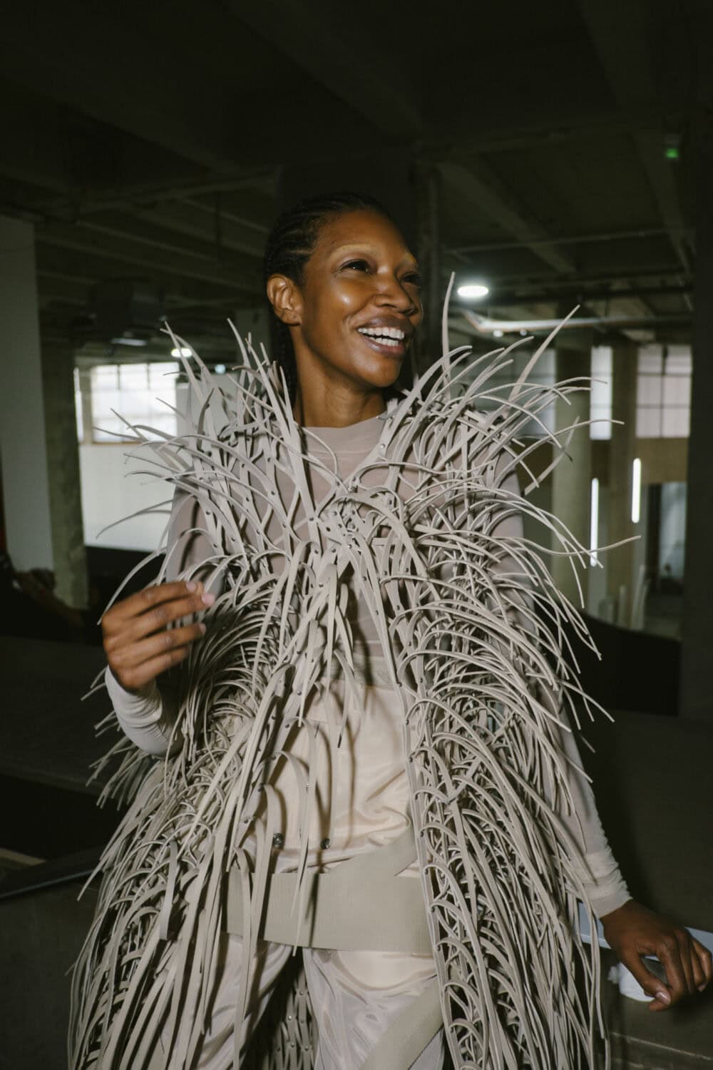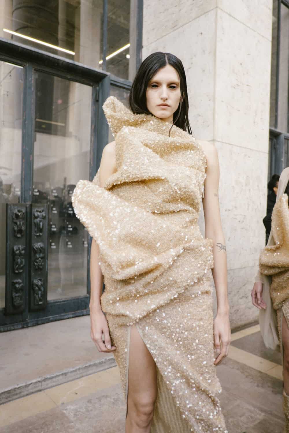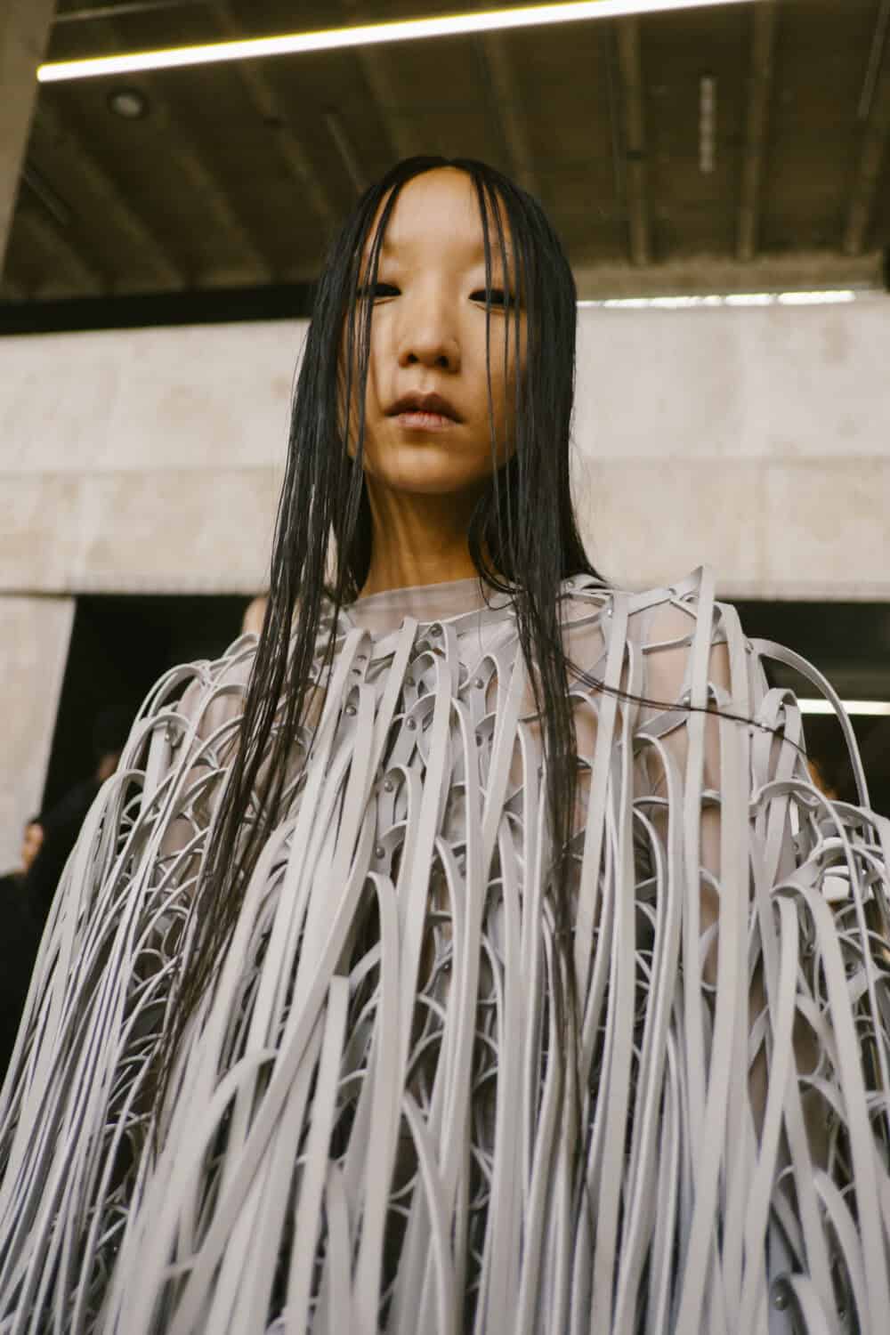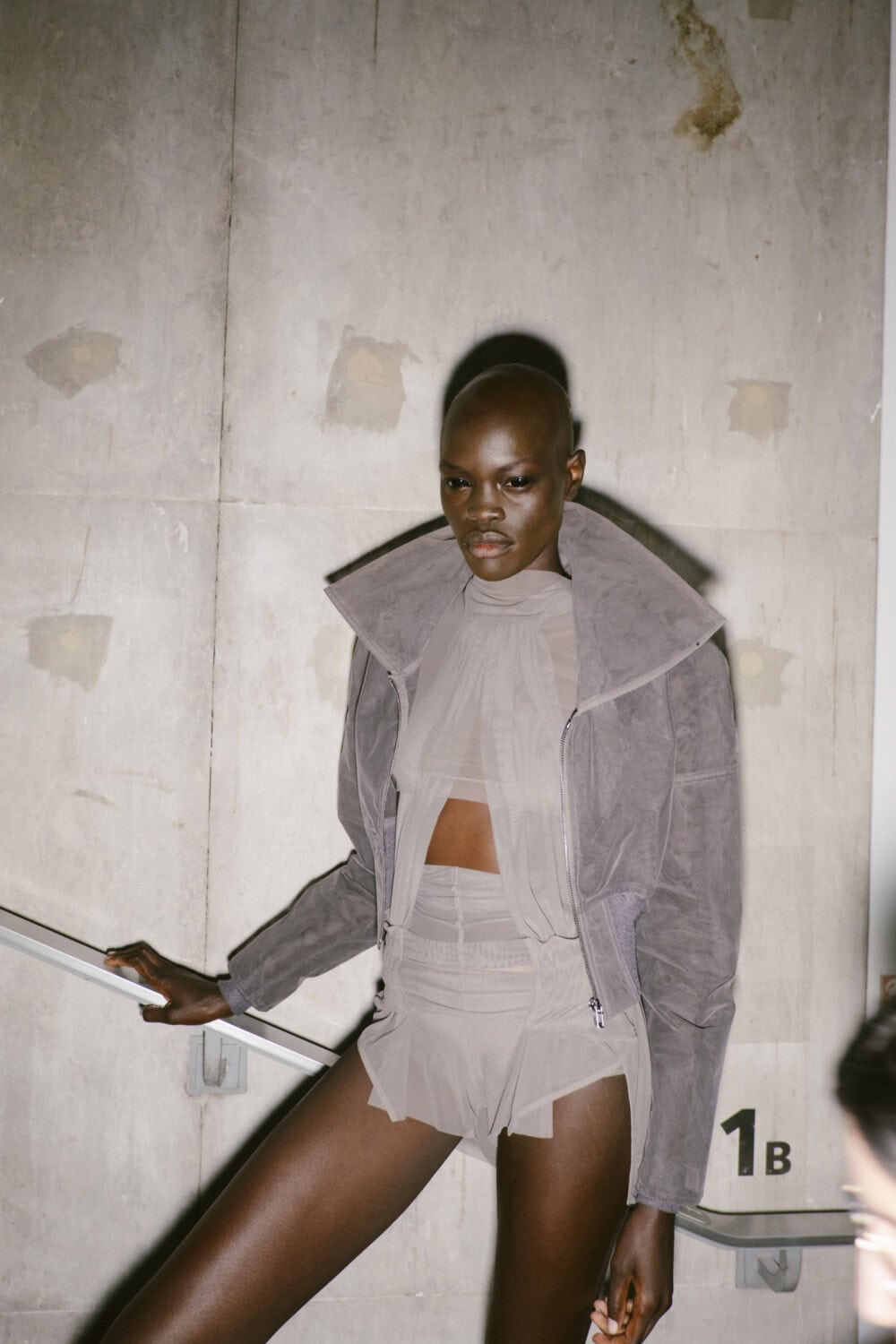The collection, named Temple, picked up the mood with clothes that swung between toughness and fragility. Skirts and dresses came draped in recycled nylon, whipped up into raw, industrial silhouettes, while others shimmered under sequins painstakingly applied by Parisian latex artist Matisse Di Maggio. Cropped trenches came with matching long vests – like armour you could style two ways – layered with candy-hued flight jackets or little leather bikers with dripping fringe sleeves.