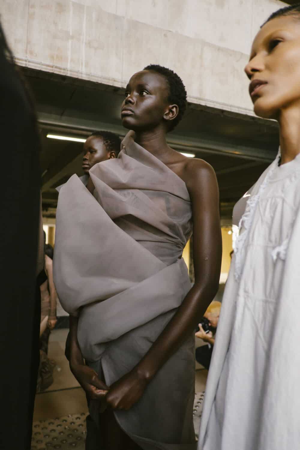 At Rick Owens’ SS26 show, models trekked down a massive scaffolding staircase before trudging through a calf-high pool of water at the Palais de Tokyo. The whole thing felt like a baptism in Owens’ world – dangerous in theory, but in practice? Hardly a single wobble. The Owens cult is unshakable, even in 12cm thigh-high hoof boots – because the higher the heel the closer to heaven, right?
