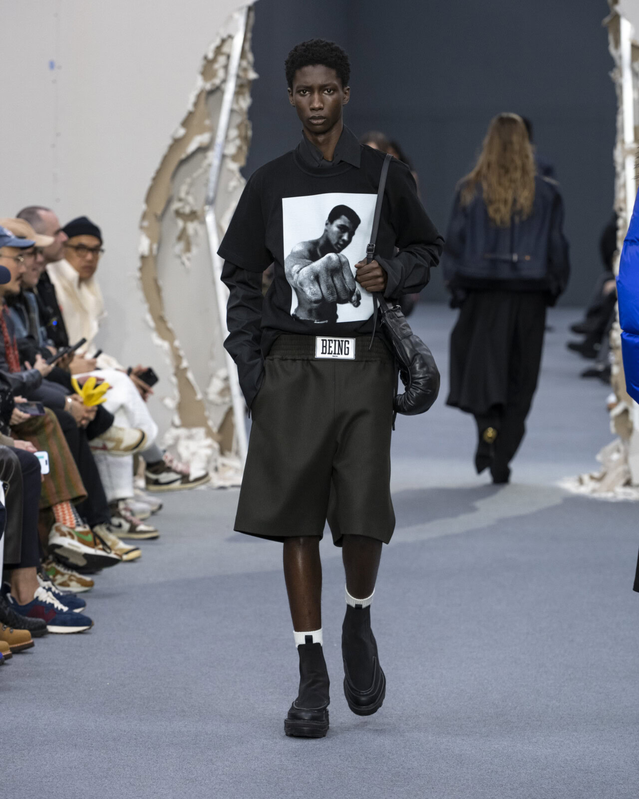 Running throughout was a gorgeous trouser silhouette that was cut so it looked as if they were overlayed with a skirt in the same fabric. These were particularly effective in the workwear looks that were cut from heavy duty, khaki-coloured canvas. New iterations of the brand’s ongoing Levi’s link-up were up next, followed by a boxing-inspired section including T-shirts adorned with a photograph of Muhammad Ali. Finishing off with a series if quilted showstoppers, it was another stellar outing from Abe, who while flexing her creative muscles never looses sight of clothes needing to be wearable in everyday life.