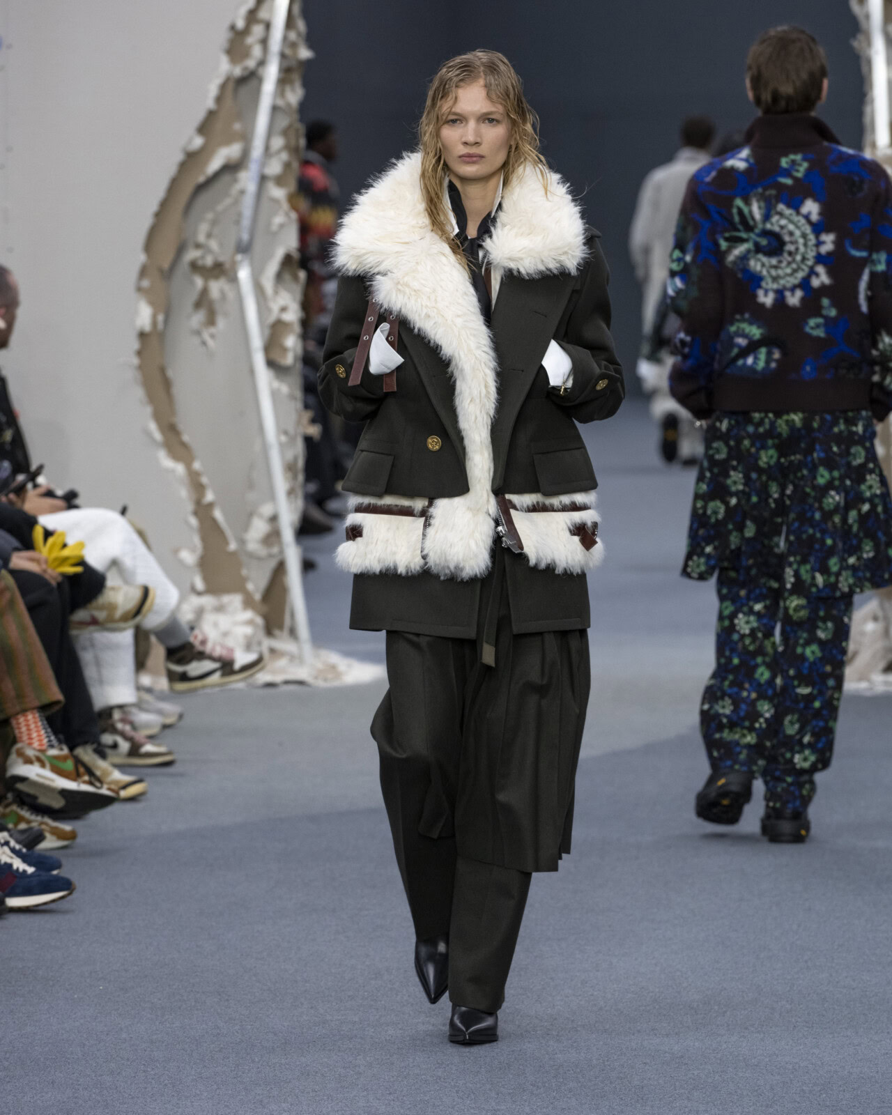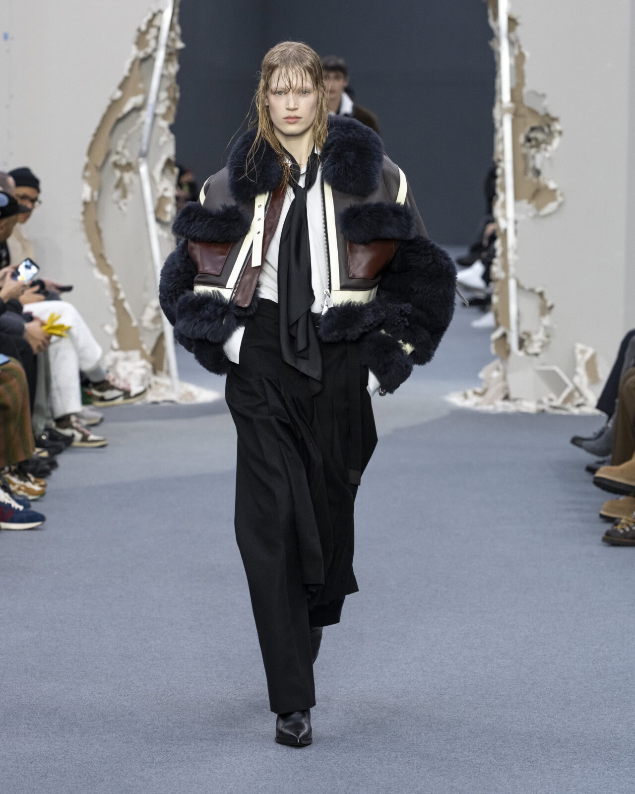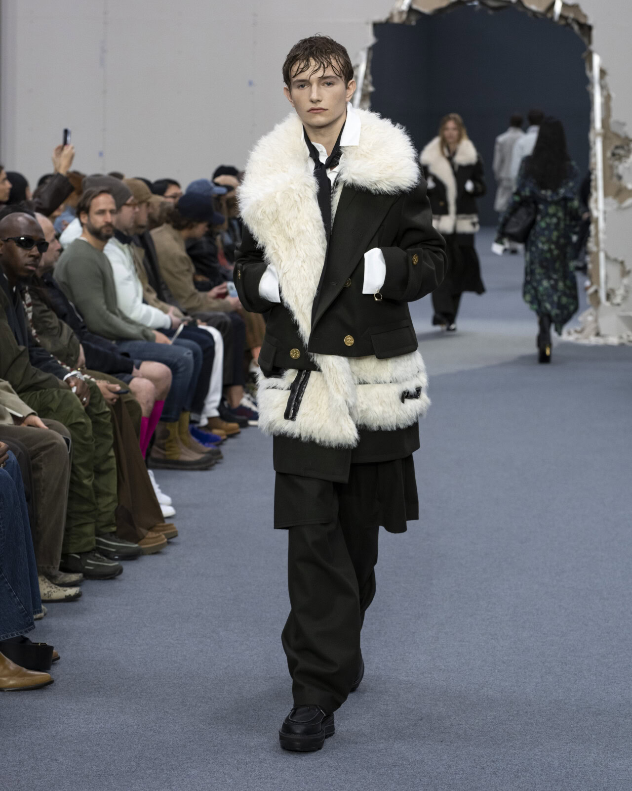 Michel Gaubert provided one of the week’s most memorable soundtracks, which bounced from Freddie Mercury bellowing “I want to break free” through to a menacing Charli xcx number from the Brat tour before a wholesome bit of Tears for Fears’s Everybody Wants To Rule The World to close things out. The chopping and changing played nicely with the collage of different design ideas. It began with the classic tuxedo, with jackets now sliced and pieced back together in interesting finishes. Then came an outerwear-heavy section including bombers that were elongated into trench coats and cloaked in shaggy fake fur and tweed-on-tweed looks that were plucked at to create an interesting fraying effect that bounced as the models walked.