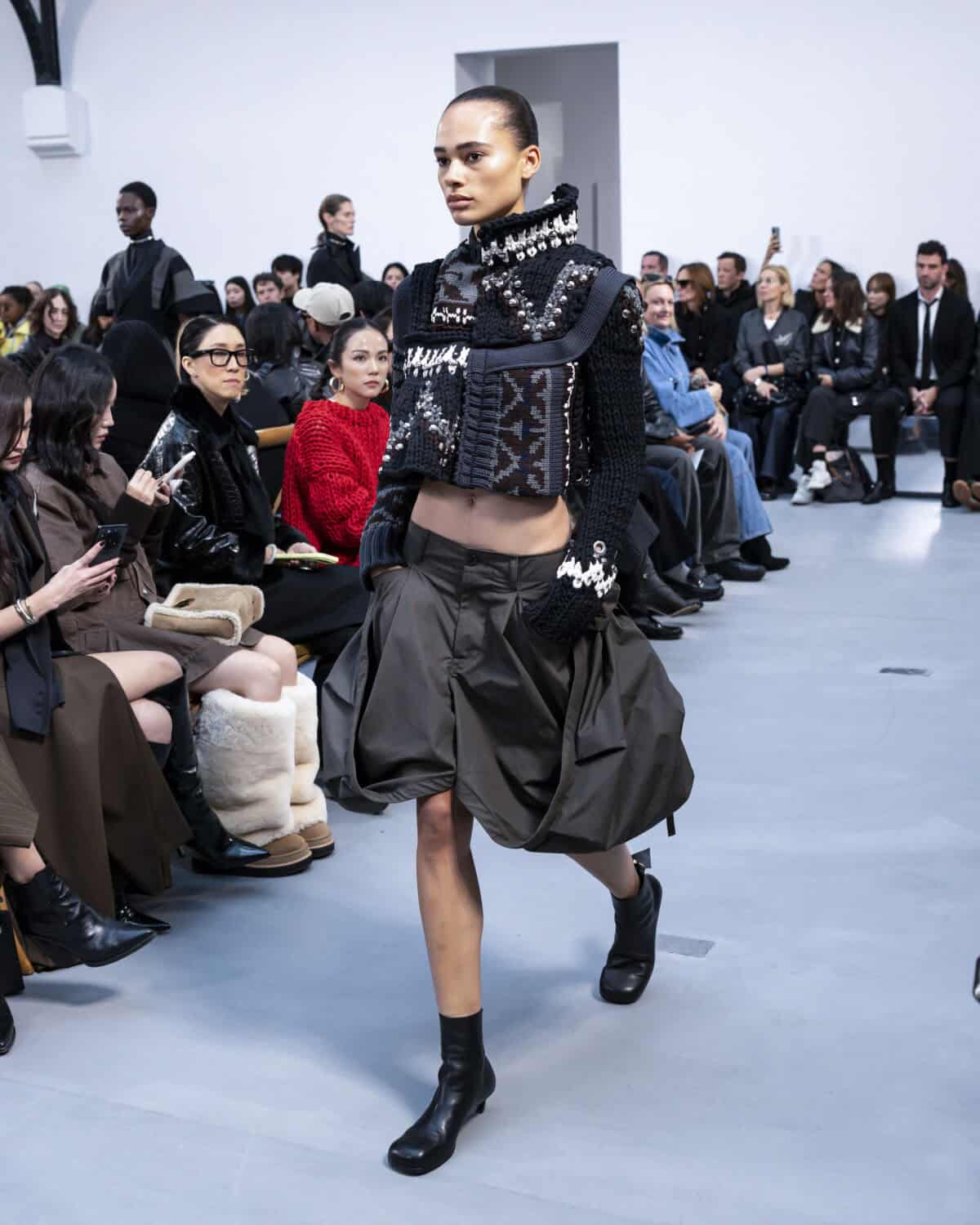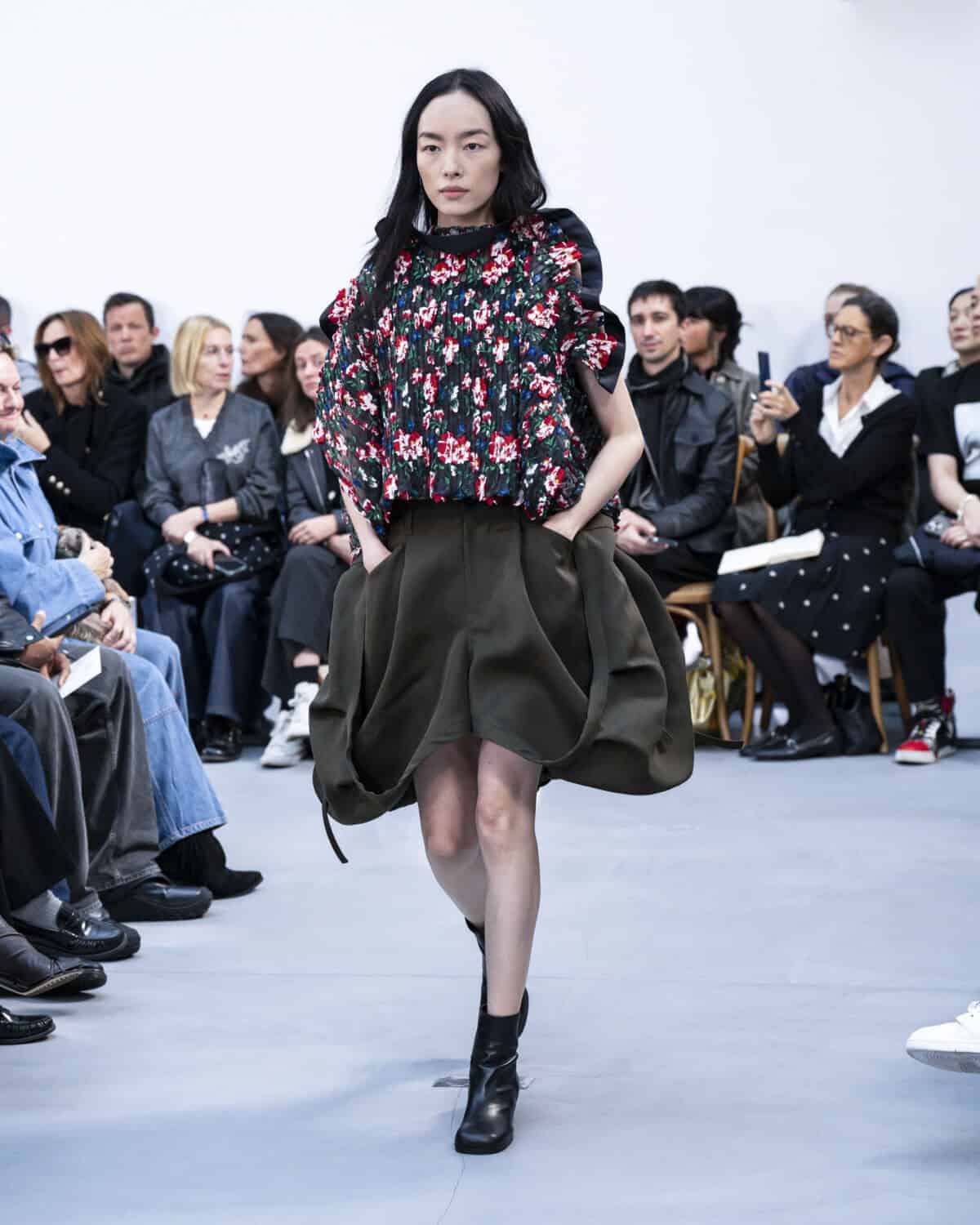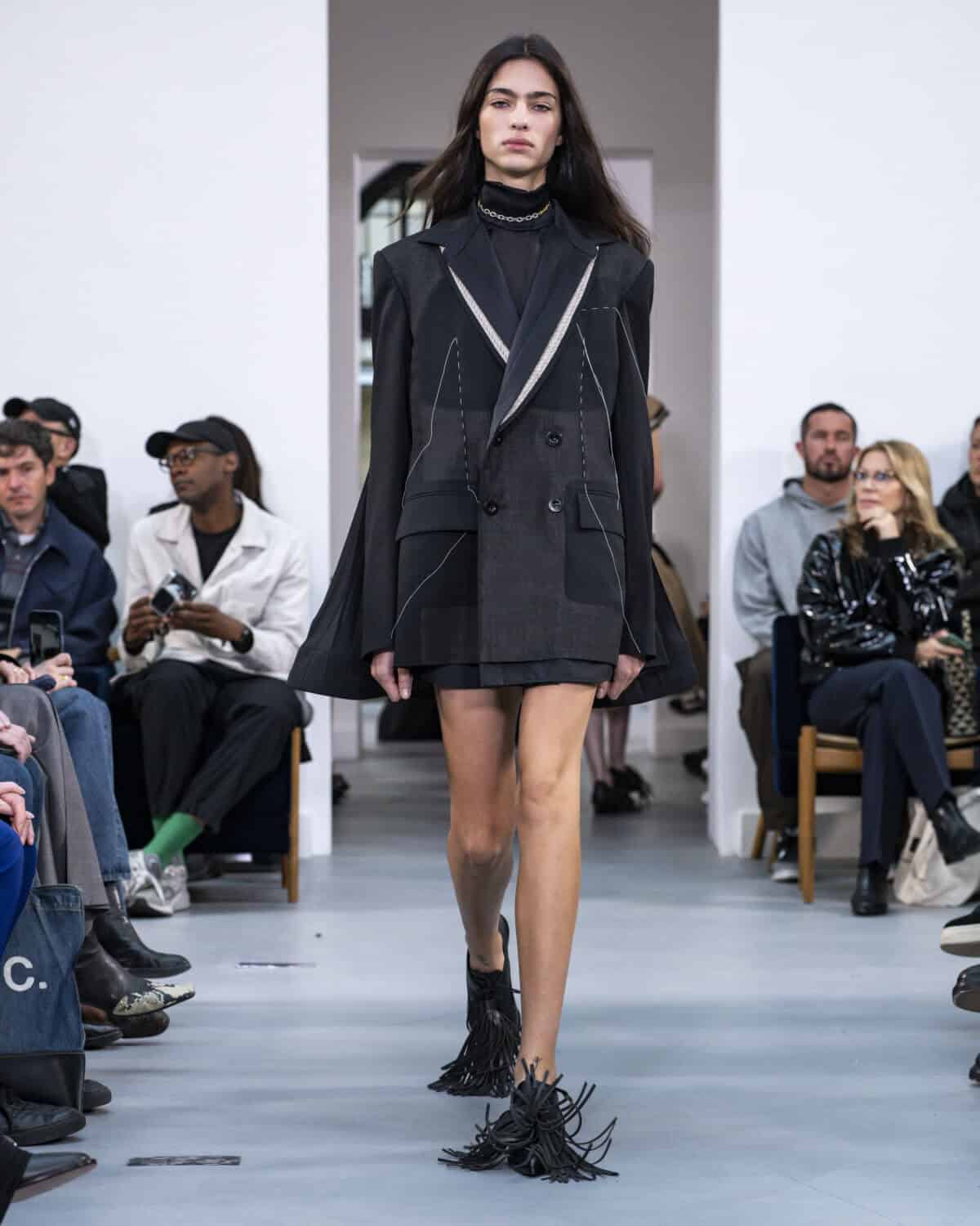 For her SS26 collection she turned up the dial on her miss-matched designs, modelled on an all-star cast including Naomi Campbell, Eva Herzigová and Mariacarla Boscono. Here sculptural blazers were welded with parkas and cropped above the waist to create coats that jutted outwards elegantly with utilitarian flair. Elsewhere, rain macs became big skirts and jeans were sliced and pulled over the shoulders to become outlandish cape-like structures. There’s always plenty to marvel at when it comes to the Sacai team’s pattern-cutting skills. Shredded patches of tweed were bulldozed into one another to make dresses that dripped in fringing, while leather pieces came jigsawed together to create glossy jacket and skirt matching sets.