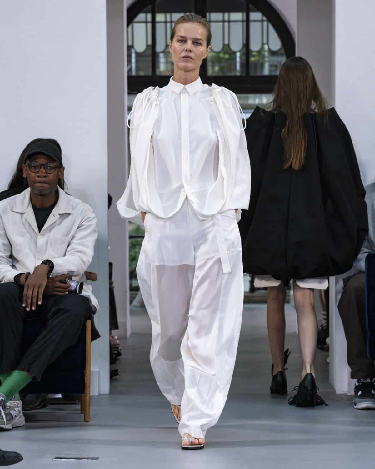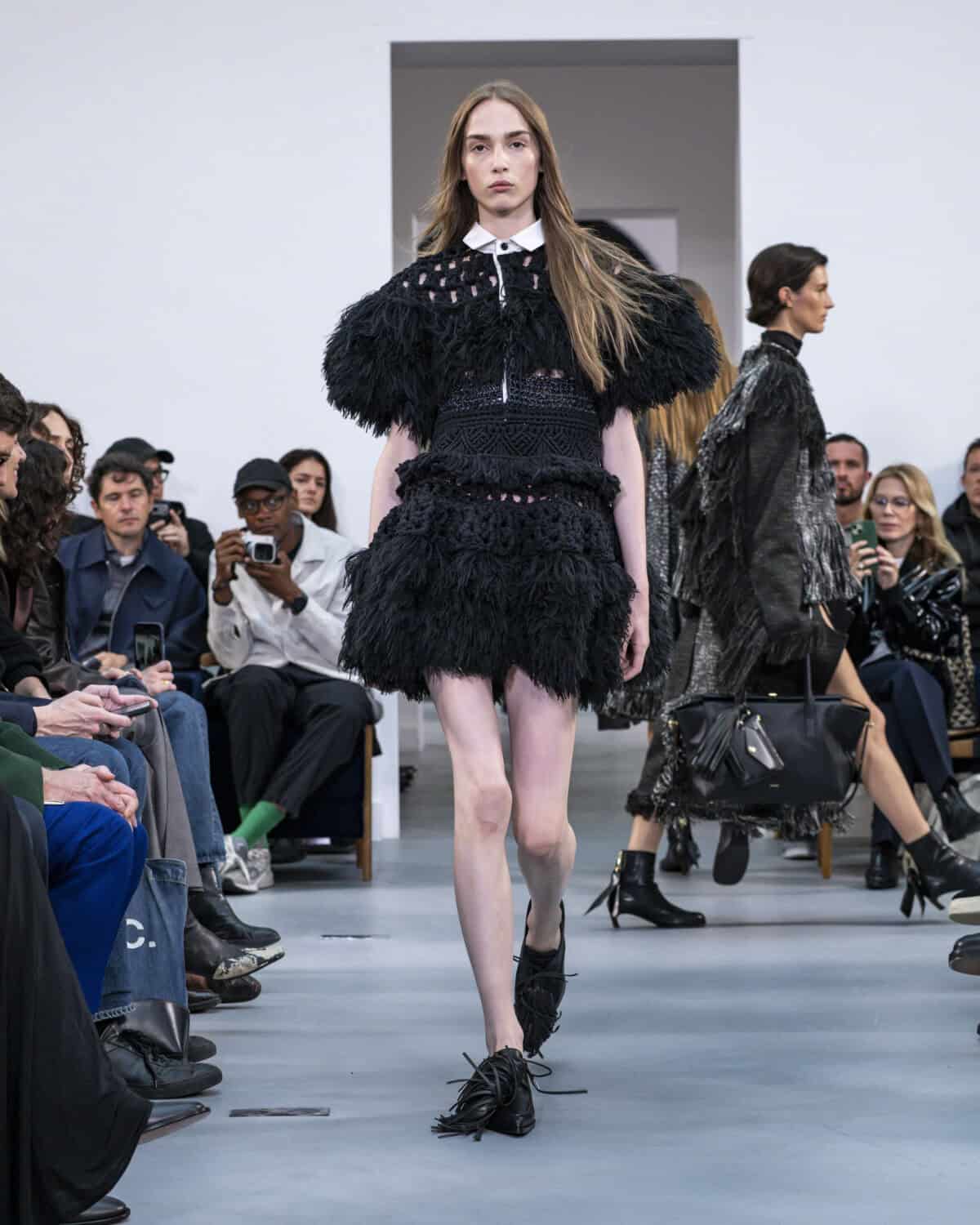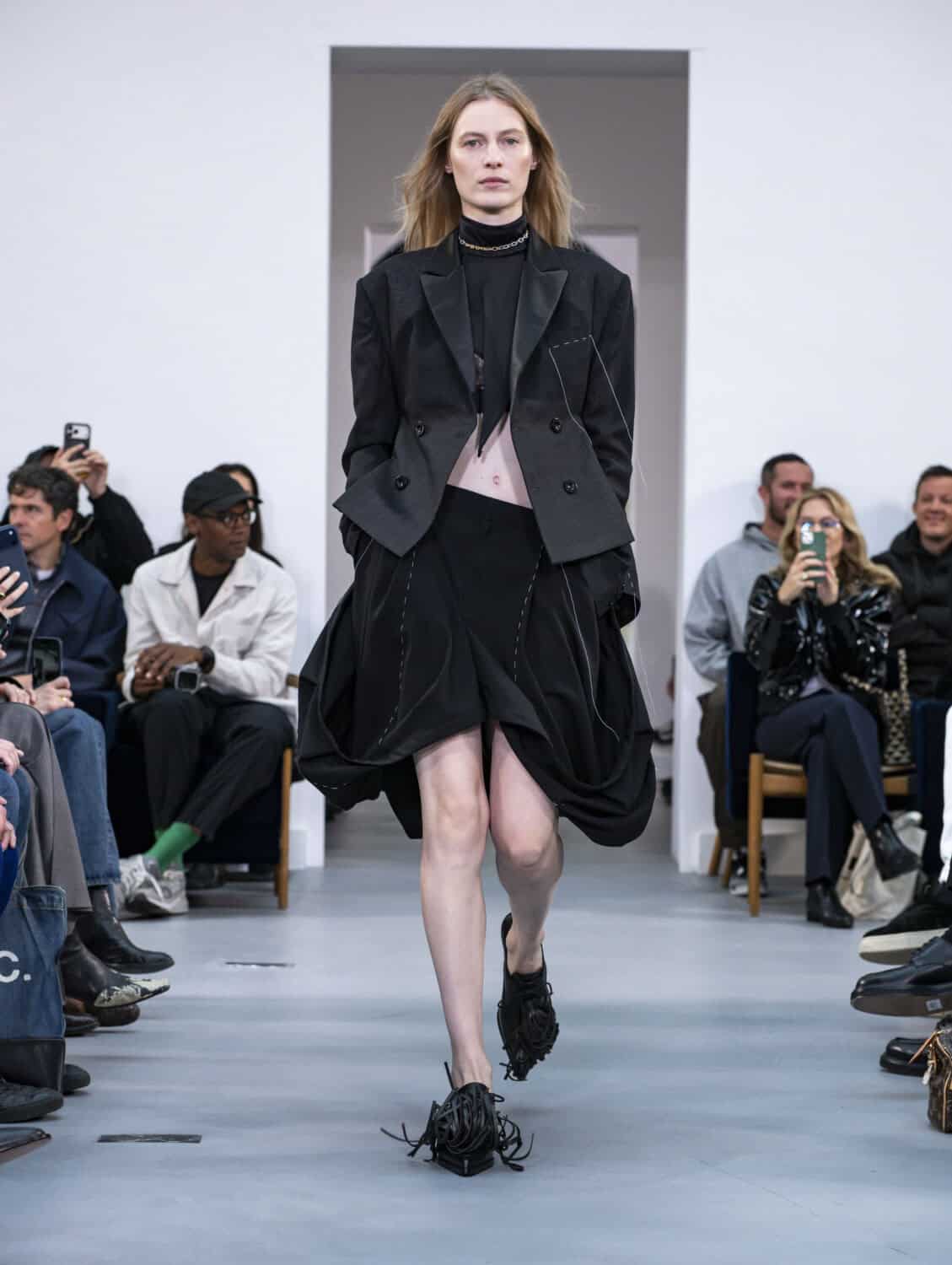 For her SS26 collection she turned up the dial on her miss-matched designs, modelled on an all-star cast including Naomi Campbell, Eva Herzigová and Mariacarla Boscono. Here sculptural blazers were welded with parkas and cropped above the waist to create coats that jutted outwards elegantly with utilitarian flair. Elsewhere, rain macs became big skirts and jeans were sliced and pulled over the shoulders to become outlandish cape-like structures. There’s always plenty to marvel at when it comes to the Sacai team’s pattern-cutting skills. Shredded patches of tweed were bulldozed into one another to make dresses that dripped in fringing, while leather pieces came jigsawed together to create glossy jacket and skirt matching sets.