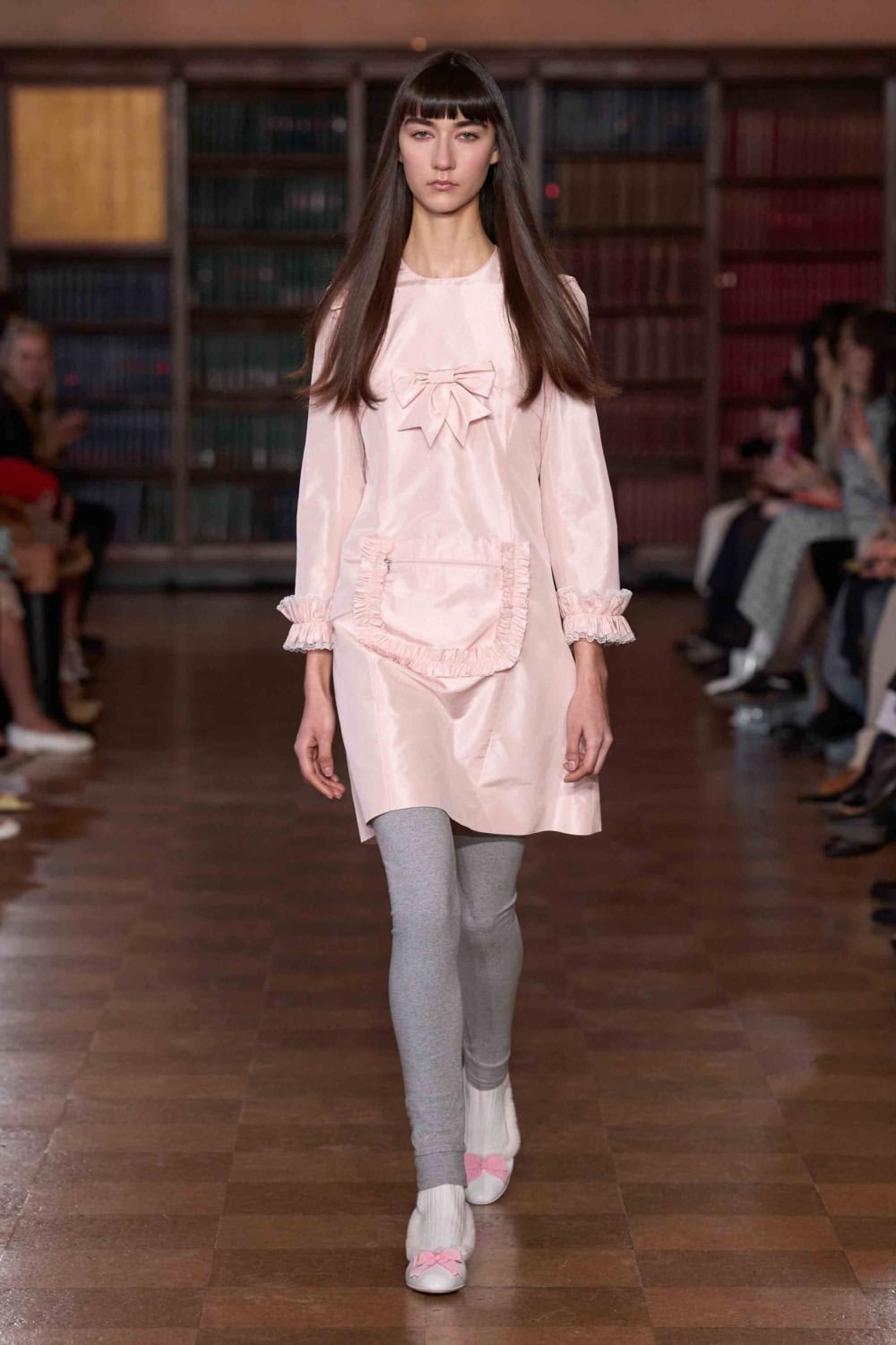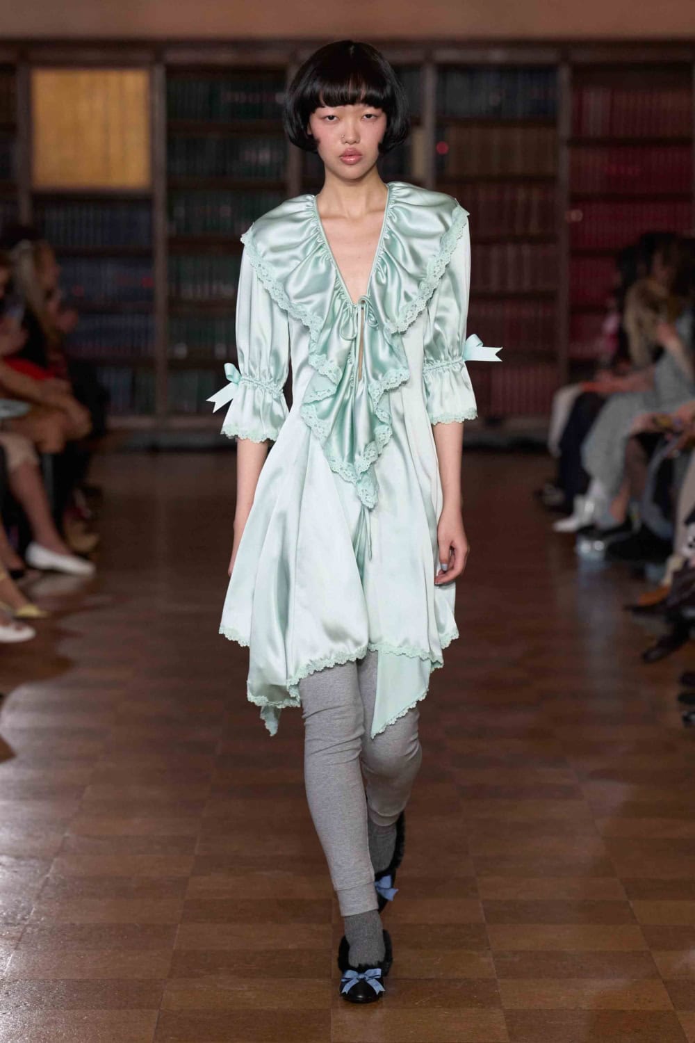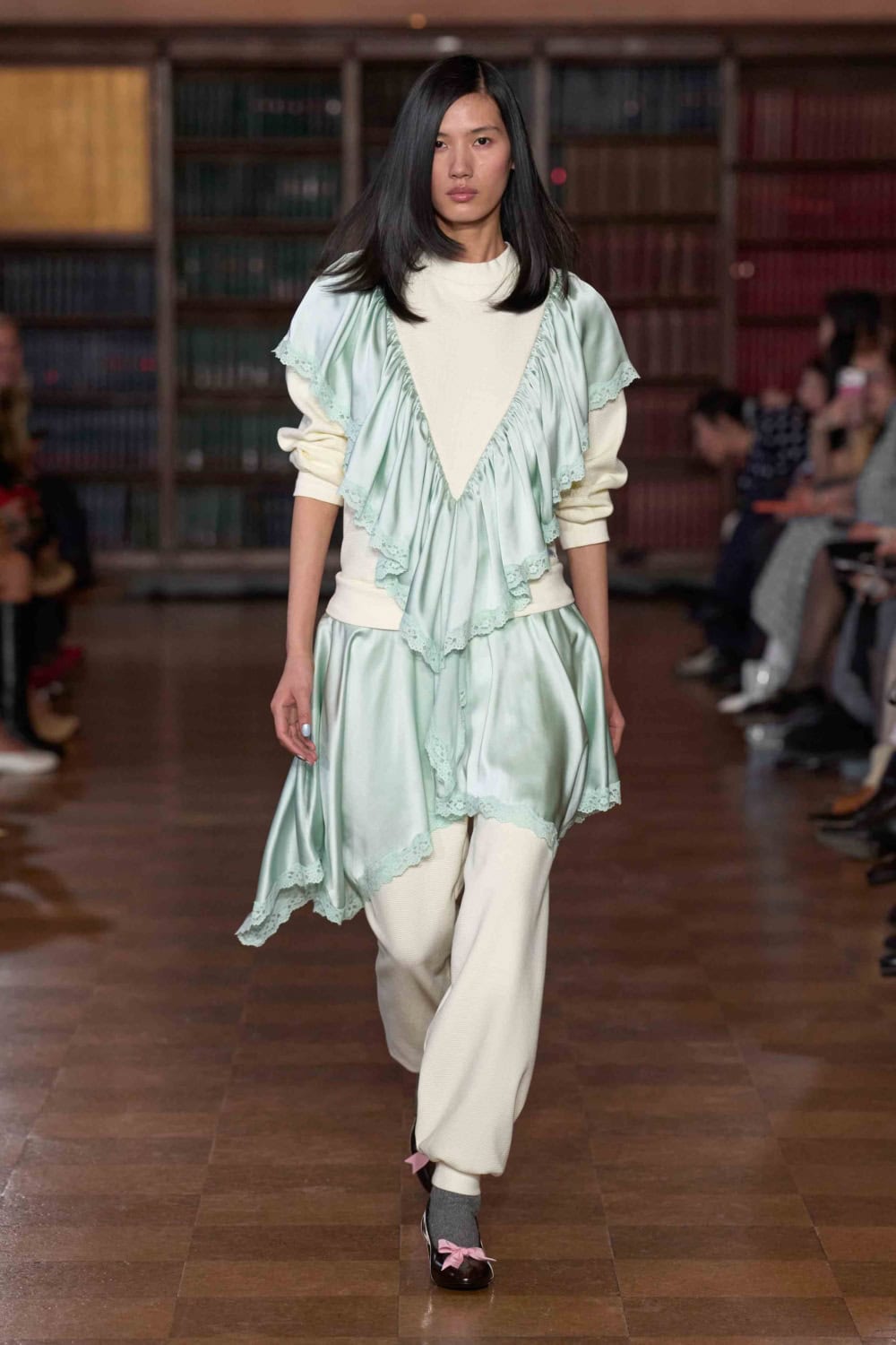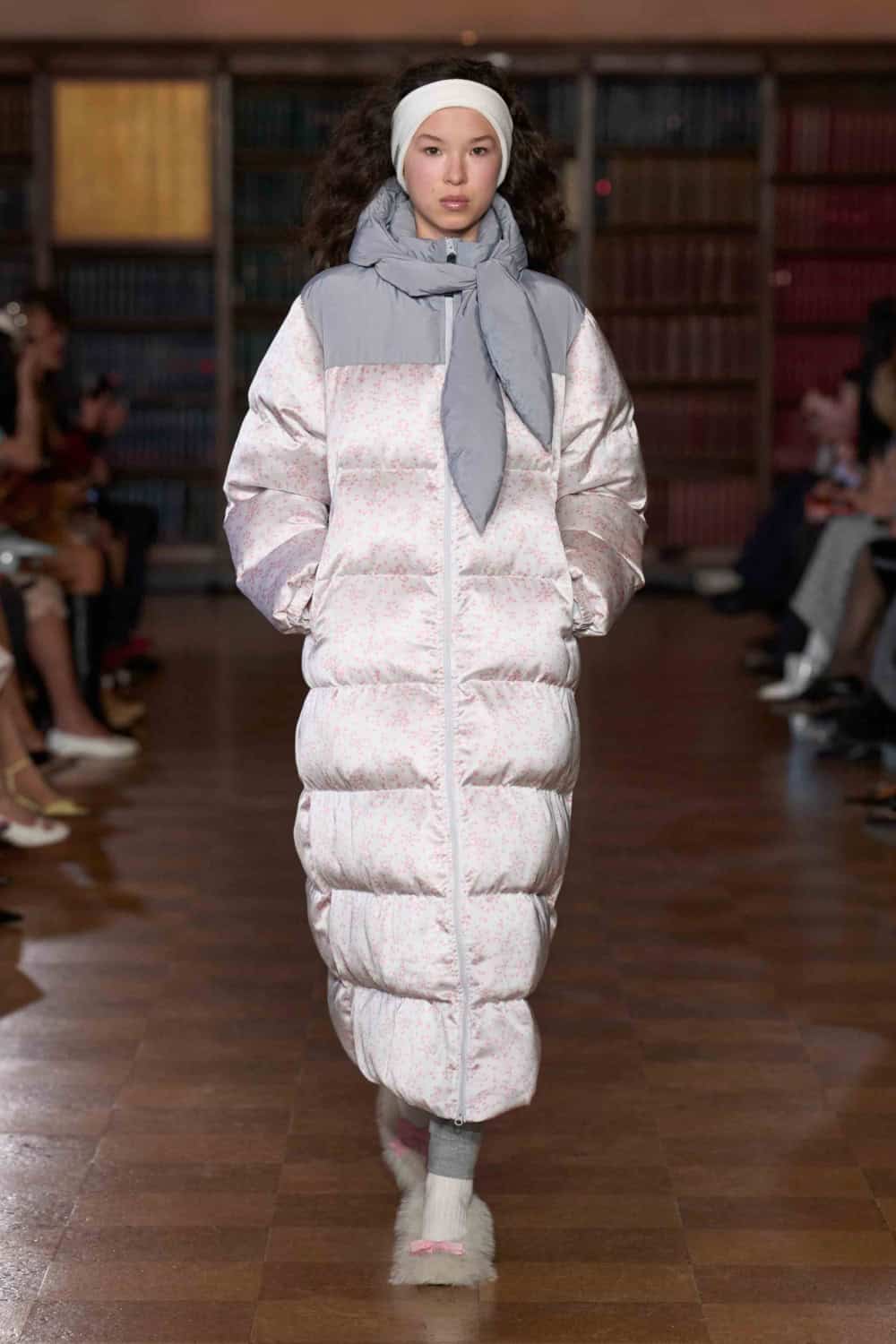 A Sandy Liang show tends to play with the fantastical – wading around through the impulsive id, and pulling up the trinkets and symbols of childhood. For AW26, the brand’s rational ego clocked in to produce a collection that still twists the idea of bedroom comfort but makes it relevant for New York’s current brutal winter. It’s a tremendous ask to go out and look good when there’s month-old snow that’s now a tri-colour of brown, black and yellow alongside punishing winds bringing the temperature down to the negatives. To this, the collection says, if we must go out, let’s not debate comfort versus cuteness, we can shamelessly have (or rather be) both.
