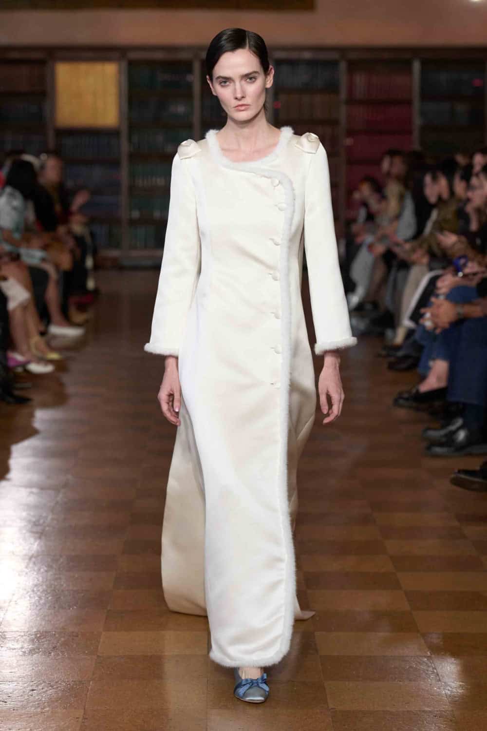 Continuing this experiment with casual formalwear, cosy thermal leggings were seen peeking out of most looks, paired with a contrasting knit sock into a series of kawaii yet practical footwear. In this series there was an opera shoe transformed by a shearling muff rim that foreshortened the foot into a doll-like slipper, a slipper with a shearling bob that seemed to dust the floor as it walked by, and the sure to be iconic floppy eared heel that looked like you threw on Mochi’s dog toy Lamb Chop for a quick errand. For heels, they all seemed as warm and soft as a house shoe, yet far more likely to delight at the function or even pooled at the doormat. Why dread leaving home when we can just wear it out?