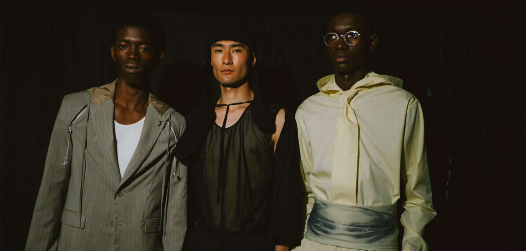 He called the collection Embrace, thinking about how men interact in shared movement. Dancers walked the catwalk then were joined in pairs, clinging close to one another. You didn’t know if they were lovers, brothers or strangers, the nature of their relationship was left ambiguous. There was a push and pull tension to many of the pieces. While cupro shirts hung loosely from the body, compression tops stamped with hand prints and Henley shirts – bulging at the chest to expose one nipple thanks to an asymmetric fastening – were suctioned to the body, mimicking the feeling of being held.