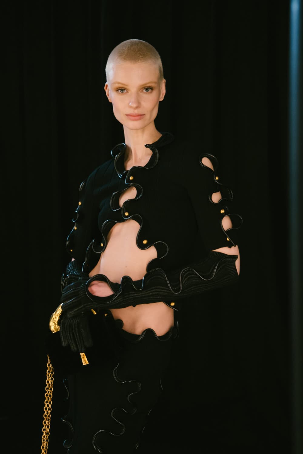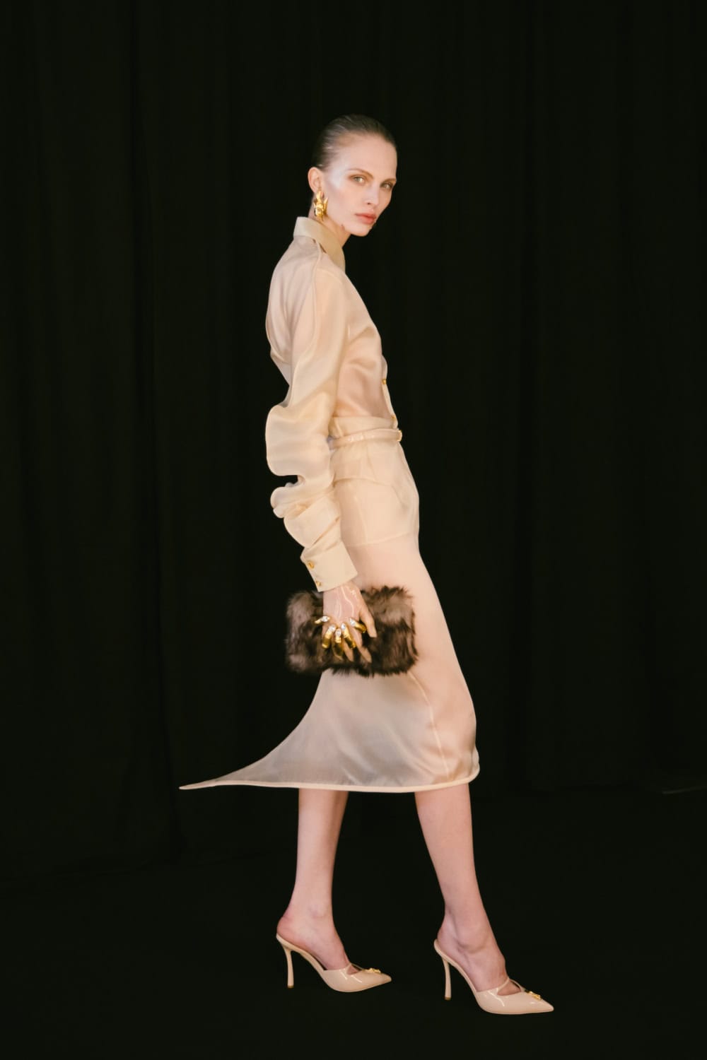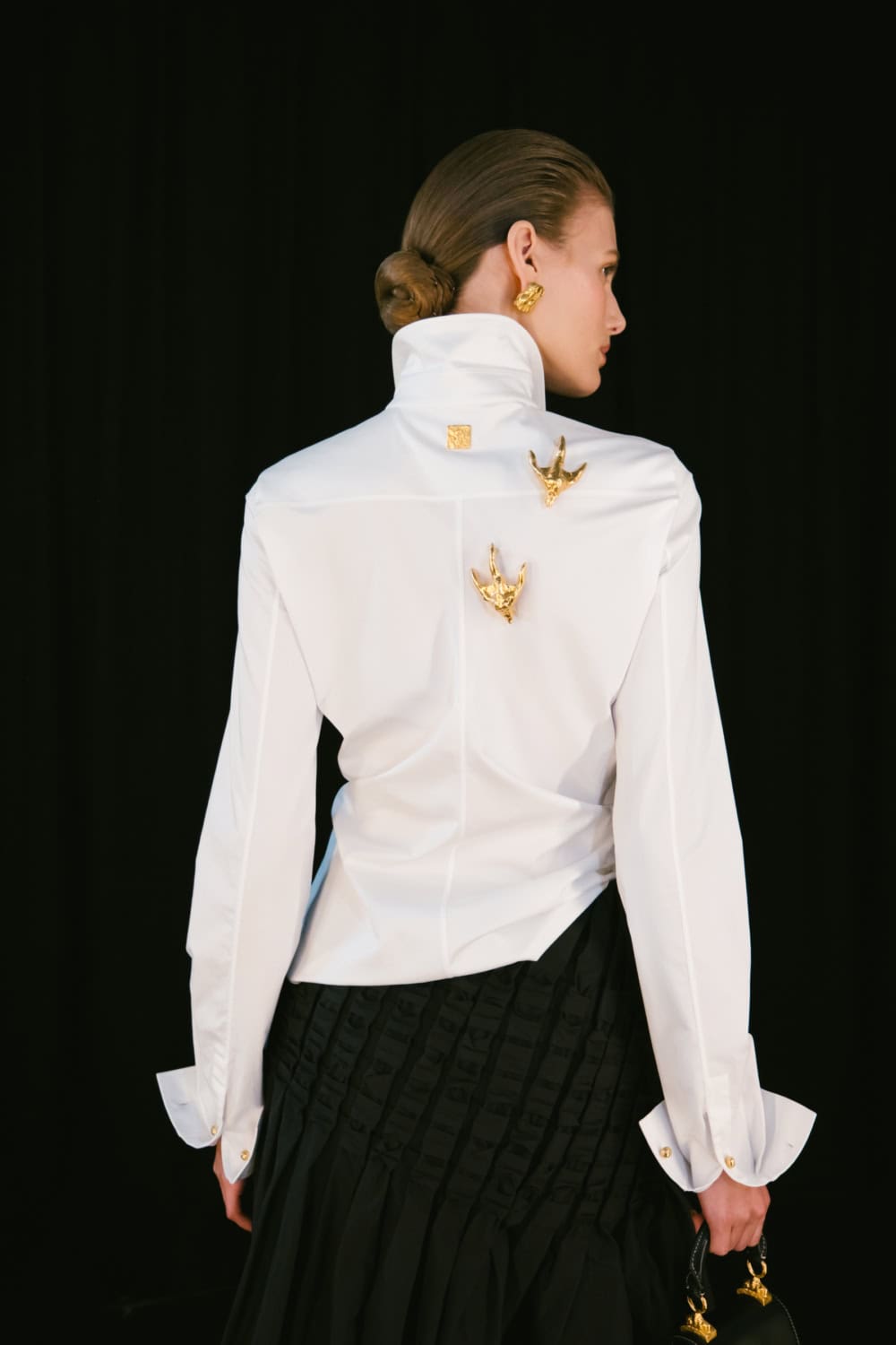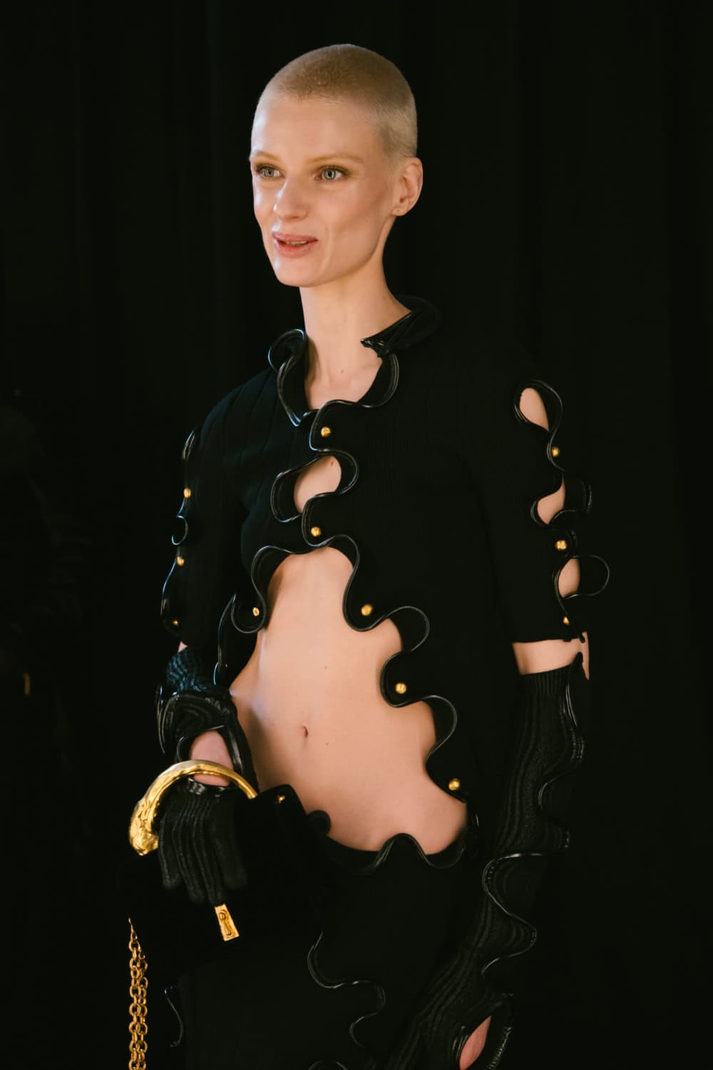 Here, slouchy suiting was styled with shirts whose razor-sharp collars were popped high, and in the details – the devil was very much there. Bold Schiaparelli gold buttons ran down a blouse shaped like a head, then a bust, finishing in tiny feet. A silky jersey second-skin gown featured a literal keyhole cut-out, while sculpted silhouettes pushed anatomy into focus with jutted hips and semi-pointed breasts.