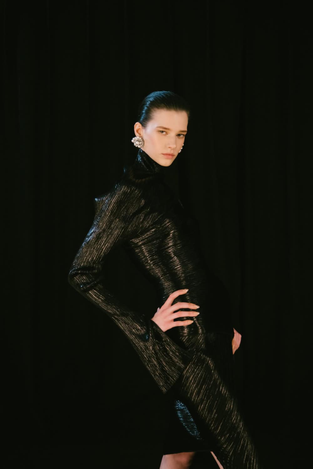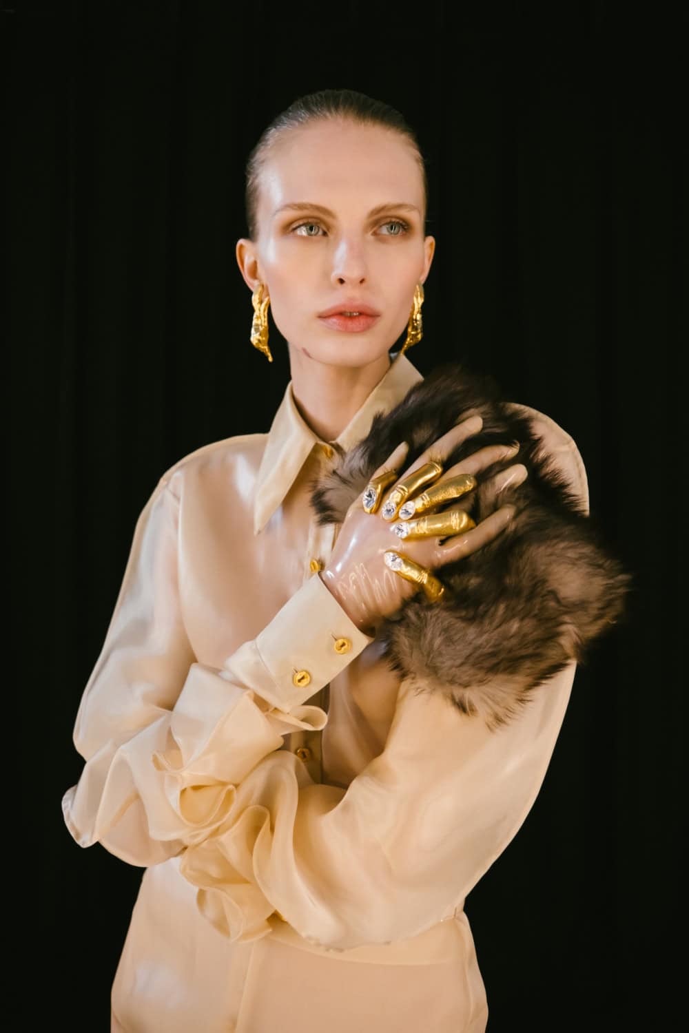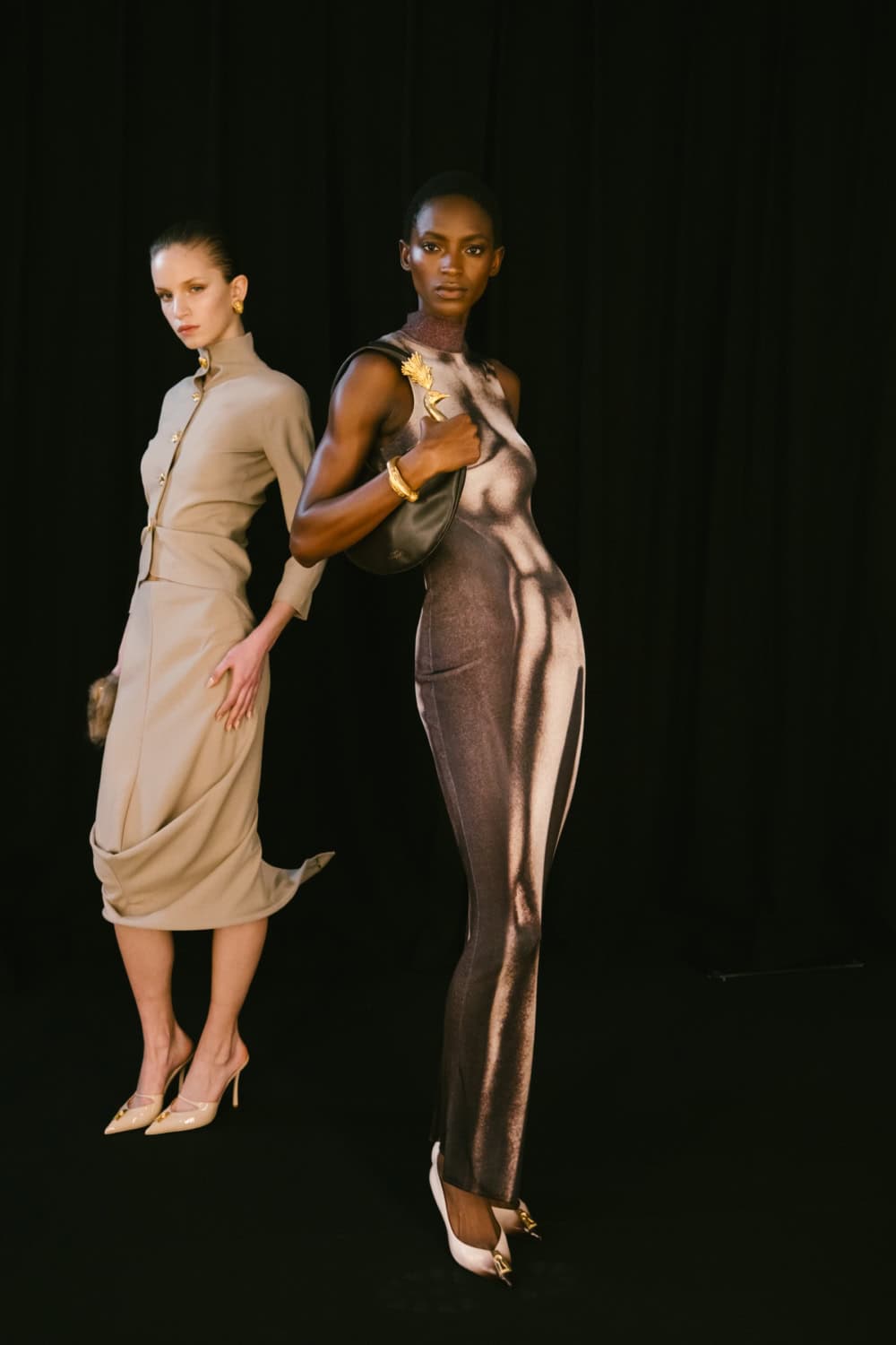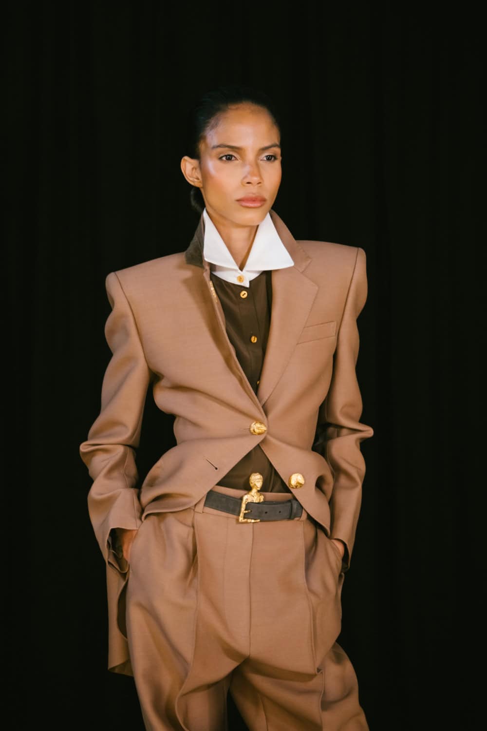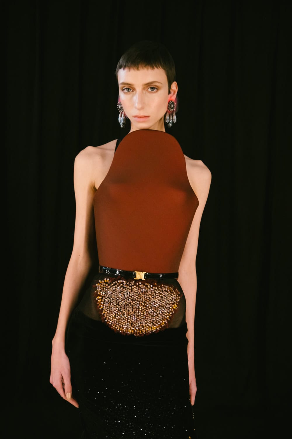 Here, slouchy suiting was styled with shirts whose razor-sharp collars were popped high, and in the details – the devil was very much there. Bold Schiaparelli gold buttons ran down a blouse shaped like a head, then a bust, finishing in tiny feet. A silky jersey second-skin gown featured a literal keyhole cut-out, while sculpted silhouettes pushed anatomy into focus with jutted hips and semi-pointed breasts.