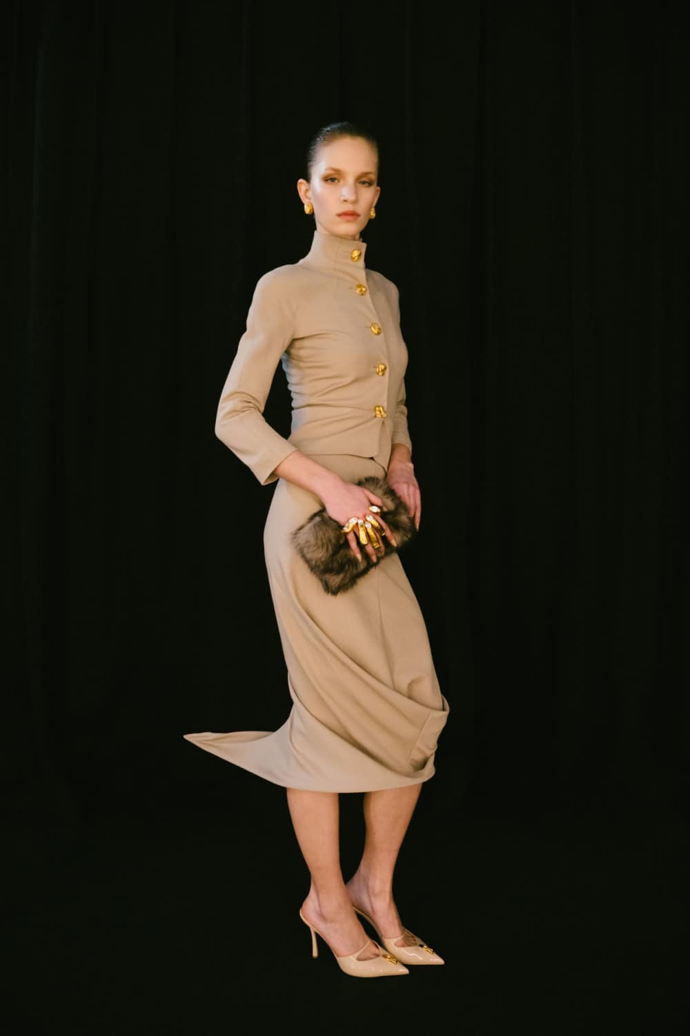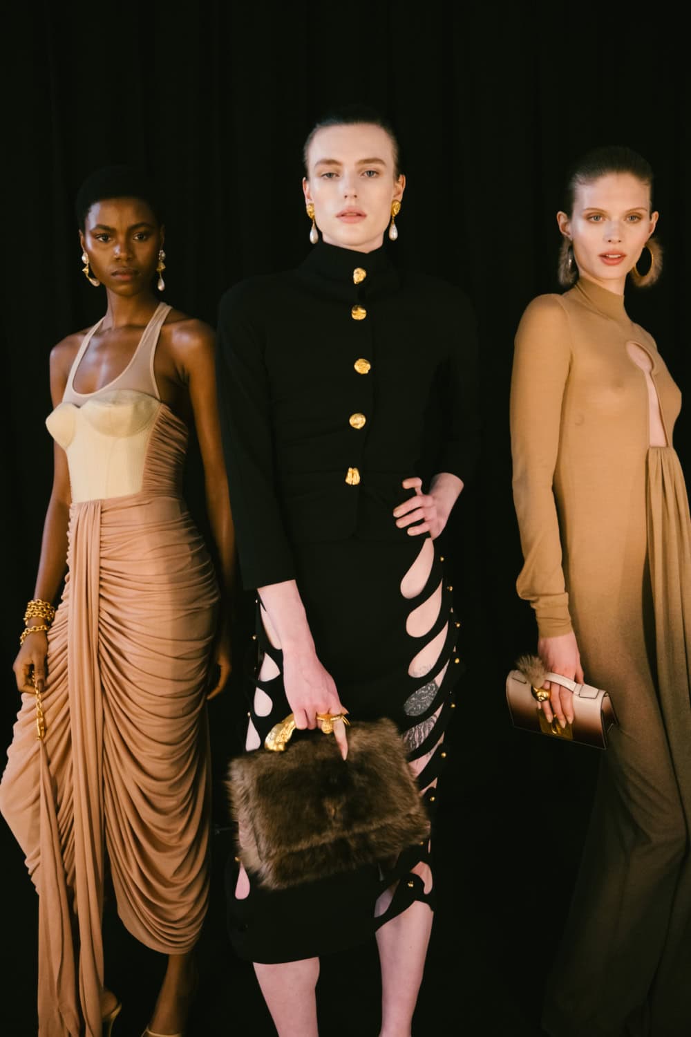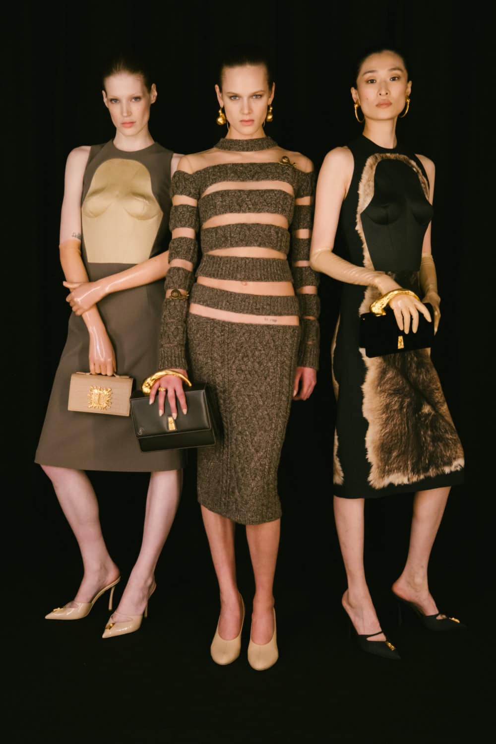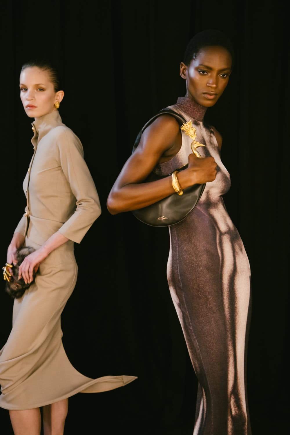 Here, slouchy suiting was styled with shirts whose razor-sharp collars were popped high, and in the details – the devil was very much there. Bold Schiaparelli gold buttons ran down a blouse shaped like a head, then a bust, finishing in tiny feet. A silky jersey second-skin gown featured a literal keyhole cut-out, while sculpted silhouettes pushed anatomy into focus with jutted hips and semi-pointed breasts.