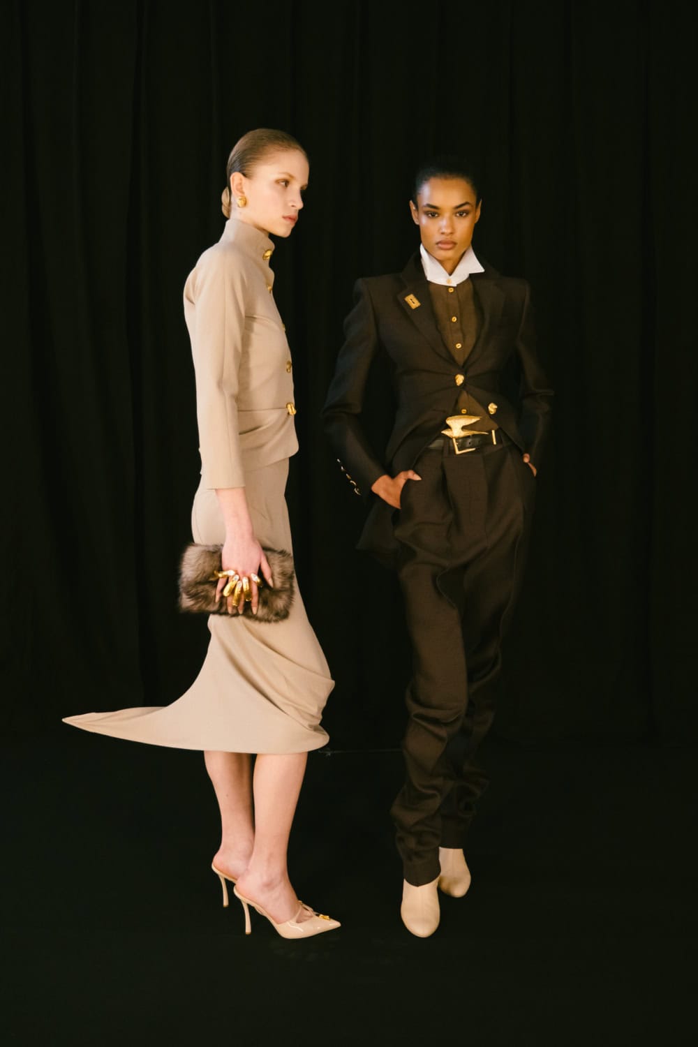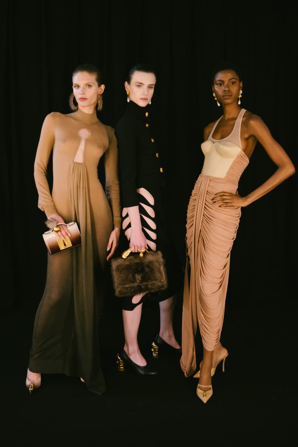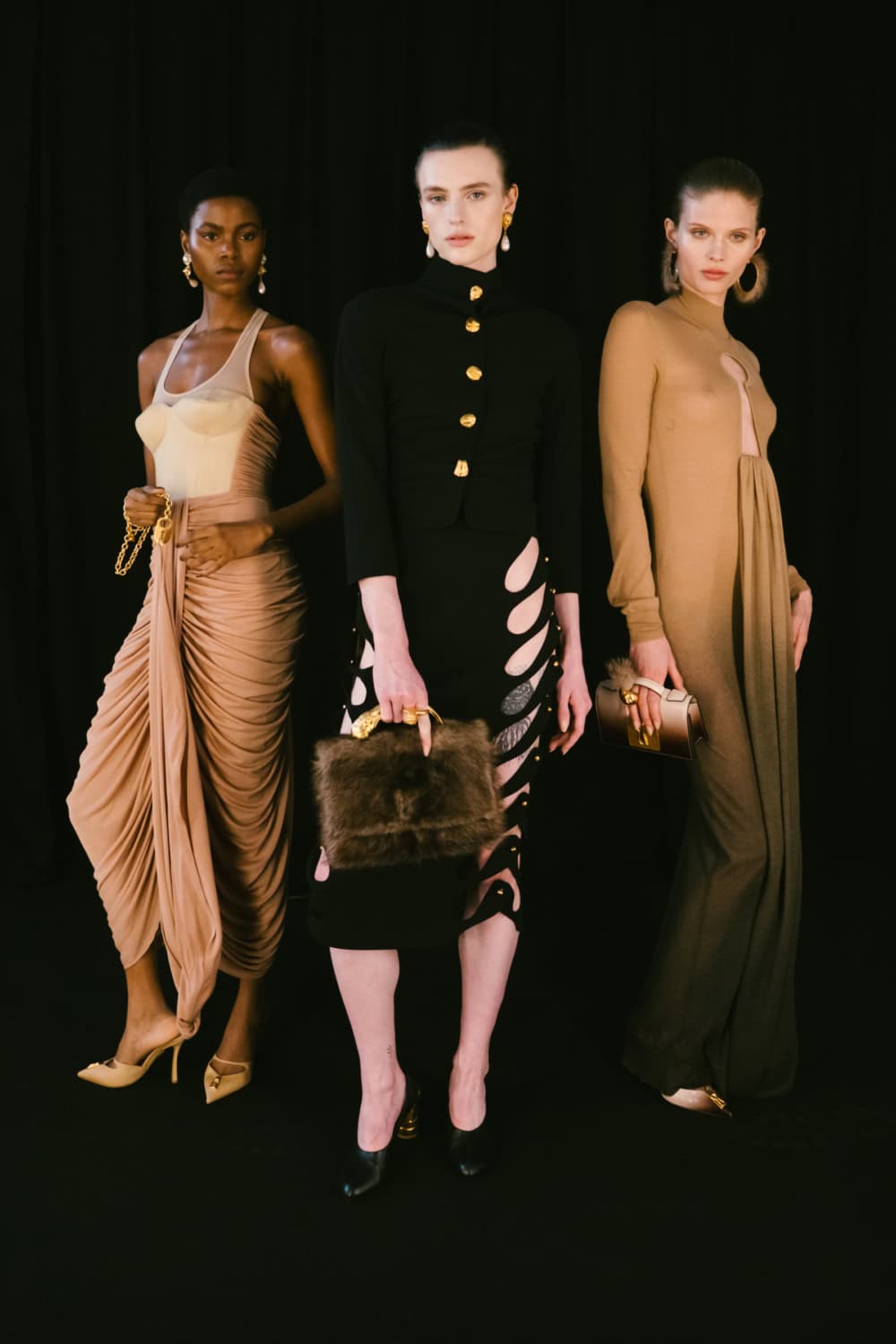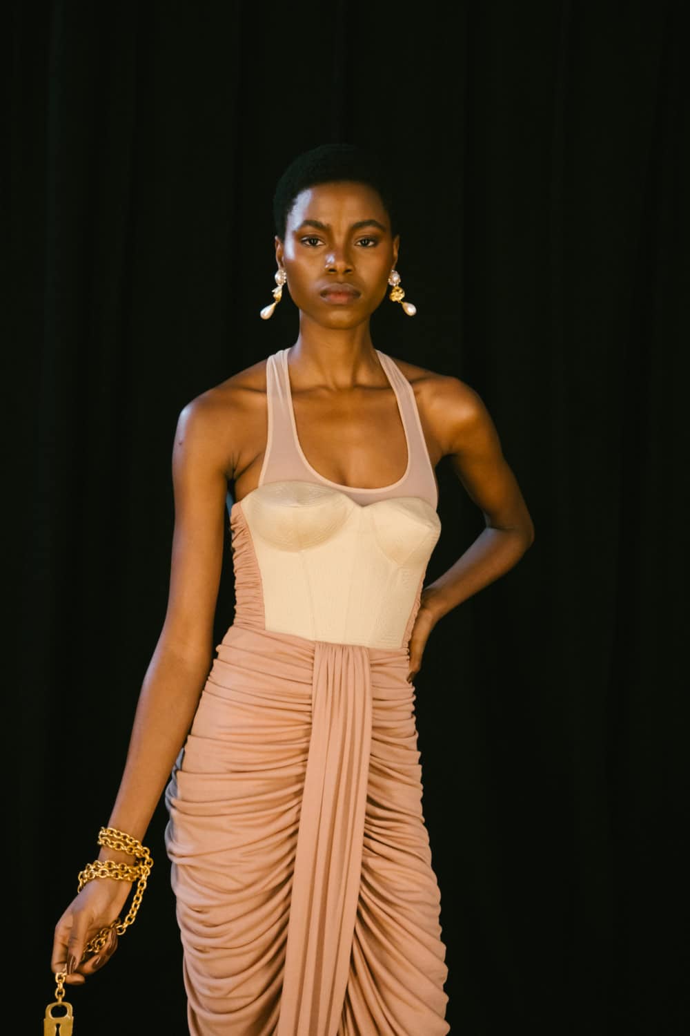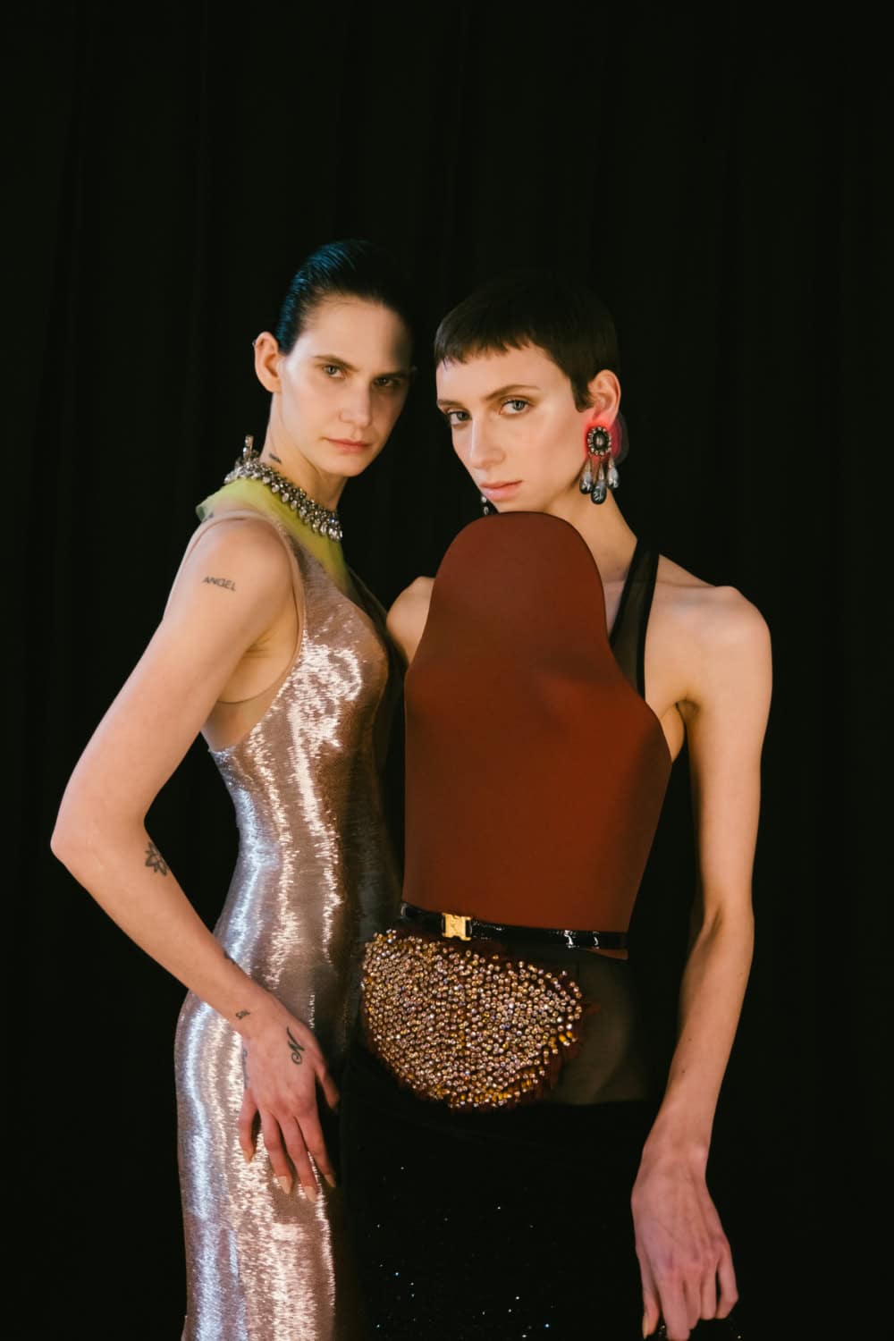 Here, slouchy suiting was styled with shirts whose razor-sharp collars were popped high, and in the details – the devil was very much there. Bold Schiaparelli gold buttons ran down a blouse shaped like a head, then a bust, finishing in tiny feet. A silky jersey second-skin gown featured a literal keyhole cut-out, while sculpted silhouettes pushed anatomy into focus with jutted hips and semi-pointed breasts.