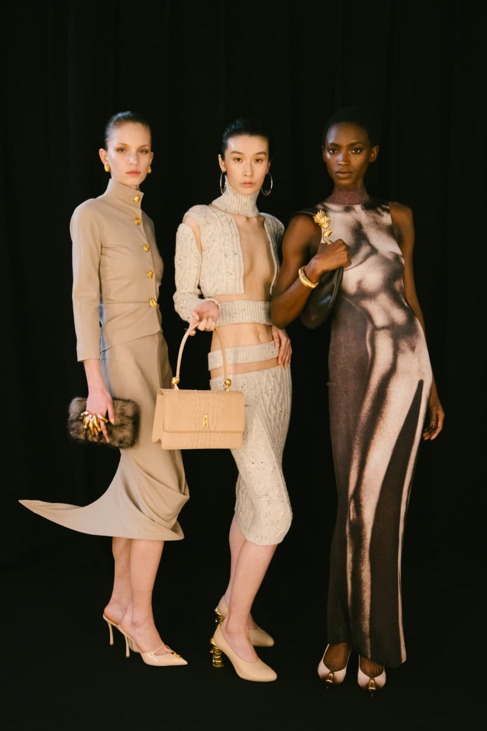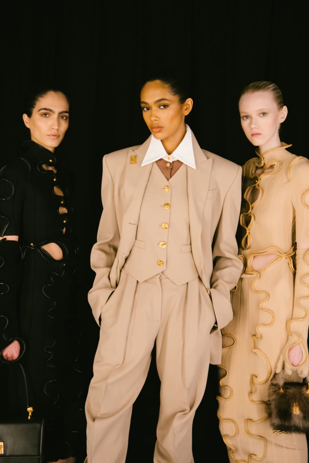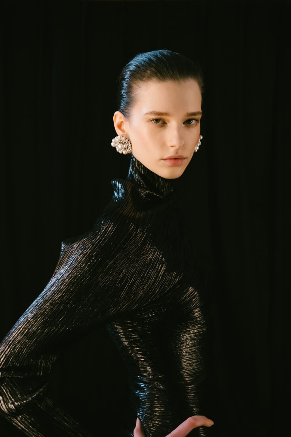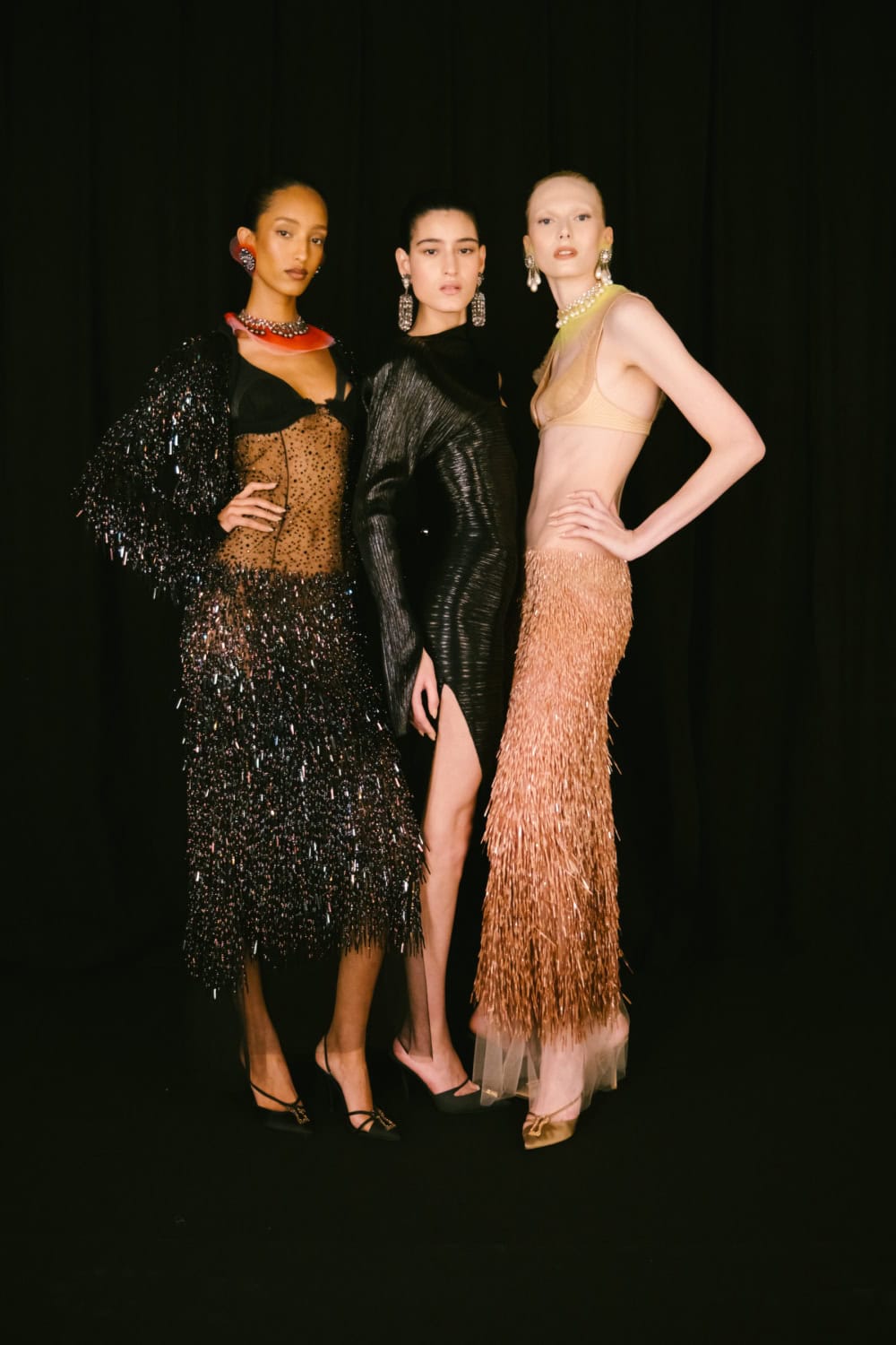 Here, slouchy suiting was styled with shirts whose razor-sharp collars were popped high, and in the details – the devil was very much there. Bold Schiaparelli gold buttons ran down a blouse shaped like a head, then a bust, finishing in tiny feet. A silky jersey second-skin gown featured a literal keyhole cut-out, while sculpted silhouettes pushed anatomy into focus with jutted hips and semi-pointed breasts.