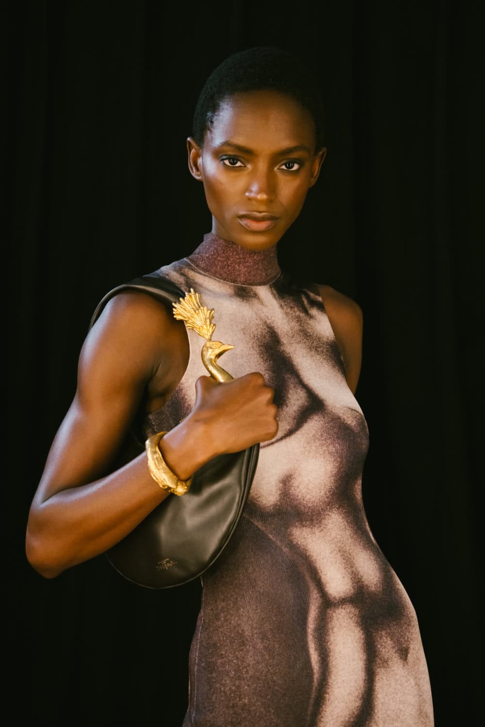 There were gold pleats, dégradé rhinestones, statuesque bodices and a simple body-con turtleneck dress printed with the full figure of a male Greek statue. Alex Consani appeared in a barely-there sculpted bra built into nude mesh that coiled around the neck in bright yellow before dropping into an intricate sequin-tasselled skirt. A dark brown tailcoat trimmed with black ostrich feathers followed.