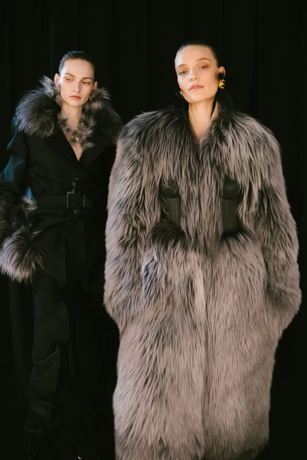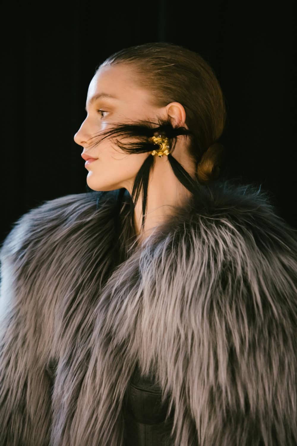 Elsewhere, cable knit jumpers were spliced apart and reassembled with nude mesh panels in between, giving a cut-and-paste lightness to something traditionally heavy. As dresses and suits, liquid black and brown satin rippled like an abyss. A salt-and-pepper faux fur coat came with matching trompe-l’oeil straight-leg jeans – you had to look twice to clock the difference.