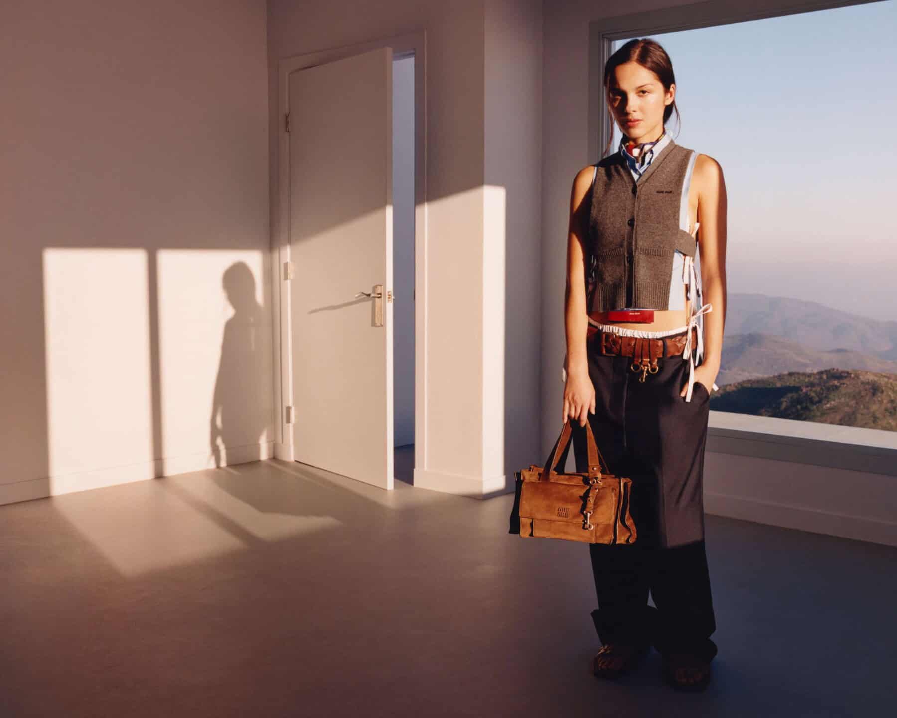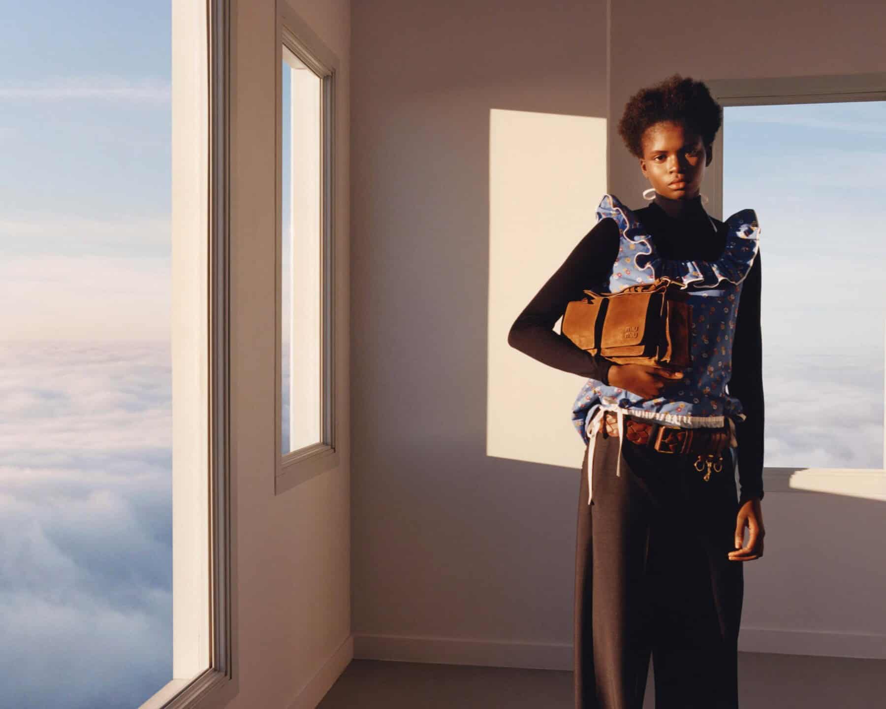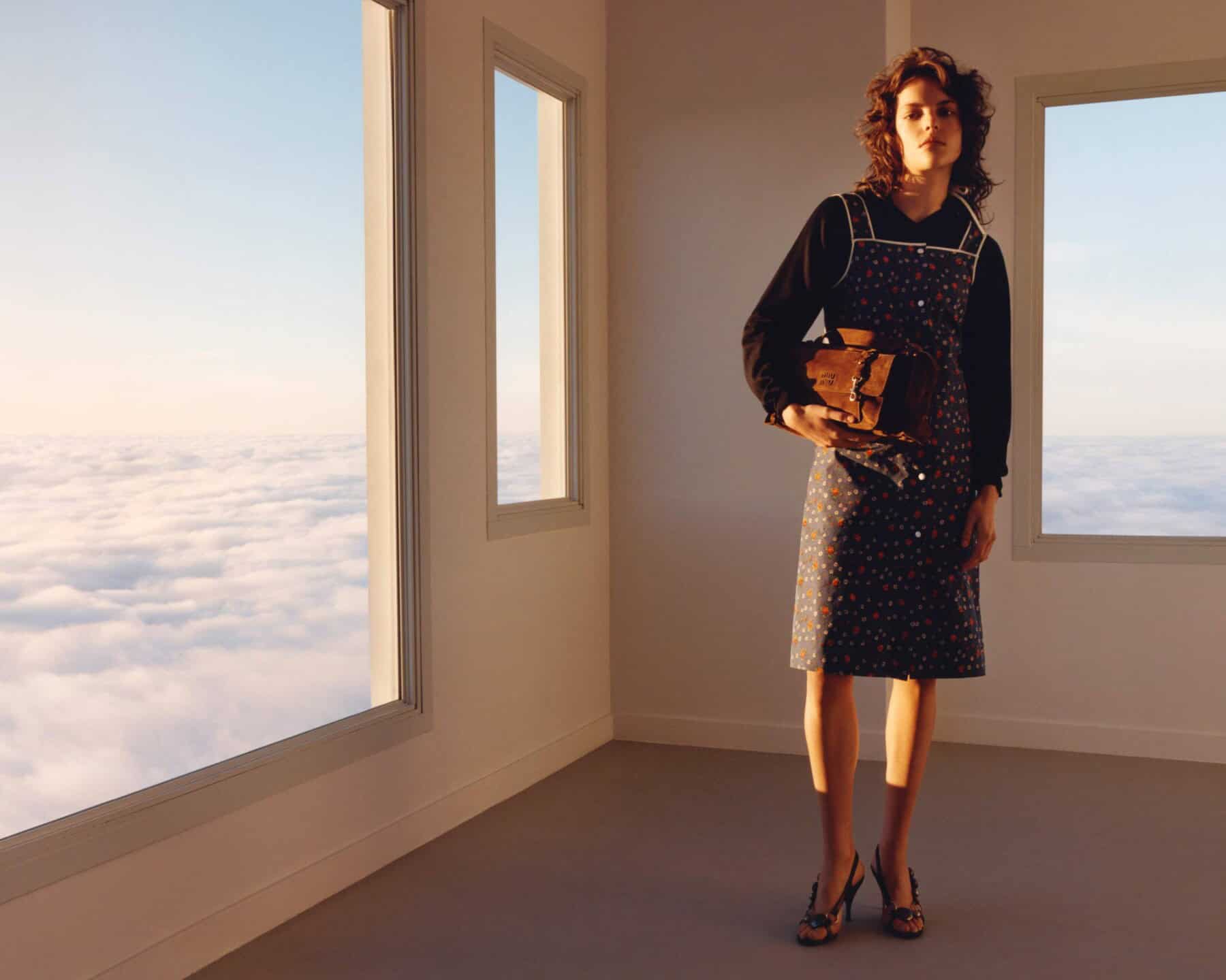 Miu Miu is on top of the world – literally. Captured through the poetic lens of British photographer Jamie Hawkesworth, the house’s SS26 campaign, On Cloud Nine, comes to life in a light-imbued room floating above the treetops. As the sun rises and descends again in the background, the multi-disciplinary cast of the campaign lingers by the windows in looks at once industrial and ultra-feminine. Actress, director and screenwriter Suzanne Lindon’s shadow stretches out on the brightly lit walls as she holds the Utilitaire bag, wearing one of the collection’s signature apron dresses. Meanwhile singer and songwriter Olivia Rodrigo is captured candidly yawning for the camera while rocking a car coat over a crystal-encrusted frock. Alongside others, this campaign paints a romantic picture of the Miu Miu woman in all her multifaceted glory. Cecilia Nuvola Bechini