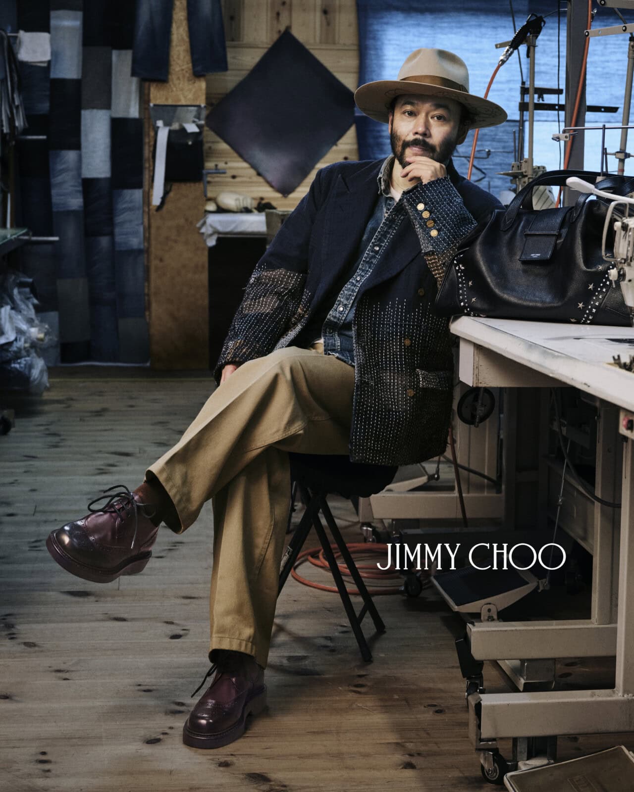 At the centre of the campaign is a trio of “cultural creators” who reflect the multifaceted nature of the Jimmy Choo man: dynamic, innovative and classically modern. First up is Poggy himself. Shot by Takay, the globally-recognised fashion curator is captured in an artisan laboratory wearing the collection’s Rowan Brogue Derby loafers. Next is artist and audio engineer Devon Turnbull (aka OJAS), who appears surrounded by his skilfully-crafted, handmade sound systems – the epitome of functional art, just like the Buff Fringe loafers on his feet.