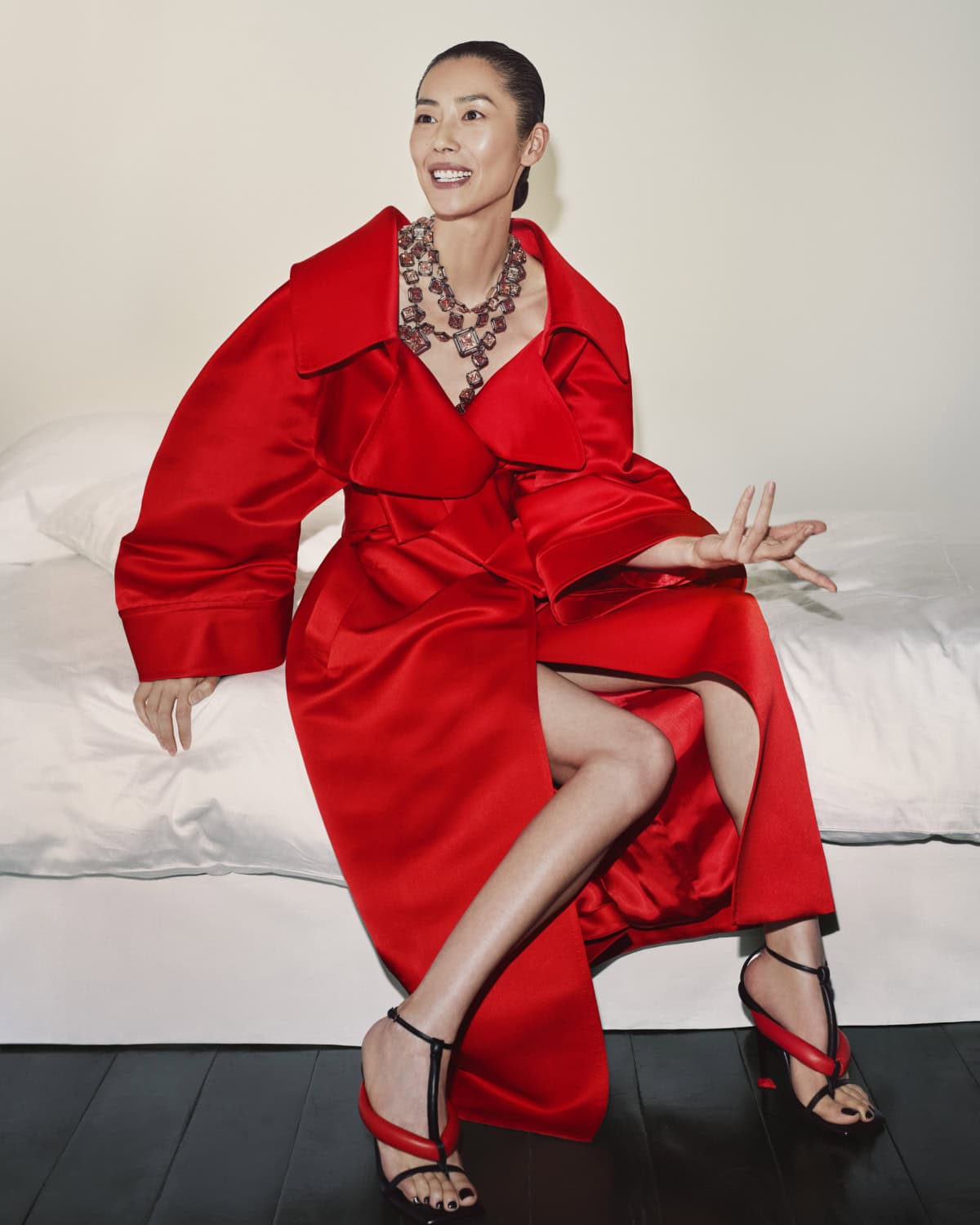 French footballer Kylian Mbappé and Past Lives actress Greta Lee also take pride of place – Lee twirls in a sculptural white knee-length dress replete with statement bows while Mbappé lies languidly across a plush armchair, comfortably dressed in a slate grey logo knit with an icy blue shirt layered underneath. A winning combination if you ask us. EO’G