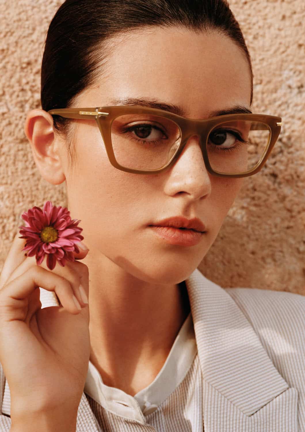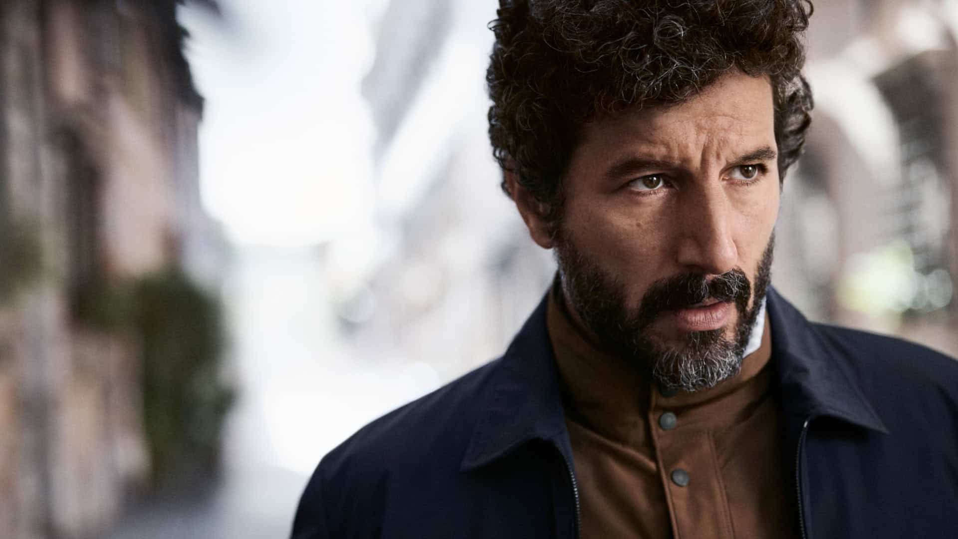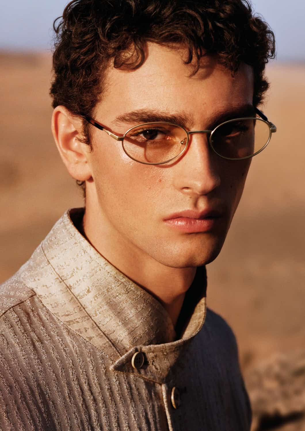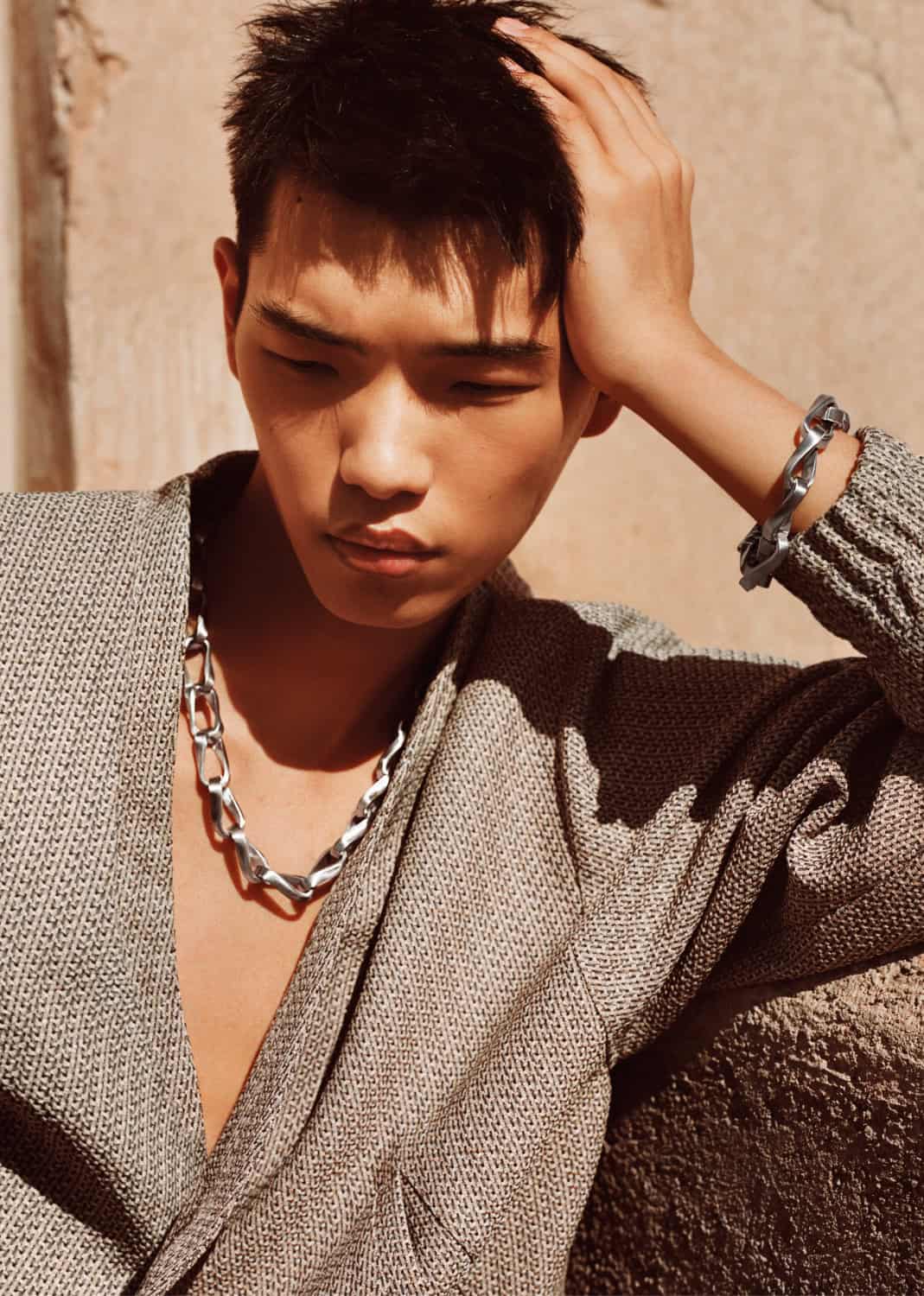 Bathed in pale gold light, the scene frames Diblik’s figure as he sports a single-breasted jacket in ivory linen that drapes with effortless structure by creative director Max Kibardin. Paired with tonal trousers and a minimalist high-collared shirt, the look boasts clean, vertical lines, evoking the brand’s signature quiet sophistication.