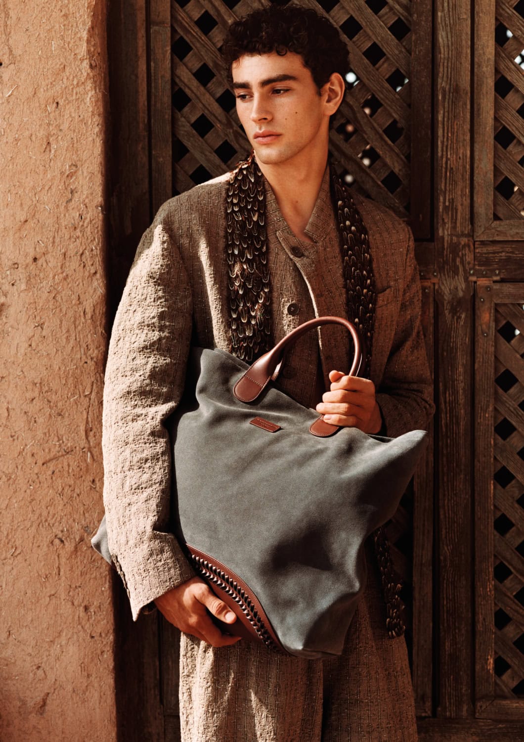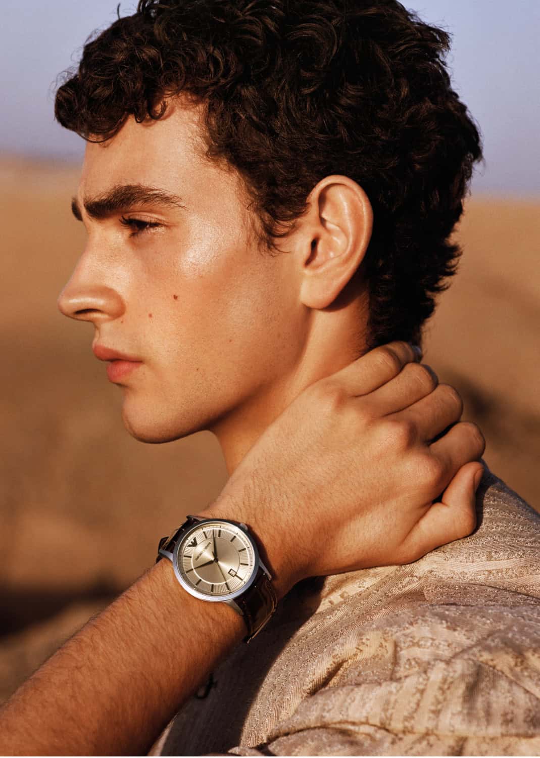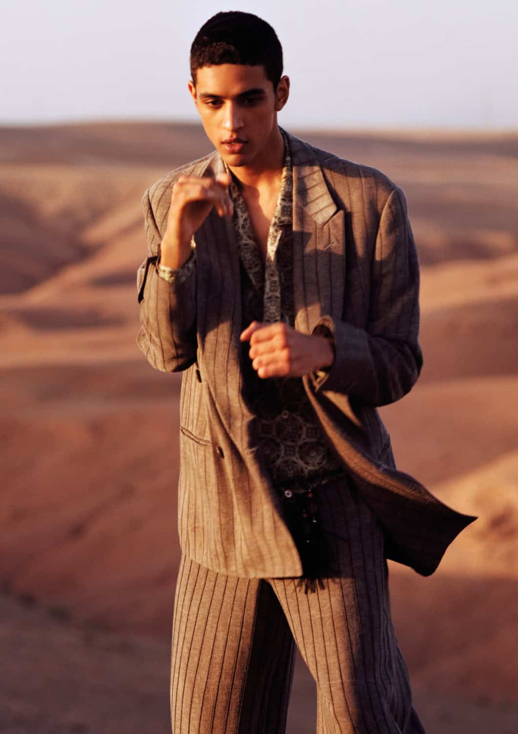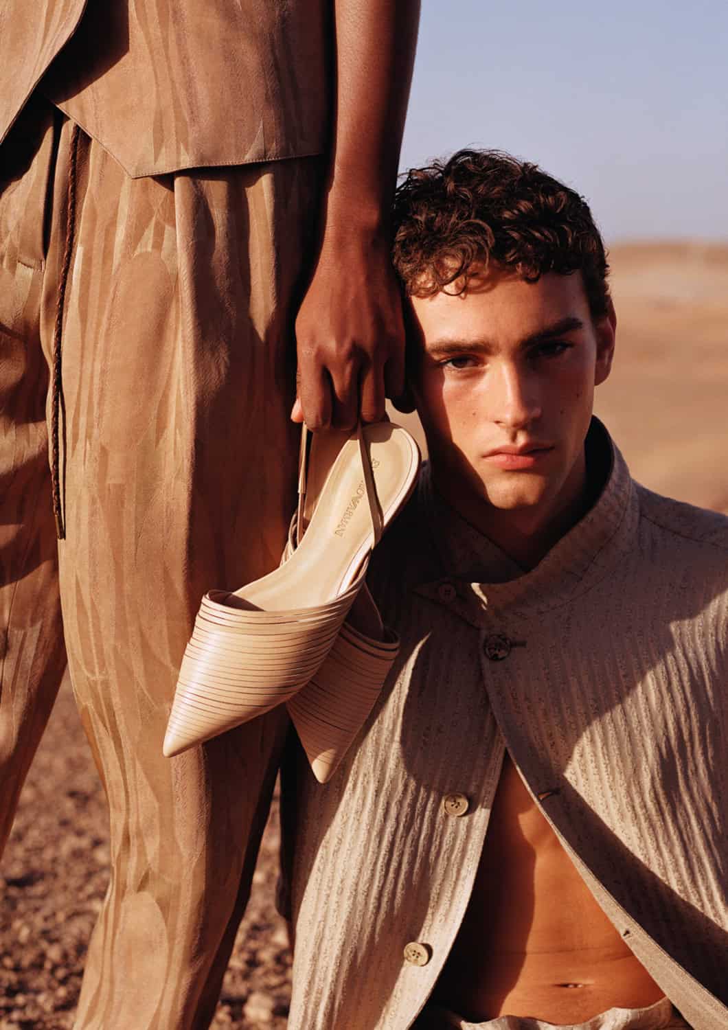 Shot by Alasdair McLellan, Emporio Armani’s SS26 campaign unfolds beneath the sun-bleached tones of desert landscapes and Moroccan-inspired architecture. Warm light washes over terracotta walls, carved archways and open courtyards, casting long shadows that shift throughout the day.