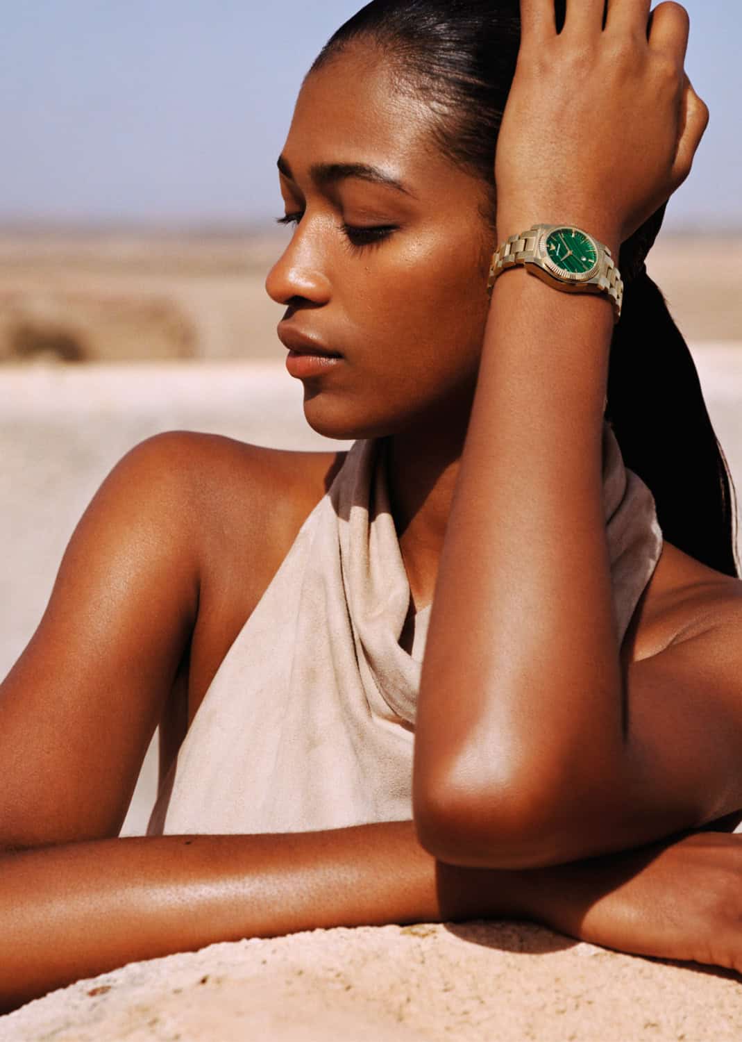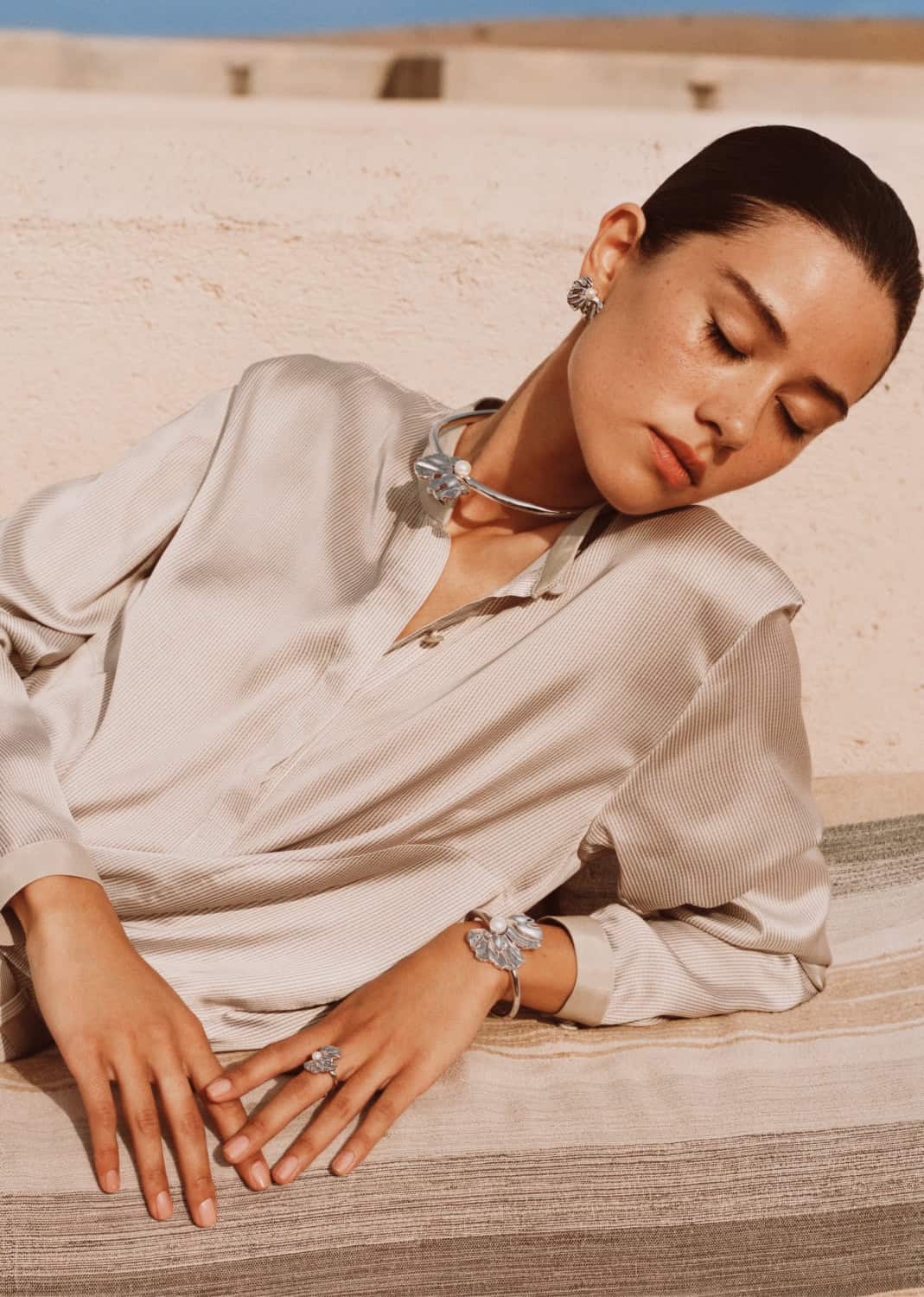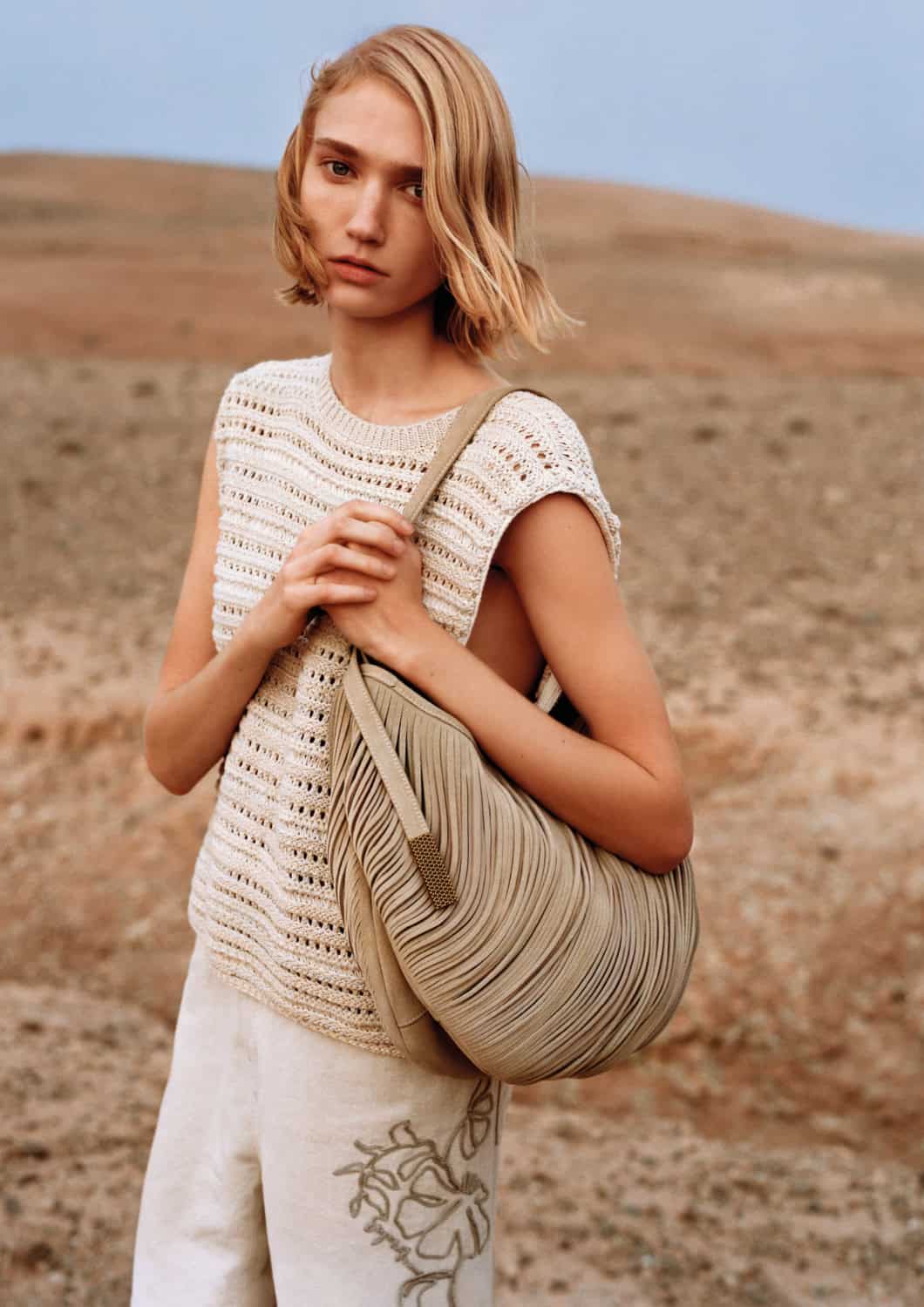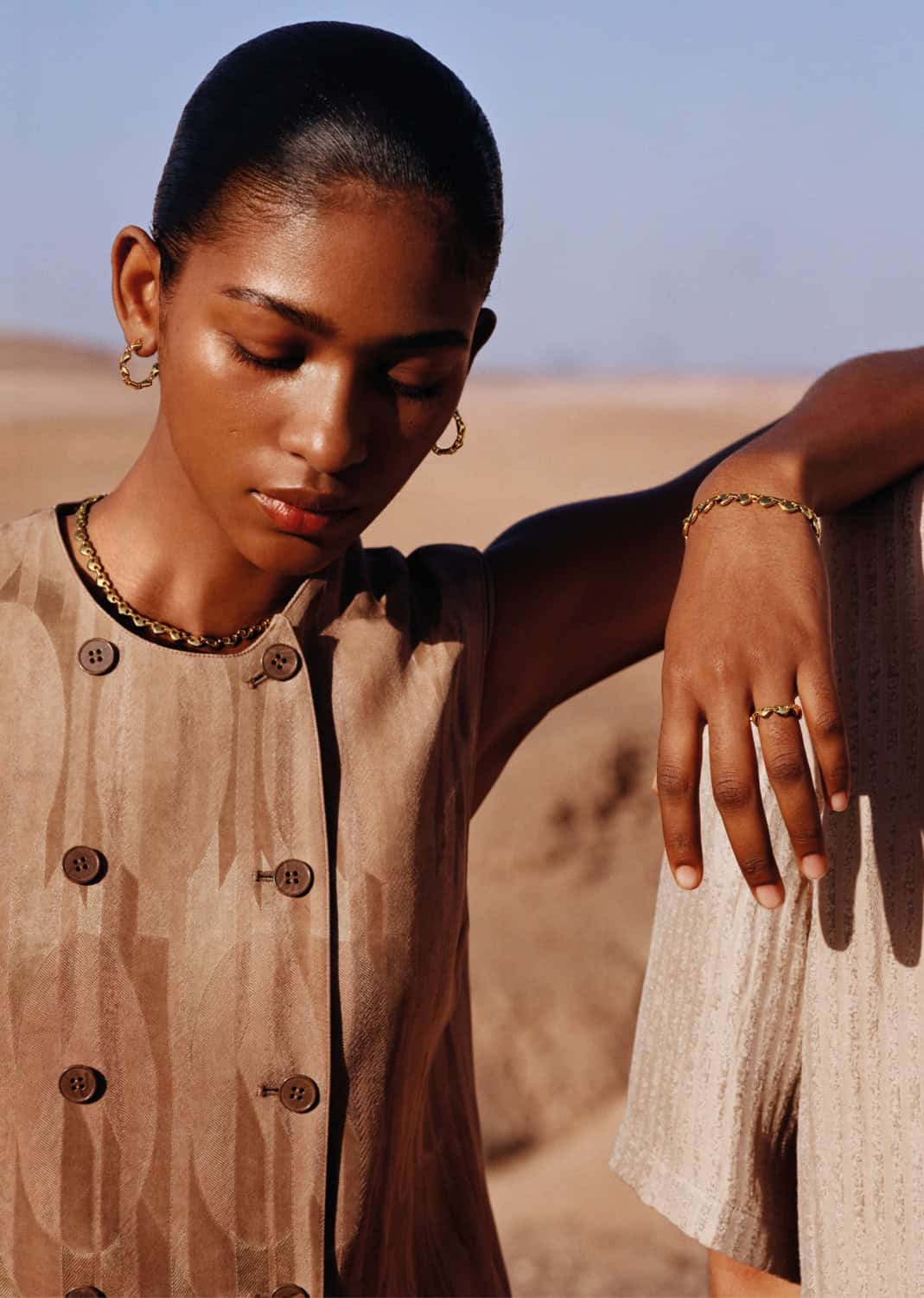 Romain Wygas’ accompanying film extends the mood, following close gestures and shared glances as wind tangles hair and hems. The result is immersive and elemental – a portrait of connection shaped by salt air, light and open space. EP