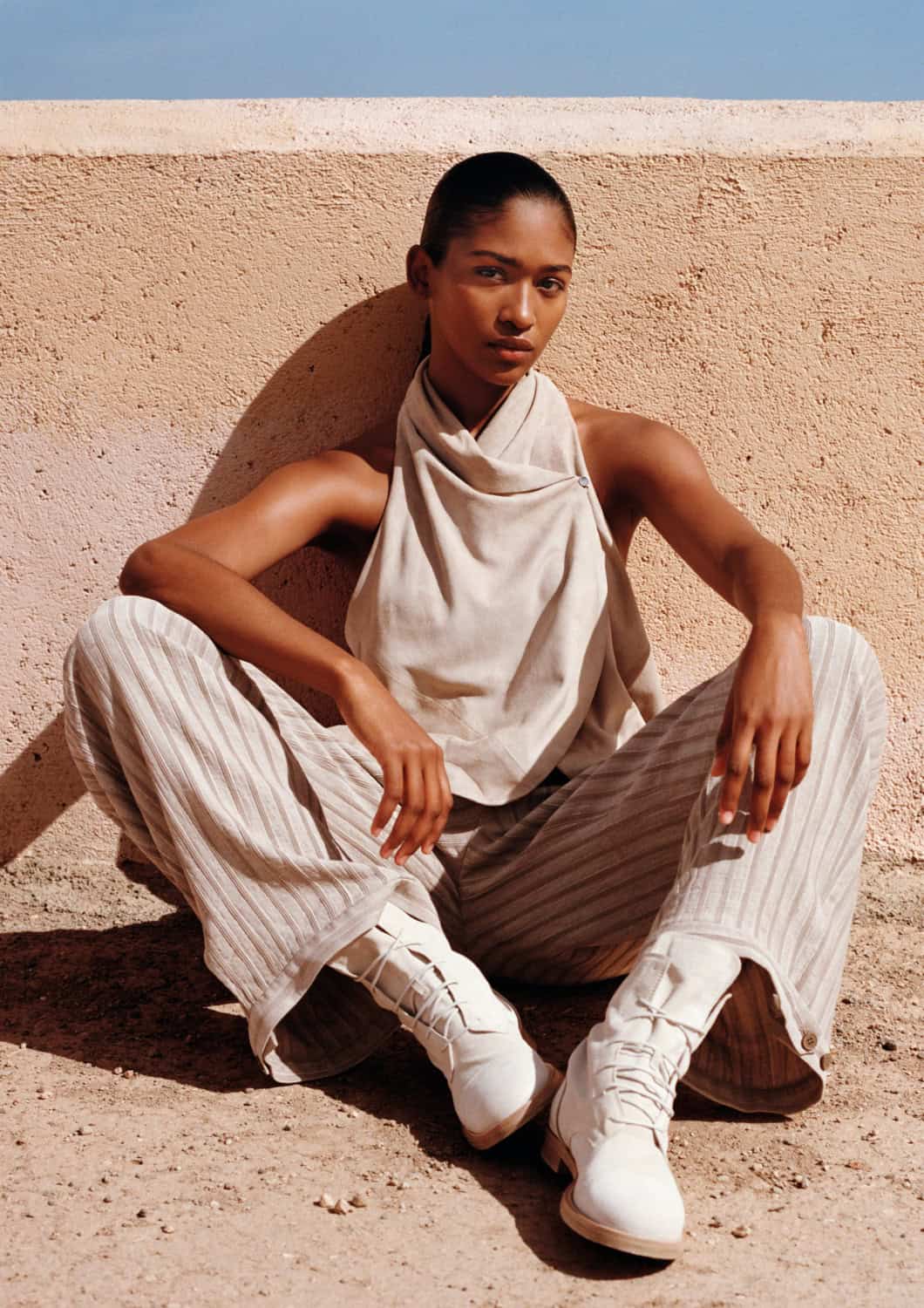 Models Tess Breeden, Mahalia Celeste, Shivaruby Premkanthan, Jack Wardill, Abas Abdirazaq, Suyong Jung and Prince Goliath move through the spaces with an effortless ease – leaning against sun-warmed walls, crossing tiled courtyards or pausing beneath shaded colonnades. The camera captures fabrics lifting in the breeze, revealing the softness and tactility of the materials against skin.