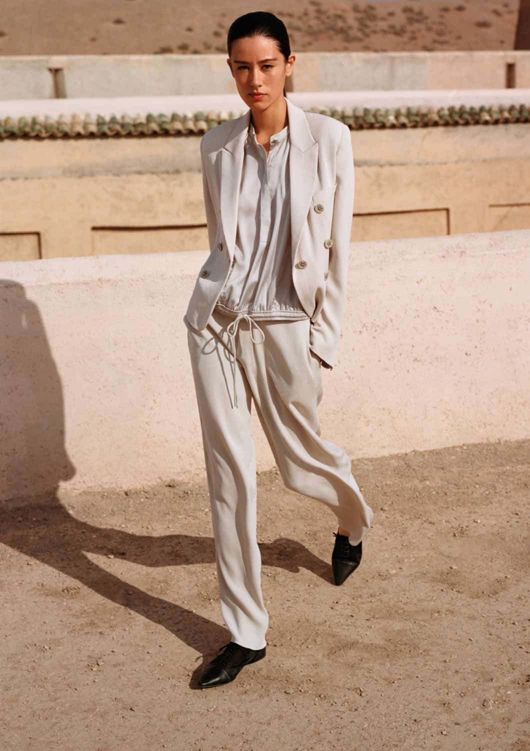 It’s a study in calibrated movement – fabric against stone, softness against structure – where clothing and architecture mirror one another in line, construction and controlled dynamism. EP