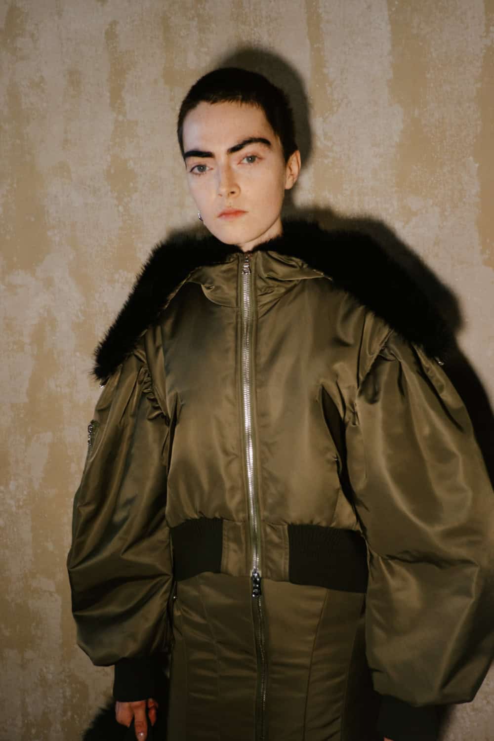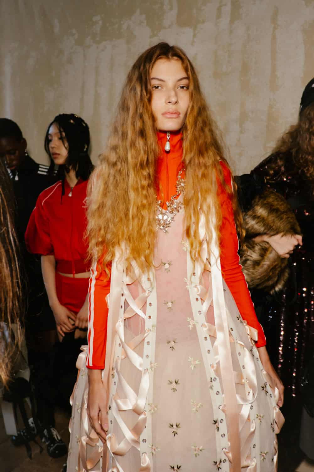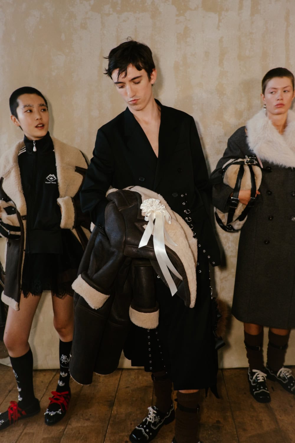 Showing her men’s, women’s and Adidas collection together in a the derelict theatre space at Alexandra Palace, the designer wanted to layer her feminine aesthetic with, “Rugged, feral elements to cut through the beauty.”