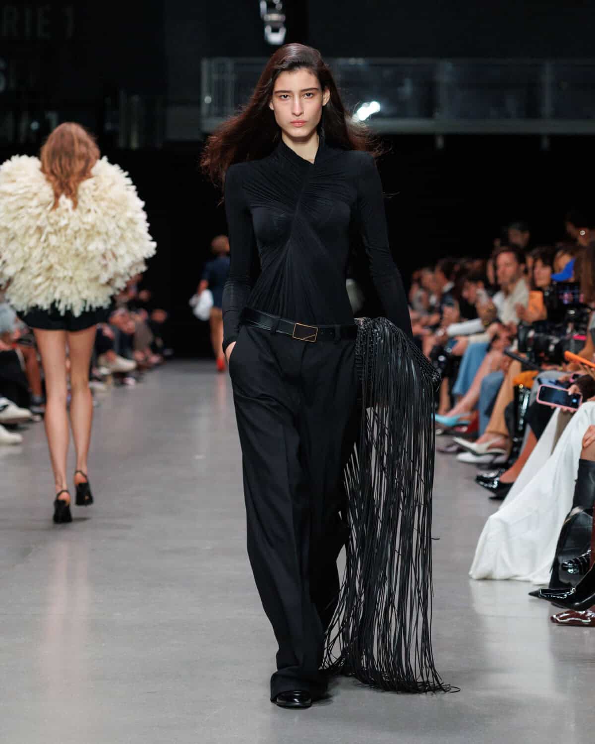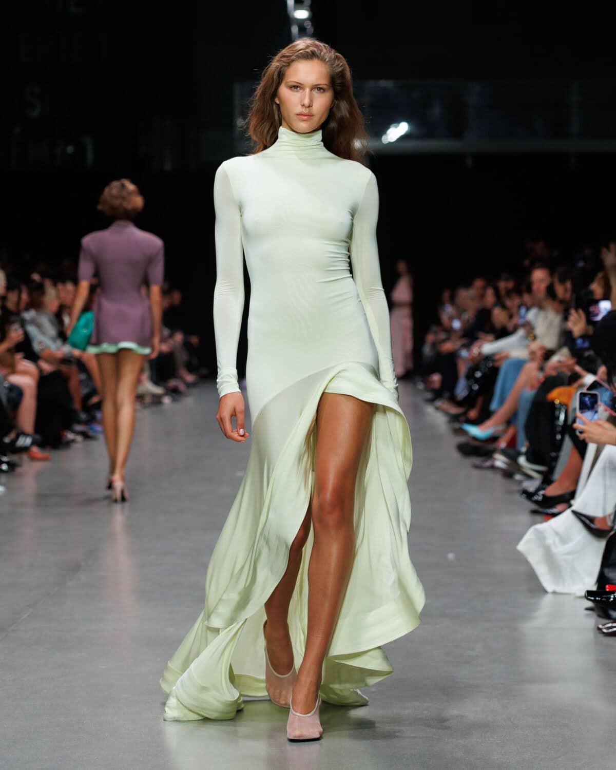 The closing looks – a triptych of faux feather looks, a sand-hued micro-mini dress, a fuchsia bodysuit and a lavender maxi dress worn by model-of-the-moment Alex Consani – served up another sustainability first. Those faux feathers were actually Fevvers, a plant-based alternative to the avian material.