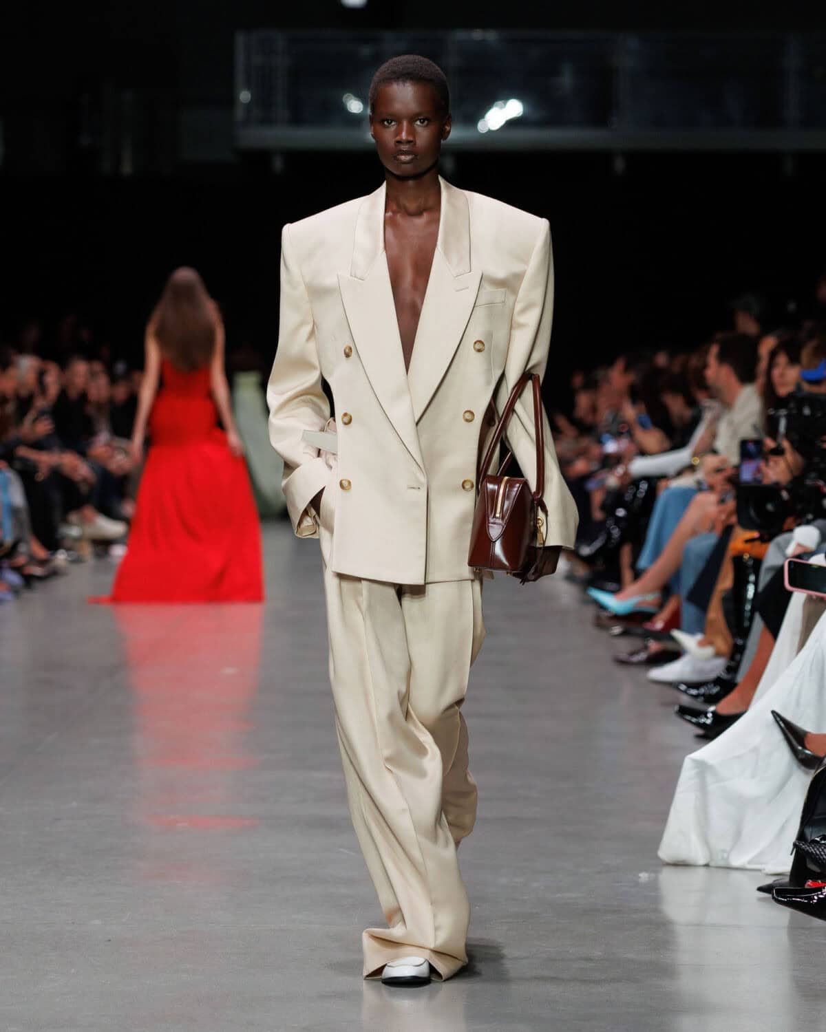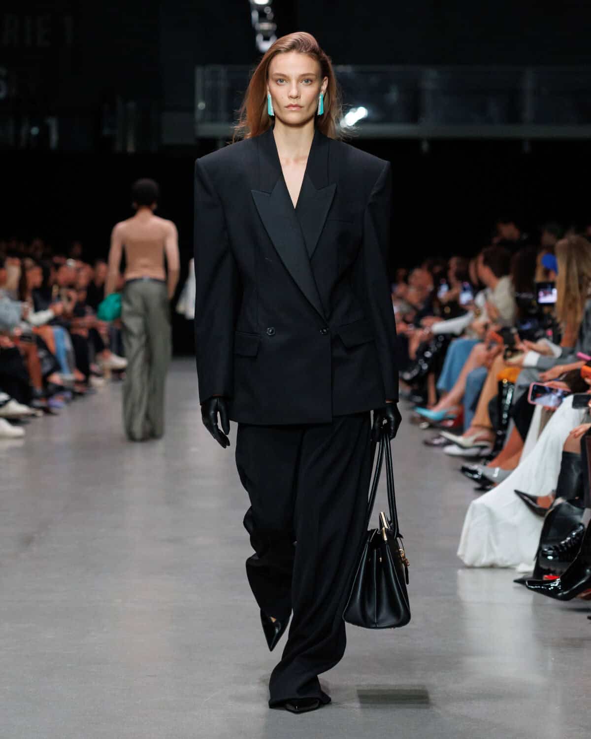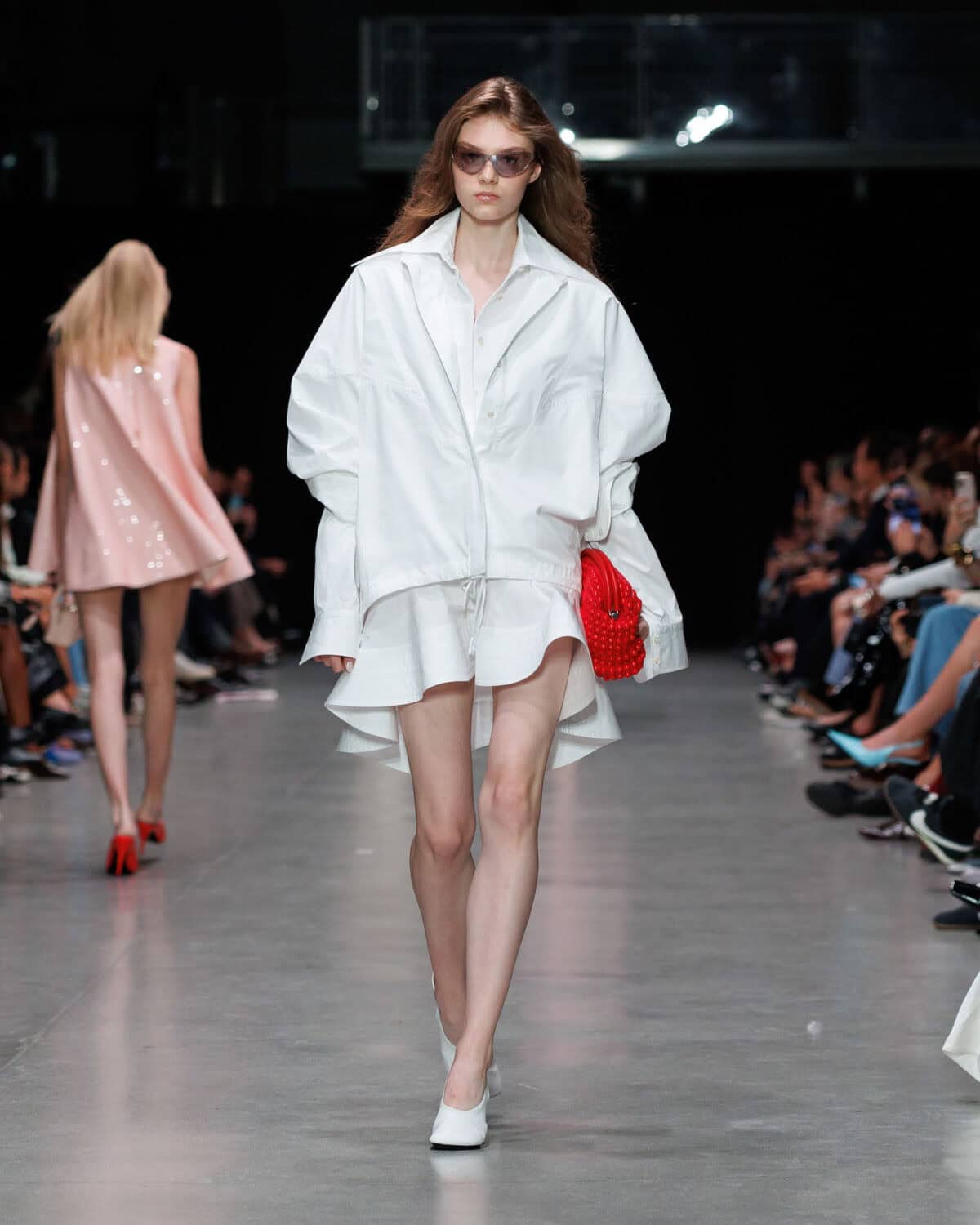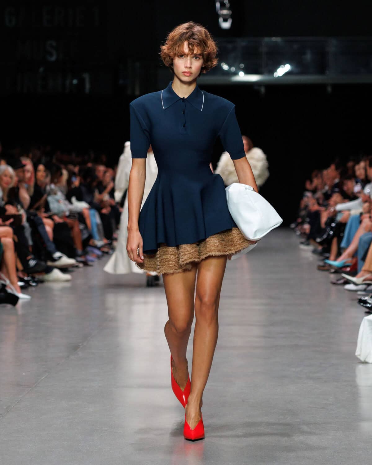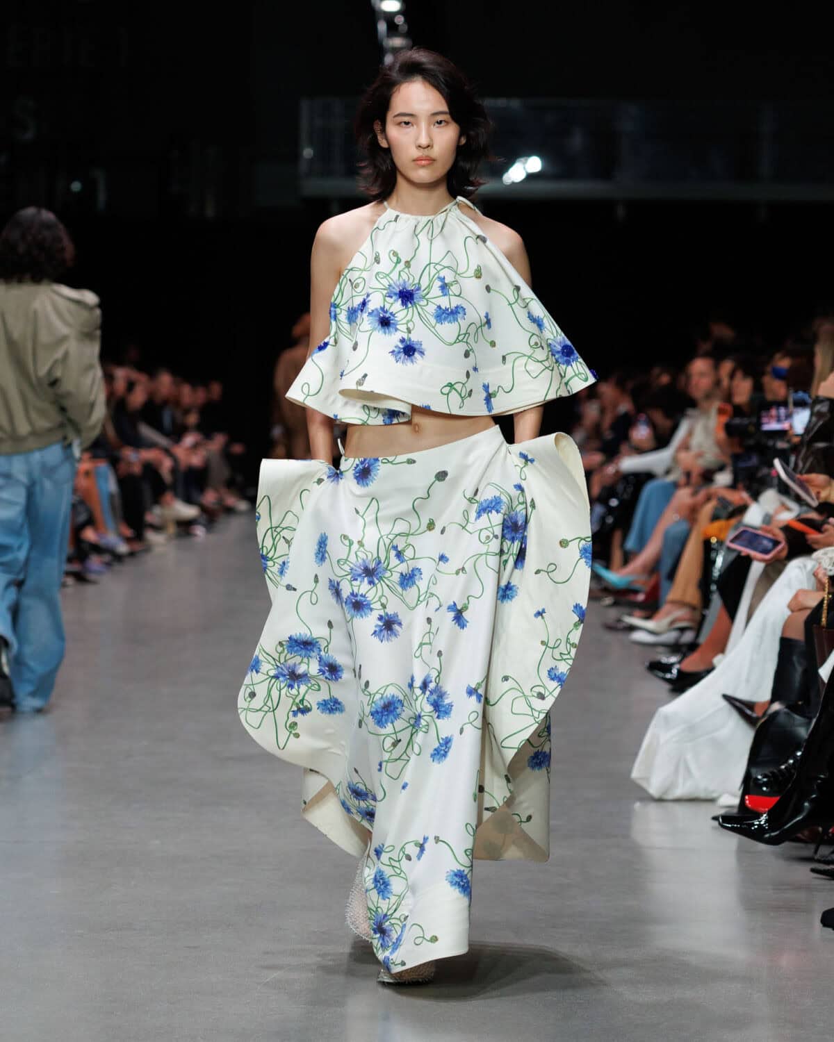 Presented at Centre Pompidou, the show opened with a poignant narration by Oscar award-winning actor Helen Mirren who read out the lyrics to The BeatlesCome Together as though it were a manifesto for the future; and in a lot of ways, it was. A manifesto to coexist, the collection centred around, as it always does, sustainability. Materials were 98 per cent conscious and 100 per cent cruelty free, shaped into utilitarian cargo minis with airy crinoline hems and Savile Row tailoring – double-breasted jackets cut at the sides, wide-leg trousers and sporty ‘80s-inspired shirting layered with bombers and knits. Upcycled denim waistbands collaged into jeans, bags and shoes grounded the collection, while sequins shimmered across shirting and Falabella clutches.