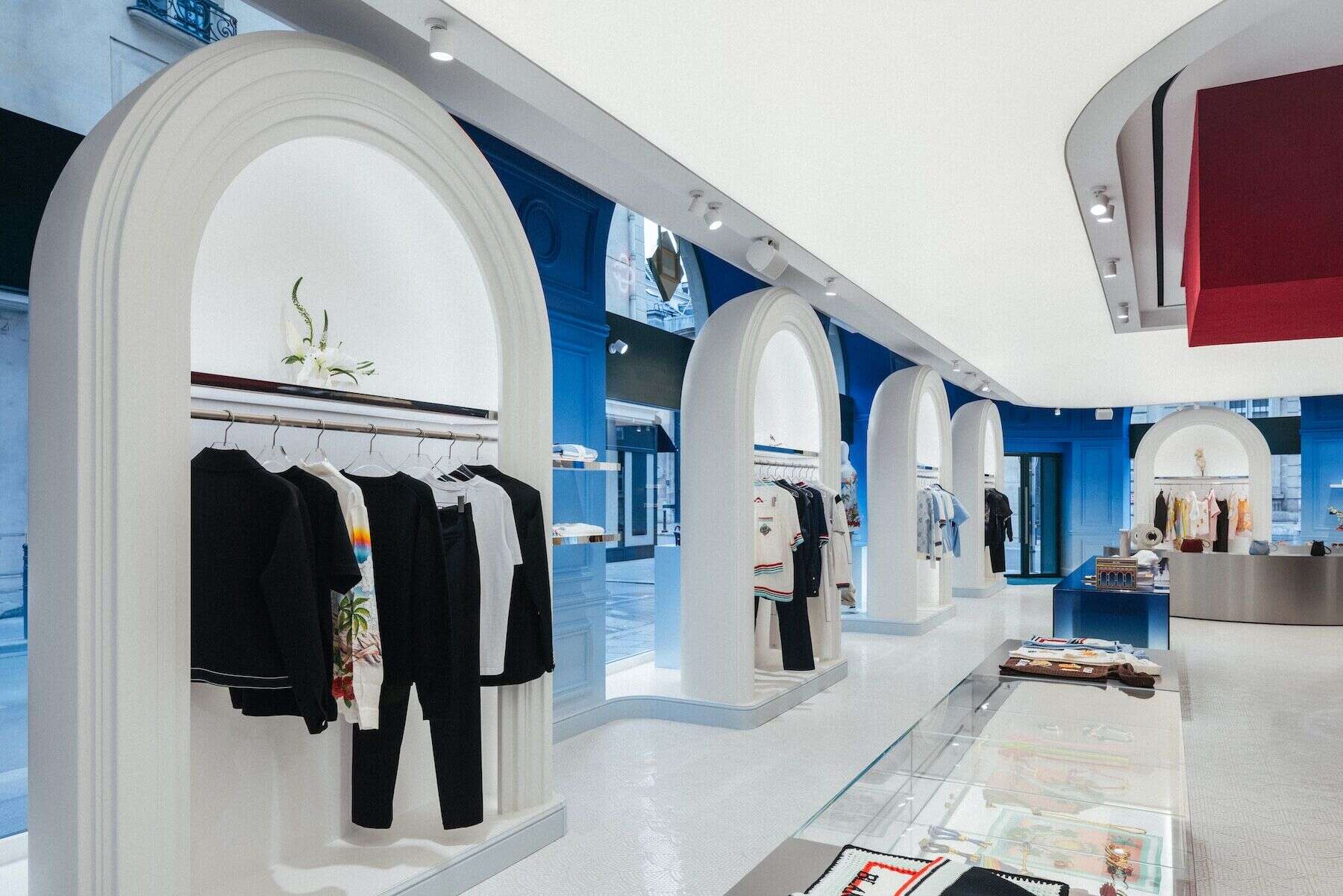 Casablanca has officially arrived on the Paris retail scene with a knockout debut flagship on the legendary Rue du Faubourg Saint-Honoré. Tucked into a coveted corner in the 8th arrondissement – where the fashion elite reside – the three-level space is as cinematic and bold as the brand itself. Designed by founder Charaf Tajer alongside art director Steve Grimes, the store is a masterclass in old-world elegance and futuristic flair. Think marble mosaics inspired by ancient Greece, velvet-lined deconstructed tennis courts, Kubrick-esque lightboxes and arched Parisian niches interrupted by vibrant colour gradients. It’s Casablanca’s sport-meets-sophistication aesthetic made tangible.